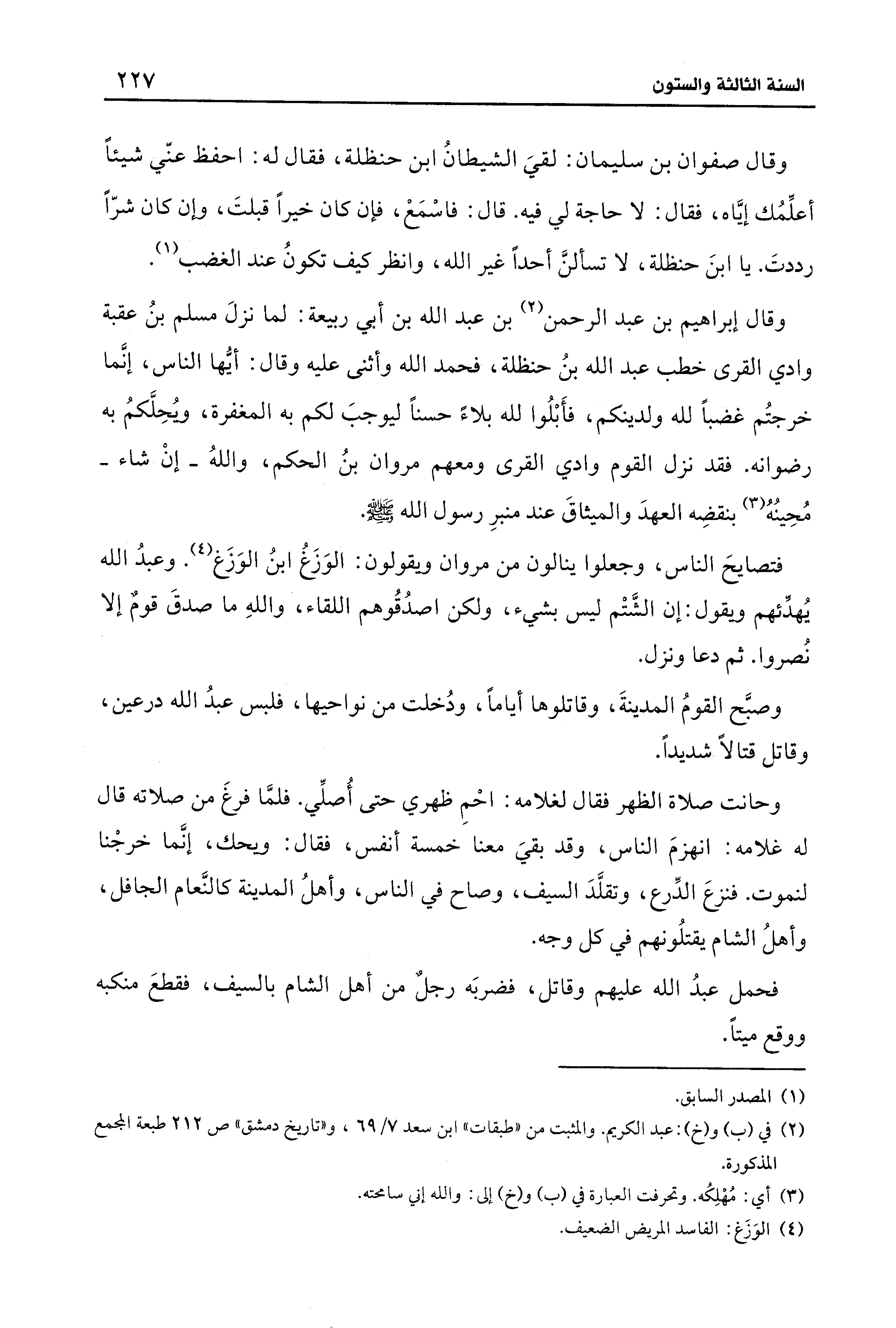 وقال إبراهيم بن عبد الرحمن (¬2) بن عبد الله بن أبي ربيعة: لما نزلَ مسلم بنُ عقبة وادي القرى خطب عبد الله بنُ حنظلة، فحمد الله وأثنى عليه وقال: أيُّها الناس، إنَّما خرجتُم غضبًا لله ولدينكم، فأَبْلُوا لله بلاءً حسنًا ليوجبَ لكم به المغفرة، ويُحِلَّكمُ به رضوانه. فقد نزل القوم وادي القرى ومعهم مروان بنُ الحكم، واللهُ -إنْ شاء- مُحِينُهُ (¬3) بنقضِه العهدَ والميثاقَ عند منبرِ رسول الله - صلى الله عليه وسلم -.