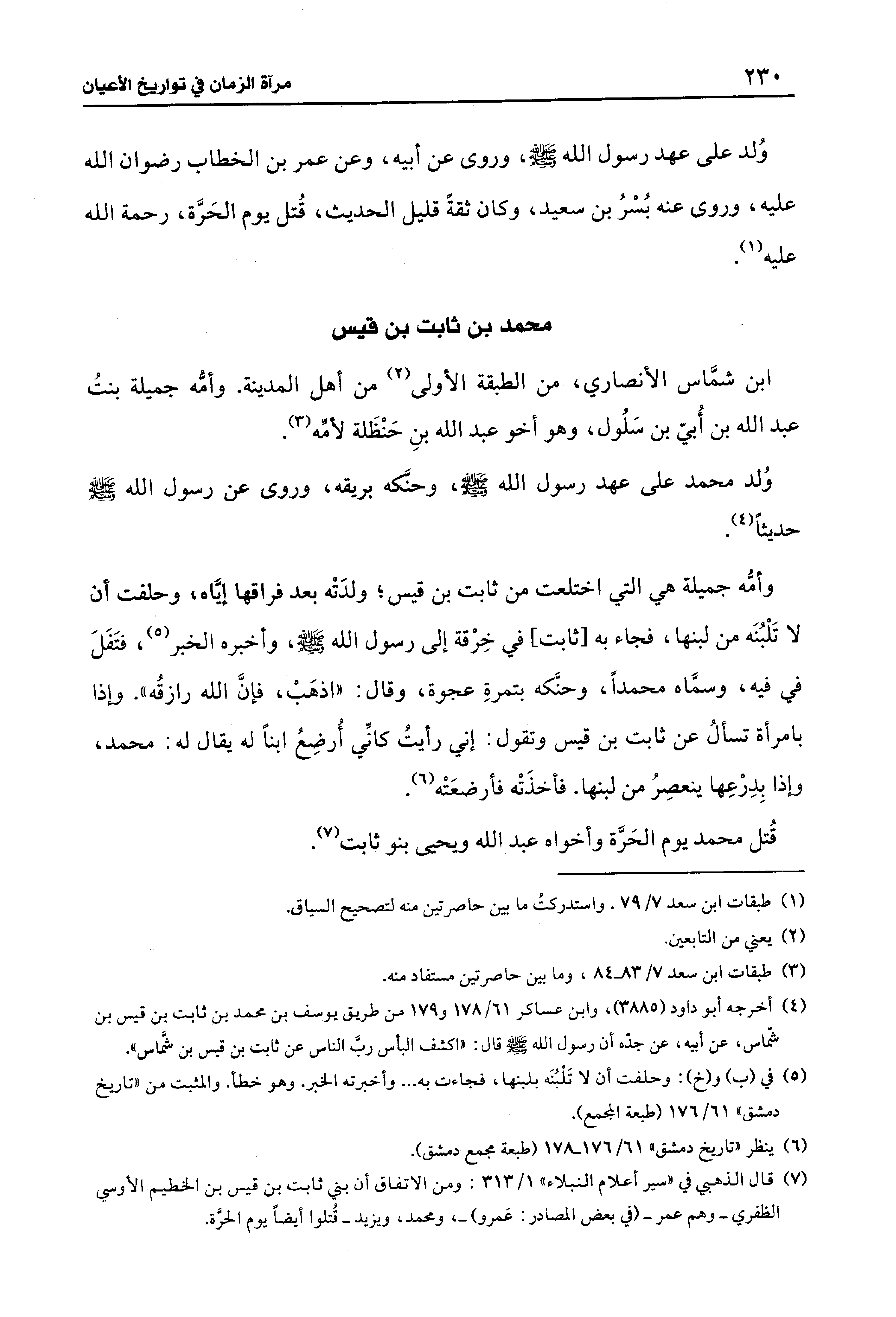 (¬7) قال الذهبي في "سير أعلام النبلاء" 1/ 313: ومن الاتفاق أن بني ثابت بن قيس بن الخطيم الأوسي في الظفري -وهم عمر- (في بعض المصادر: عَمرو) -، ومحمد، ويزيد- قُتلوا أيضًا يوم الحرَّة.