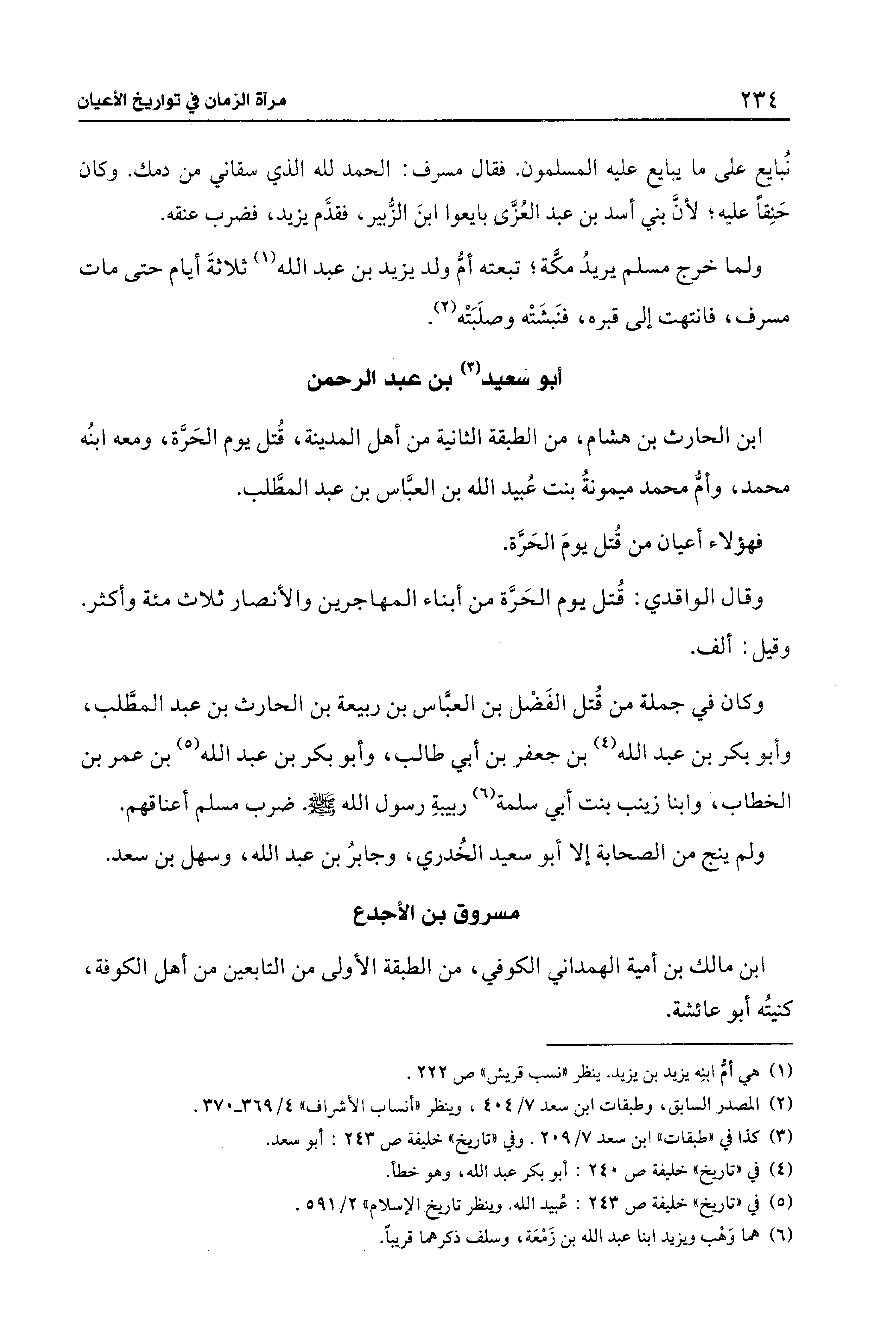 نُبايع على ما يبايع عليه المسلمون. فقال مسرف: الحمد لله الذي سقاني من دمك. وكان حَنِقًا عليه؛ لأنَّ بني أسد بن عبد العُزَّى بايعوا ابنَ الزُّبير، فقدَّم يزيد، فضرب عنقه.