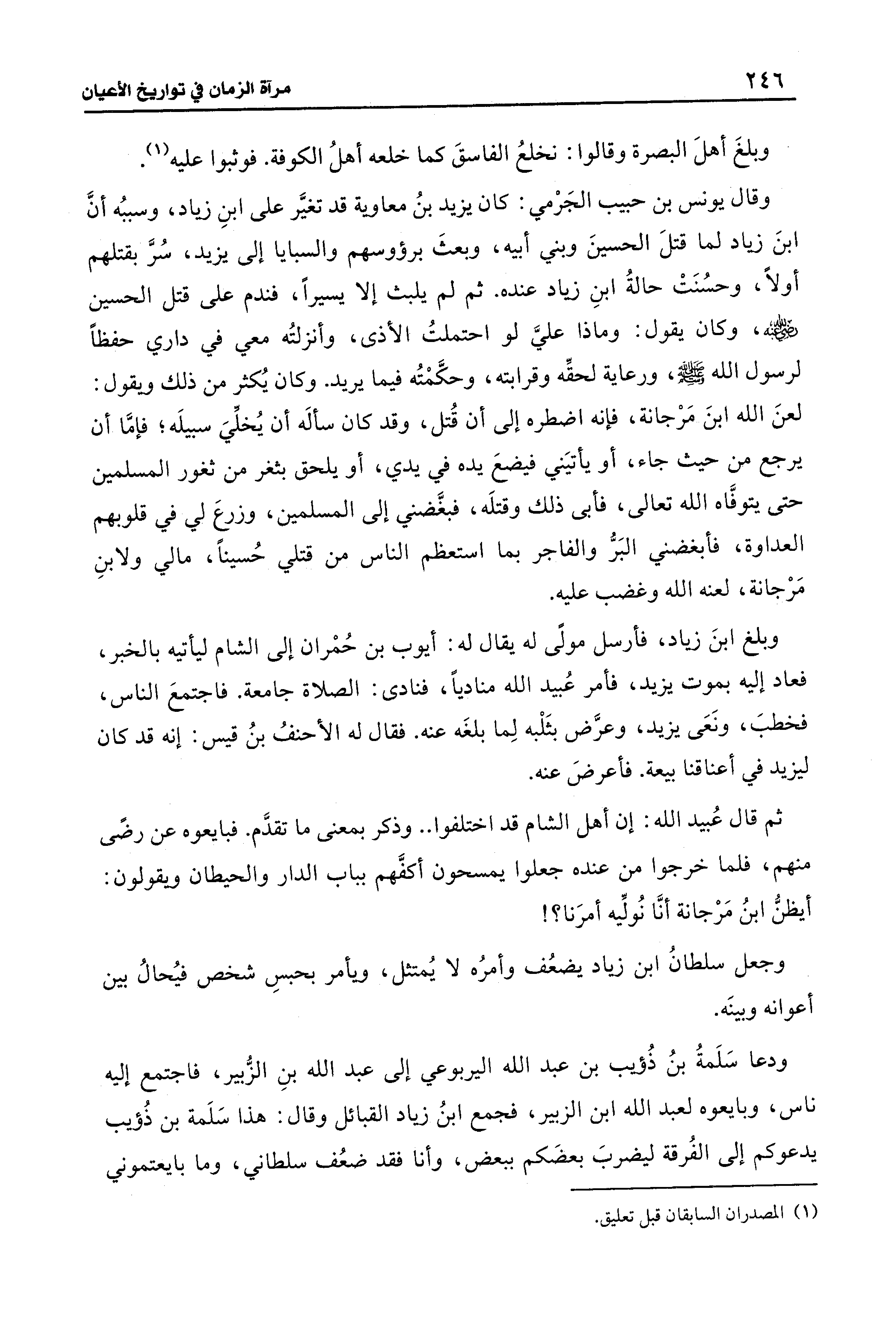 وبلغ ابنَ زياد، فأرسل مولًى له يقال له: أيوب بن حُمْران إلى الشام ليأتيه بالخبر، فعاد إليه بموت يزيد، فأمر عُبيد الله مناديًا، فنادى: الصلاة جامعة. فاجتمعَ الناس، فخطبَ، ونَعَى يزيد، وعرَّض بثَلْبه لِما بلغَه عنه. فقال له الأحنفُ بنُ قيس: إنه قد كان ليزيد في أعناقنا بيعة. فأعرضَ عنه.