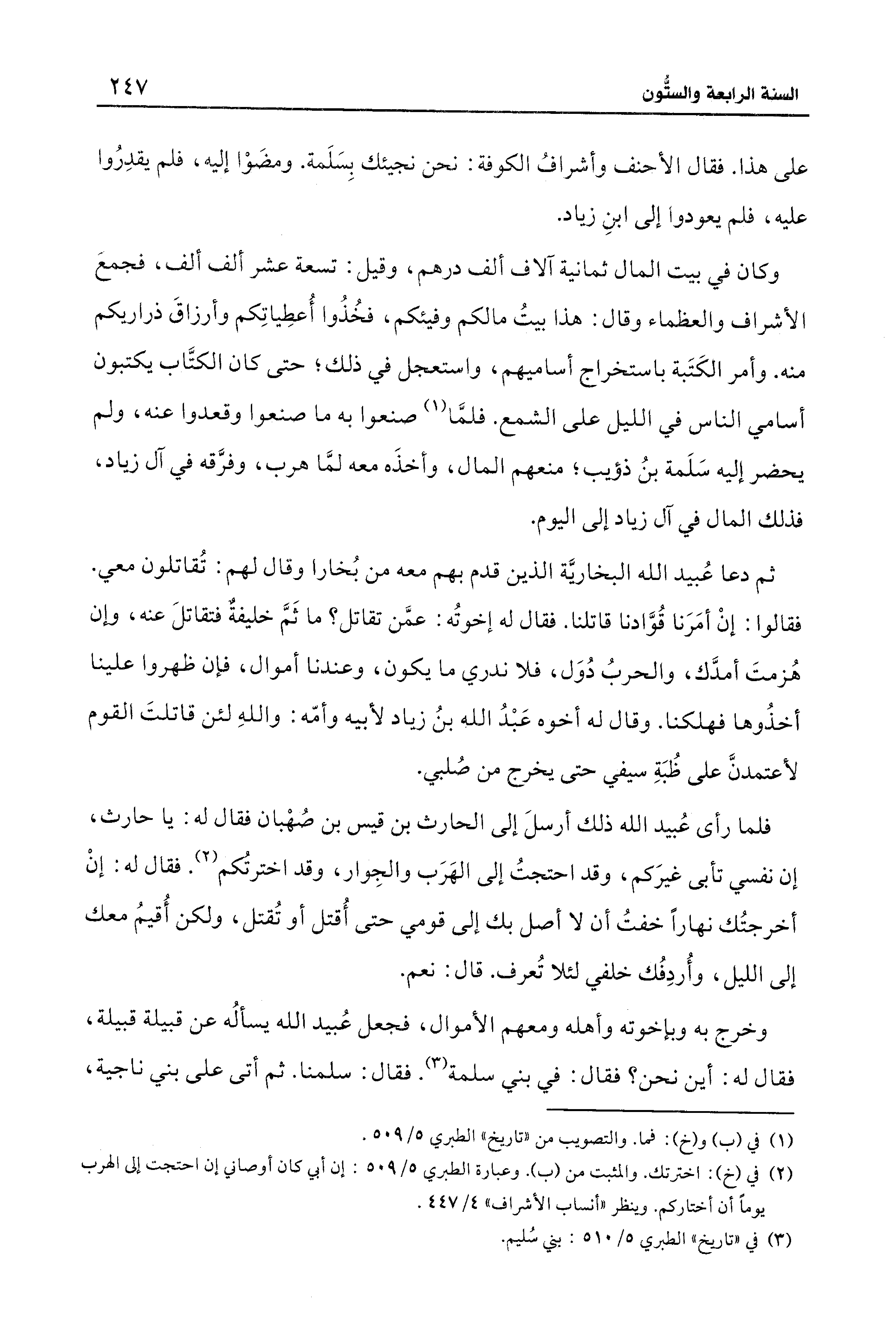 وكان في بيت المال ثمانية آلاف ألف درهم، وقيلَ: تسعة عشر ألف ألف, فجمعَ الأشراف والعظماء وقال: هذا بيتُ مالكم وفيئكم، فخُذوا أُعطِياتِكم وأرزاقَ ذراريكم منه. وأمر الكَتَبة باستخراج أساميهم، واستعجل في ذلك؛ حتى كان الكتَّاب يكتبون أسامي الناس في الليل على الشمع. فلما (¬1) صنعوا به ما صنعوا وقعدوا عنه، ولم يحضر إليه سَلَمة بنُ ذؤيب؛ منعهم المال، وأخذَه معه لمَّا هرب، وفرَّقه في آل زياد، فذلك المال في آل زياد إلى اليوم.