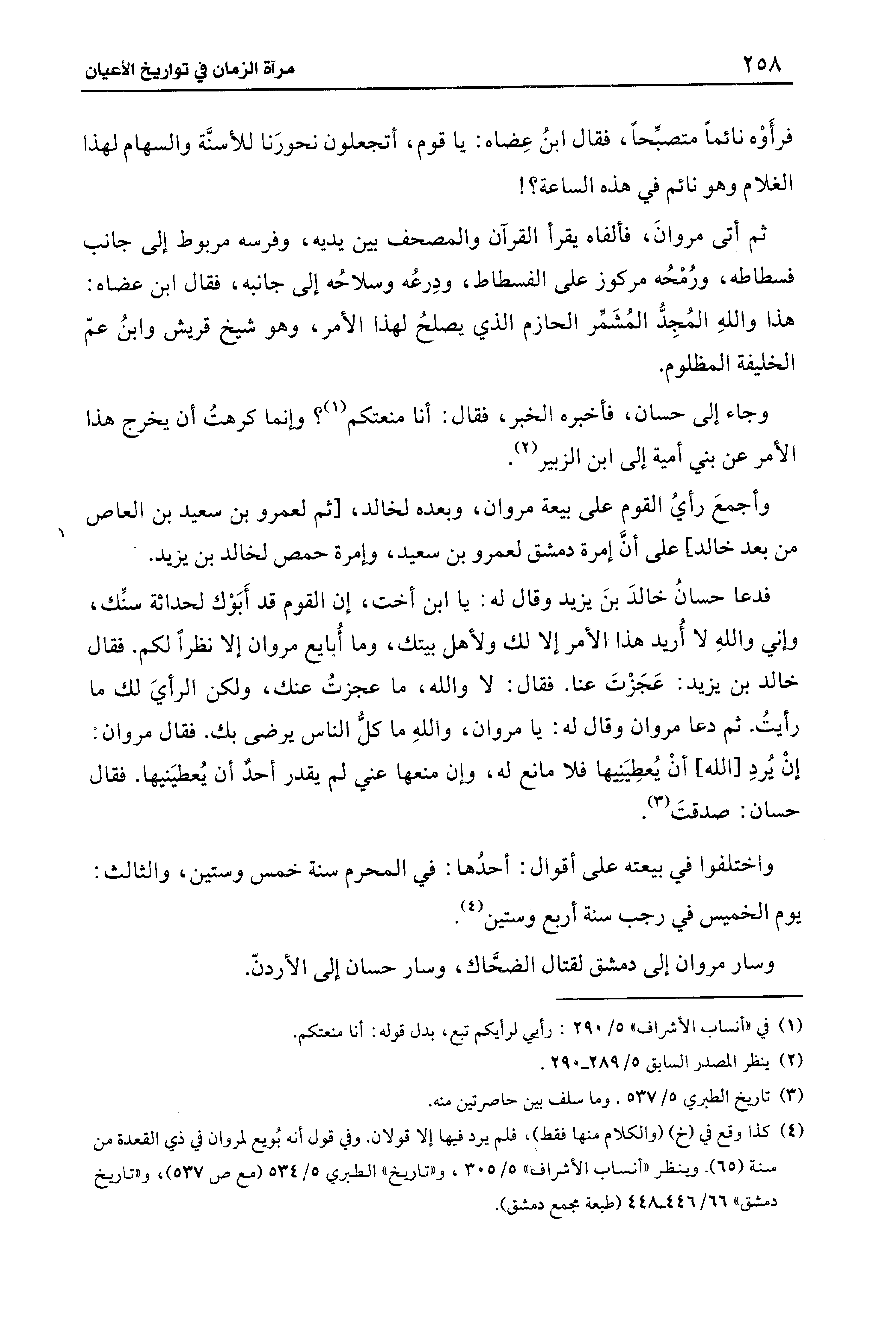 فدعا حسانُ خالدَ بنَ يزيد وقال له: يا ابن أخت، إن القوم قد أَبَوْك لحداثة سنِّك، وإني واللهِ لا أُريد هذا الأمر إلا لك ولأهل بيتك، وما أُبايع مروان إلا نظرًا لكم. فقال خالد بن يزيد: عَجَزْتَ عنا. فقال: لا والله، ما عجزتُ عنك، ولكن الرأيَ لك ما رأيتُ. ثم دعا مروان وقال له: يا مروان، واللهِ ما كلُّ الناس يرضى بك. فقال مروان: إنْ يُردِ [الله] أنْ يُعطِيَنيها فلا مانع له، وإن منعها عني لم يقدر أحدٌ أن يُعطيَنيها. فقال حسان: صدقتَ (¬3).