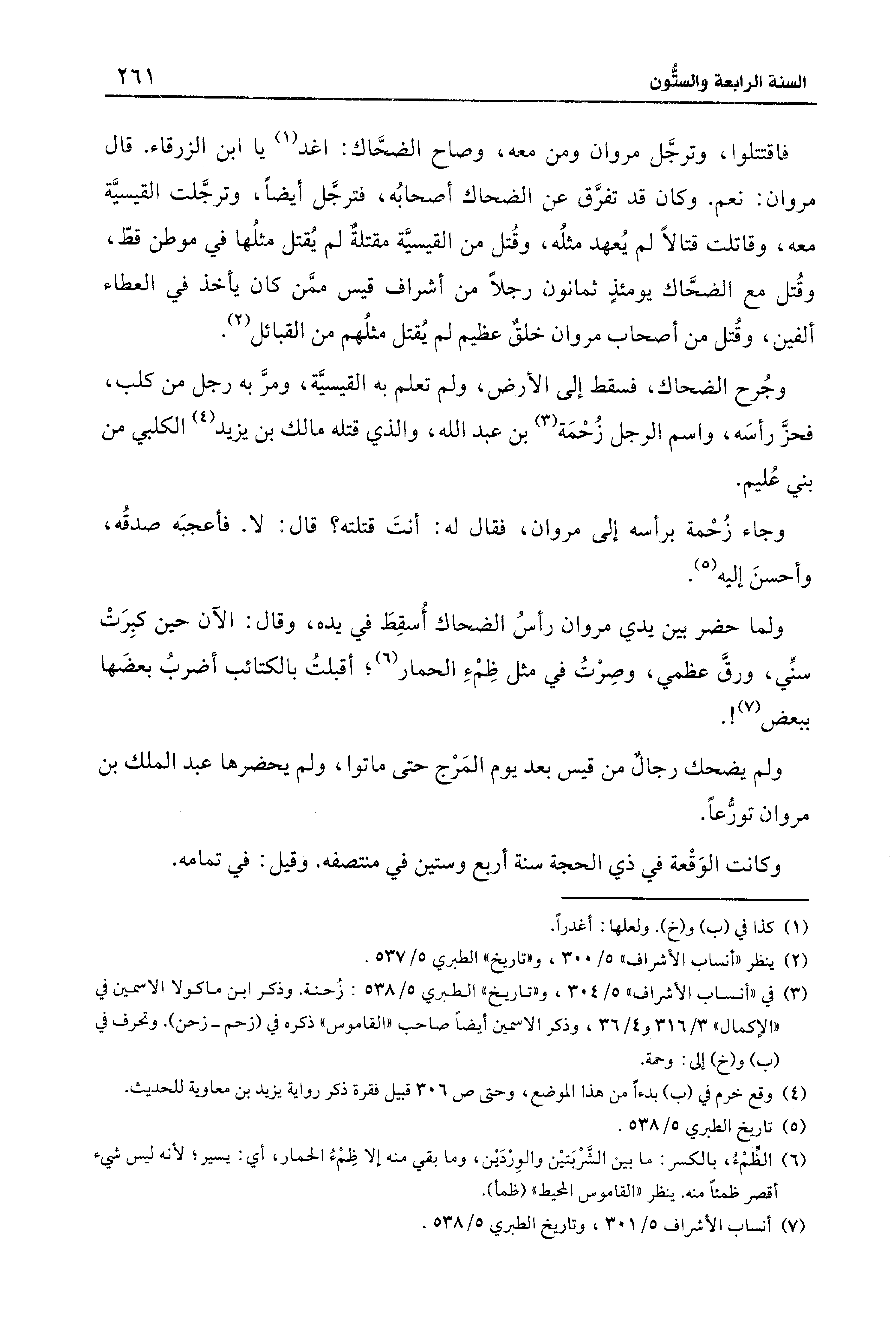 وجُرح الضحاك، فسقط إلى الأرض، ولم تعلم به القيسيَّة، ومرَّ به رجل من كلب، فحزَّ رأسَه، واسم الرجل زُحْمَة (¬3) بن عبد الله، والذي قتله مالك بن يزيد (¬4) الكلبي من بني عُليم.