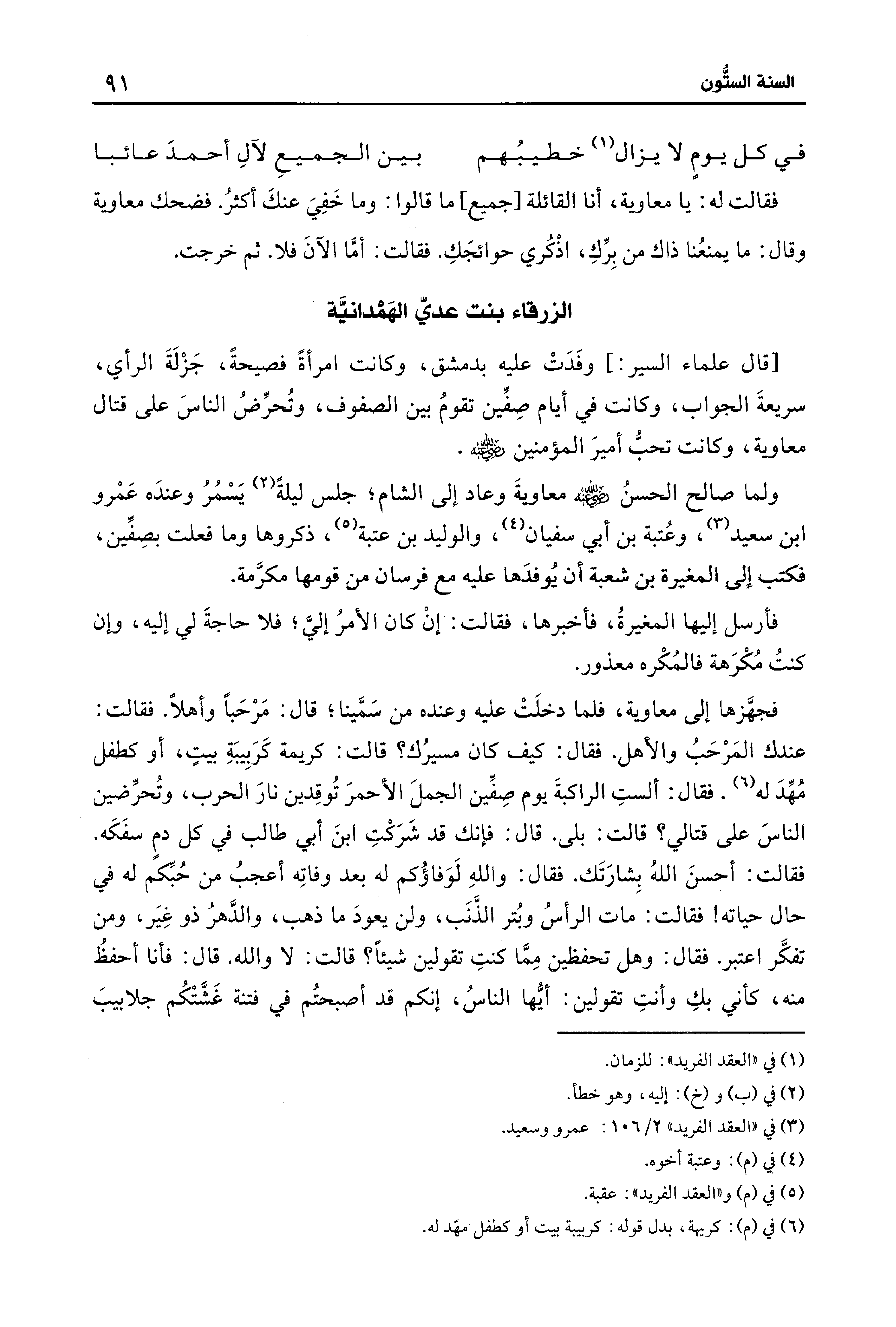 فجهَّزها إلى معاوية، فلما دخلَتْ عليه وعنده من سَمَّينا؛ قال: مَرْحَبًا وأهلًا. فقالت: عندك المَرْحَبُ والأهل. فقال: كيف كان مسيرُك؟ قالت: كريمة كَرَبِيبَةِ بيتٍ، أو كطفل مُهِّدَ له (¬6). فقال: ألستِ الراكبةَ يوم صِفَين الجملَ الأحمرَ تُوقِدين نارَ الحرب، وتُحرِّضين الناسَ على قتالي؟ قالت: بلى. قال: فإنك قد شَرَكْتِ ابنَ أبي طالب في كل دم سفَكَه. فقالت: أحسنَ اللهُ بِشارَتَك. فقال: واللهِ لَوَفاؤُكم له بعد وفاتِه أعجبُ من حُبِّكم له في حال حياته! فقالت: مات الرأسُ وبُتر الذَّنَب، ولن يعودَ ما ذهب، والدَّهرُ ذو غِيَر، ومن تفكَّر اعتبر. فقال: وهل تحفظين مِمَّا كنتِ تقولين شيئًا؟ قالت: لا والله. قال: فأنا أحفظُ منه، كأني بكِ وأنتِ تقولين: أيُّها الناسُ، إنكم قد أصبحتُم في فتنة غَشَّتْكُم جلابيبَ