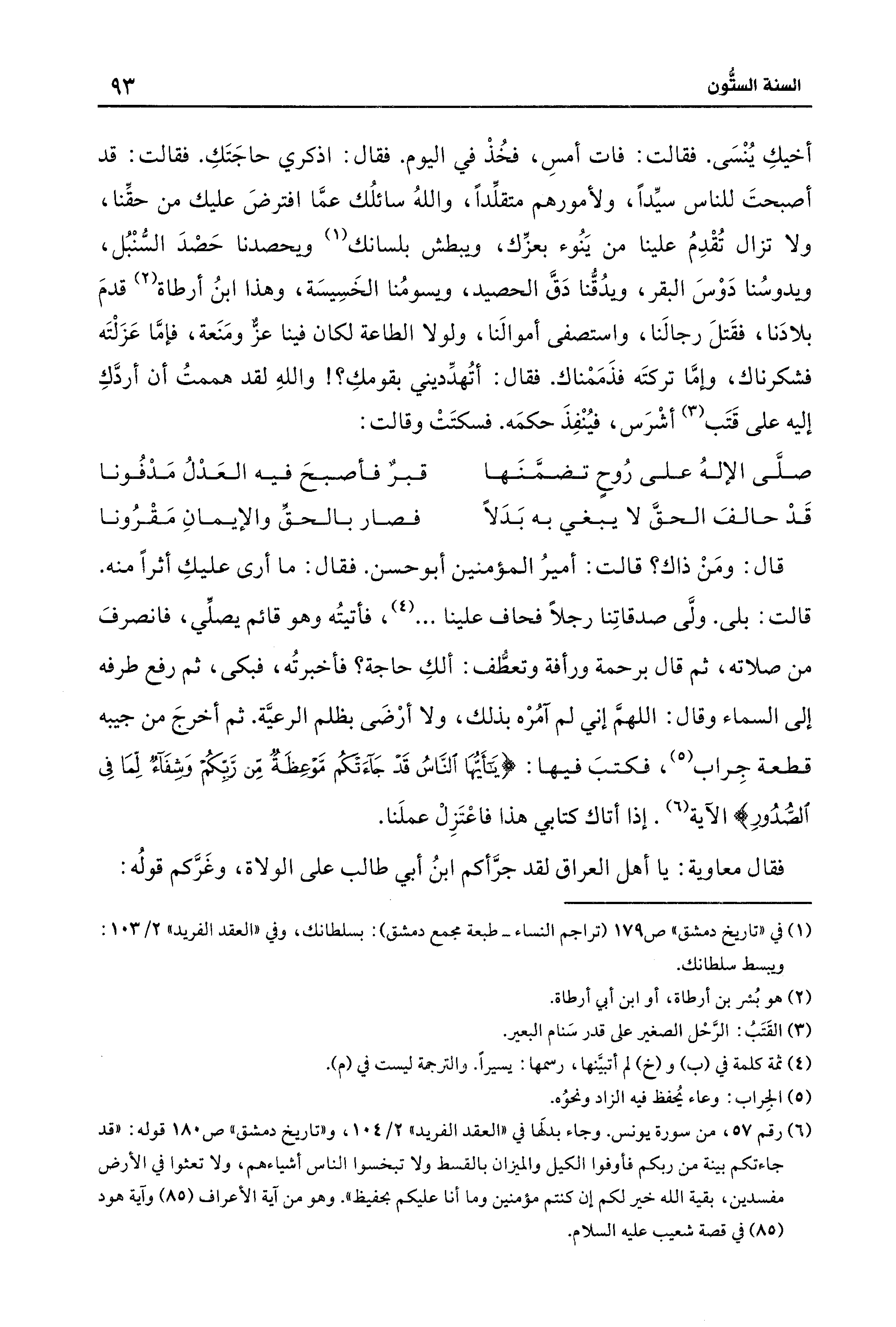 (¬6) رقم 57، من سورة يونس. وجاء بدلَها في "العقد الفريد" 2/ 104، و"تاريخ دمشق" ص 180 قوله: "قد جاءتكم بينة من ربكم فأوفوا الكيل والميزان بالقسط ولا تبخسوا الناس أشياءهم، ولا تعثوا في الأرض مفسدين، بقية الله خير لكم إن كنتم مؤمنين وما أنا عليكم بحفيظ". وهو من آية الأعراف (85) وآية هود (85) في قصة شعيب - عليه السلام -.