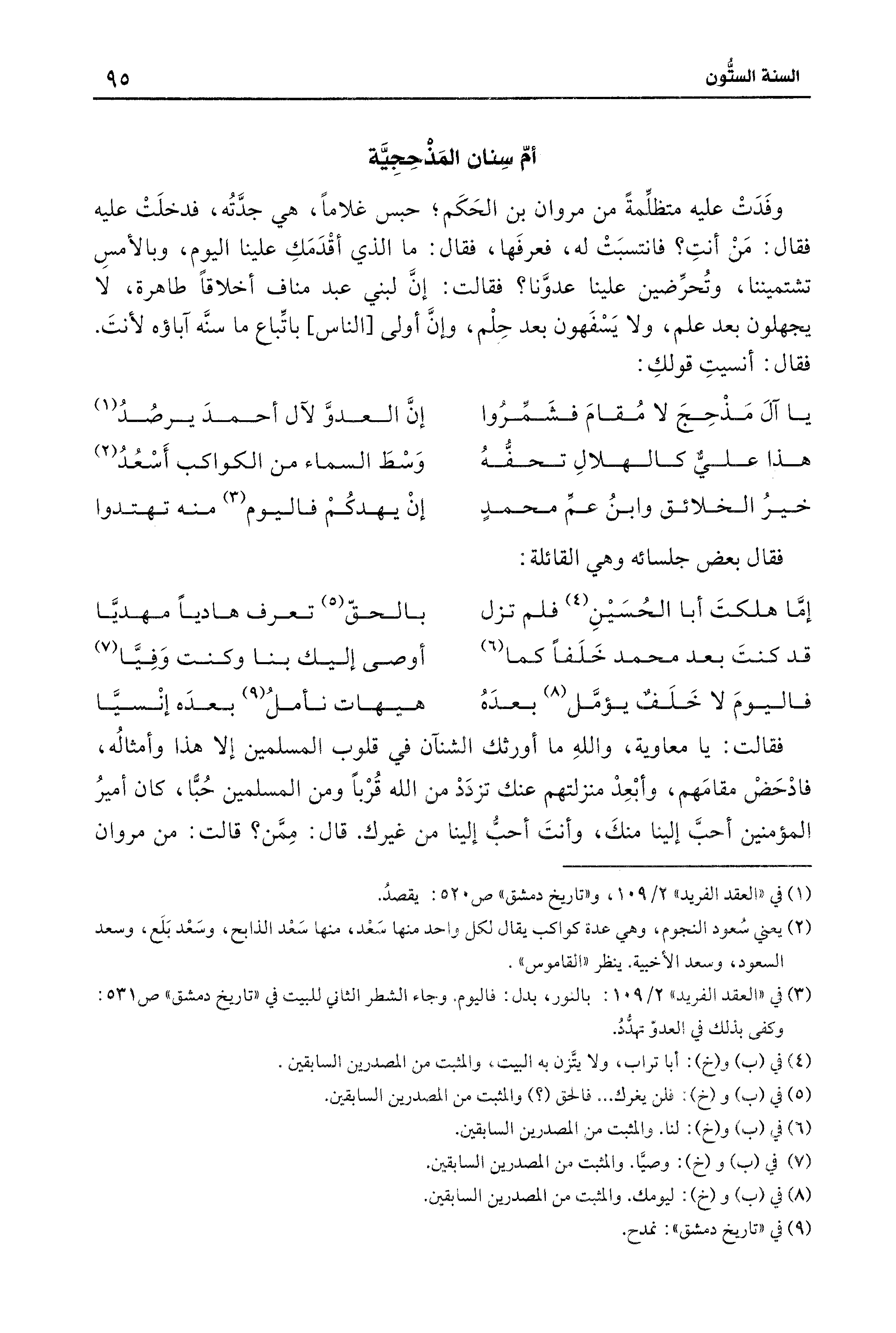 فقالت: يا معاوية، واللهِ ما أورثك الشنآن في قلوب المسلمين إلا هذا وأمثالُه، فادْحَضْ مقامَهم، وأبْعِدْ منزلتهم عنك تزدَدْ من الله قُرْبًا ومن المسلمين حُبًّا، كان أَميرُ المؤمنين أحبَّ إلينا منكَ، وأنْتَ أحبُّ إلينا من غيرك. قال: مِمَّنْ؟ قالت: من مروان