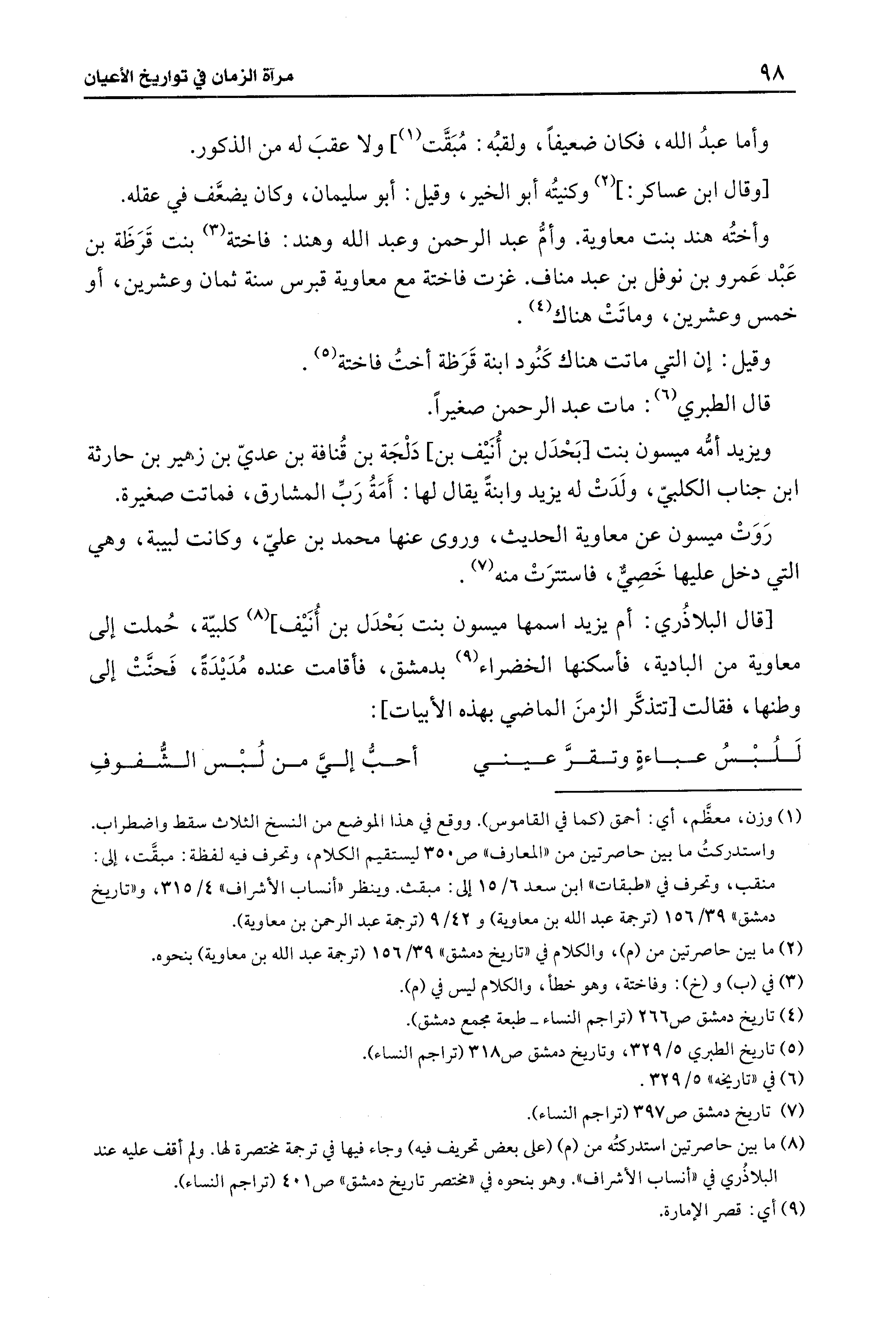 (¬8) ما بين حاصرتين استدركتُه من (م) (على بعض تحريف فيه) وجاء فيها في ترجمة مختصرة لها. ولم أقف عليه عند البلاذُري في "أنساب الأشراف". وهو بنحوه في "مختصر تاريخ دمشق" ص 401 (تراجم النساء).