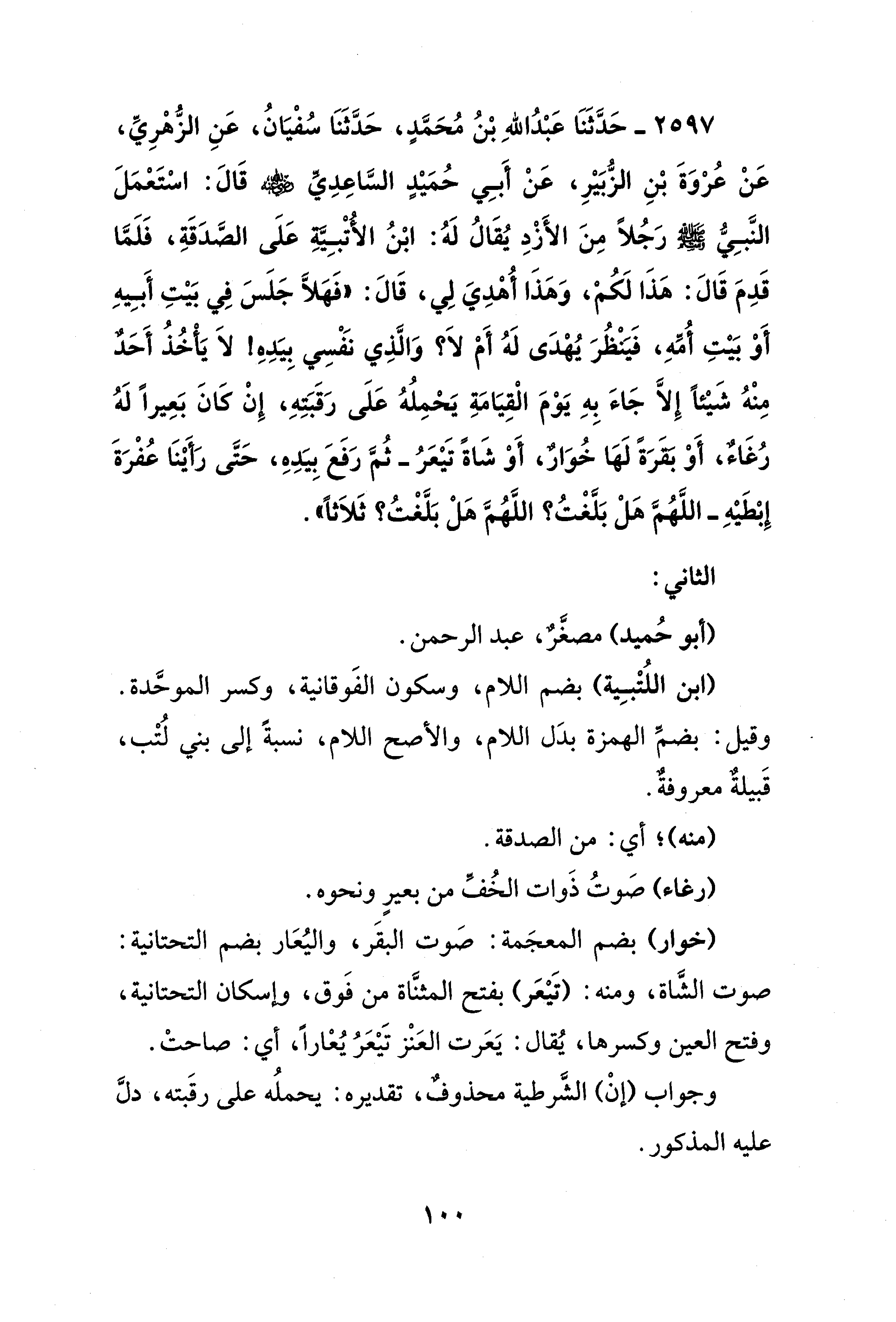2597 - حَدَّثَنَا عَبْدُ اللهِ بْنُ مُحَمَّدٍ، حَدَّثَنَا سُفْيَانُ، عَنِ الزُّهْرِيِّ، عَنْ عُرْوَةَ بْنِ الزُّبَيْرِ، عَنْ أَبِي حُمَيْدٍ السَّاعِدِيِّ - رضي الله عنه - قَالَ: اسْتَعْمَلَ النَّبِيُّ - صلى الله عليه وسلم - رَجُلًا مِنَ الأَزْدِ يُقَالُ لَهُ: ابْنُ الأُتْبِيَّةِ عَلَى الصَّدَقَةِ، فَلَمَّا قَدِمَ قَالَ: هَذَا لَكُمْ، وَهَذَا أُهْدِيَ لِي، قَالَ: "فَهَلَّا جَلَس فِي بَيْتِ أَبِيهِ أَوْ بَيْتِ أُمِّهِ، فَيَنْظُرَ يُهْدَى لَهُ أَمْ لاَ؟ وَالَّذِي نَفْسِي بِيَدِهِ لاَ يَأخُذُ أَحَدٌ مِنْهُ شَيْئًا إِلَّا جَاءَ بِهِ يَوْمَ الْقِيَامَةِ يَحْمِلُهُ عَلَى رَقَبَتِهِ، إِنْ كَانَ بَعِيرًا لَهُ رُغاء، أَوْ بقَرَةً لَهَا خُوَارٌ، أَوْ شَاةً تَيْعَرُ -ثُمَّ رَفَعَ بِيَدِهِ، حَتَّى رَأَيْنَا عُفْرَةَ إِبْطَيْهِ- اللَّهُمَّ هَلْ بَلَّغْتُ؟ اللَّهُمَّ هَلْ بَلَّغْتُ؟ ثَلاَثًا".