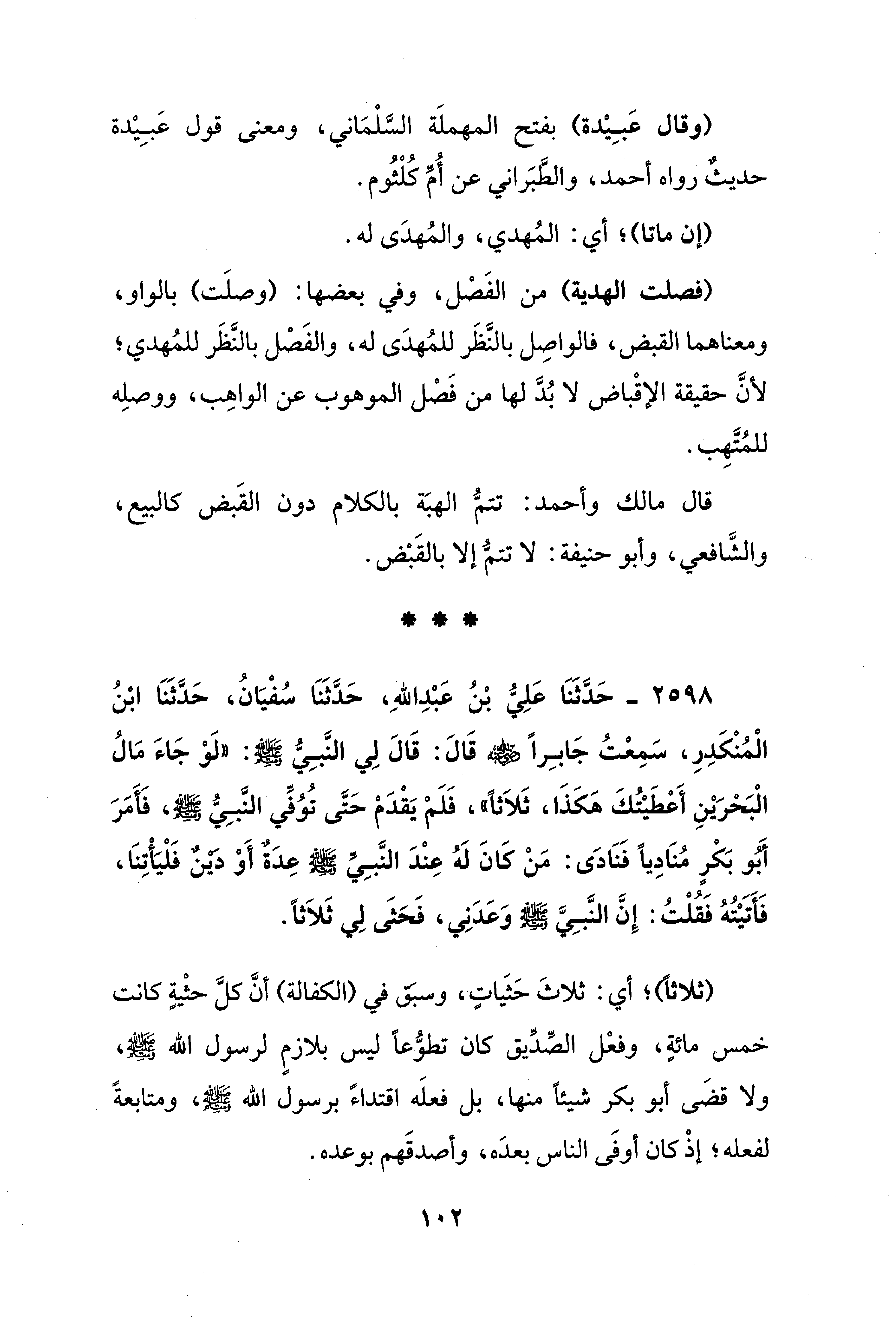 2598 - حَدَّثَنَا عَلِيُّ بْنُ عَبْدِ اللهِ، حَدَّثَنَا سُفْيَانُ، حَدَّثَنَا ابْنُ الْمُنْكَدِرِ، سَمِعْتُ جَابِرًا - رضي الله عنه - قَالَ: قَالَ لِي النَّبِيُّ - صلى الله عليه وسلم -: "لَوْ جَاءَ مَالُ الْبَحْرَيْنِ أَعْطَيْتُكَ هَكَذَا، ثَلاَثًا"، فَلَمْ يَقْدَمْ حَتَّى تُوُفِّي النَّبِيُّ - صلى الله عليه وسلم -، فَأمَرَ أَبُو بَكْرٍ مُنَادِيًا فَنَادَى: مَنْ كَانَ لَهُ عِنْدَ النَّبِيِّ - صلى الله عليه وسلم - عِدَةٌ أَوْ دينٌ فَلْيَأْتِنَا، فَأتَيْتُهُ فَقُلْتُ: إِنَّ النَّبِي - صلى الله عليه وسلم - وَعَدَنِي، فَحَثَى لِي ثَلاَثًا.