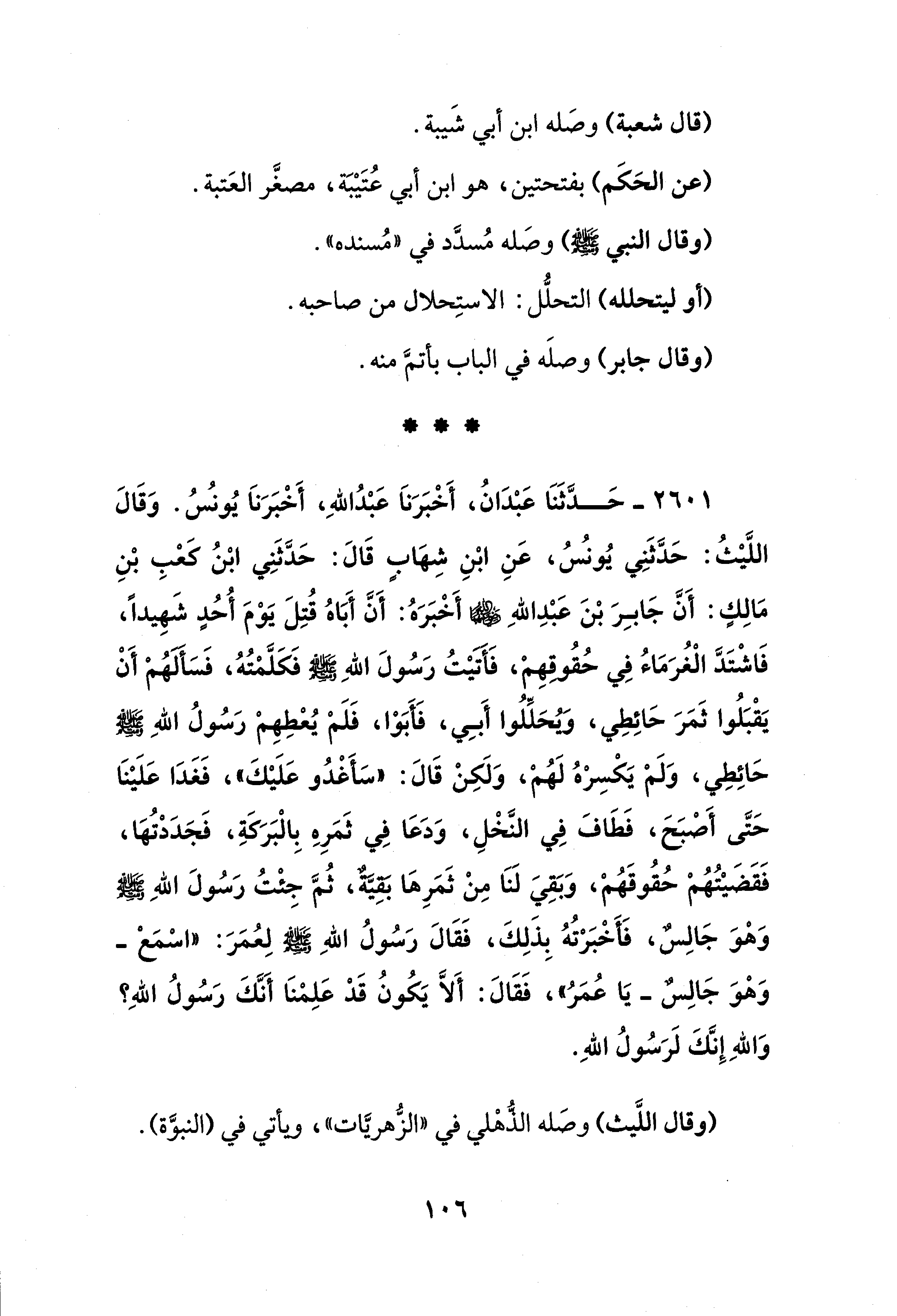 2601 - حَدَّثَنَا عَبْدَانُ، أَخْبَرَنَا عَبْدُ اللهِ، أَخْبَرَنَا يُونس. وَقَالَ اللَّيْثُ: حَدَّثَنِي يُونُسُ، عَنِ ابْنِ شِهَابٍ قَالَ: حَدَّثَنِي ابْنُ كعْبِ بْنِ مَالِكٍ: أَنَّ جَابِرَ بْنَ عَبْدِ اللهِ - رضي الله عنهما - أَخْبَرَهُ: أَنَّ أَبَاهُ قُتِلَ يَوْمَ أُحُدٍ شَهِيدًا، فَاشْتَدَّ الْغُرَمَاءُ فِي حُقُوقِهِم، فَأتيْتُ رَسُولَ اللهِ - صلى الله عليه وسلم - فَكَلَّمْتُهُ، فَسَألهُمْ أَنْ يَقْبَلُوا ثَمَرَ حَائِطِي، ويُحَلِّلُوا أَبِي، فَأَبَوْا، فَلَمْ يُعْطِهِمْ رَسُولُ اللهِ - صلى الله عليه وسلم - حَائِطِي، وَلَمْ يَكْسِرْهُ لَهُمْ، وَلَكِنْ قَالَ: "سَأغْدُو عَلَيْكَ"، فَغَدَا عَلَيْنَا حَتَّى أَصْبَحَ، فَطَافَ فِي النَّخْلِ، وَدَعَا فِي ثَمَرِهِ بِالْبَرَكَةِ، فَجَدَدْتُهَا، فَقَضَيْتُهُمْ حُقُوقَهُمْ، وَبقِيَ لَنَا مِنْ ثَمَرِهَا بقِيَّةٌ، ثُمَّ جِئْتُ رَسُولَ اللهِ - صلى الله عليه وسلم - وَهْوَ جَالِسٌ، فَأَخْبَرتُهُ بِذَلِكَ، فَقَالَ رَسُولُ اللهِ - صلى الله عليه وسلم - لِعُمَرَ: "اسمَعْ -وَهْوَ جَالِسٌ- يَا عُمَرُ"، فَقَالَ: أَلَّا يَكُونُ قَدْ عَلِمْنَا أَنَّكَ رَسُولُ اللهِ؟ وَاللهِ إِنَّكَ لَرَسُولُ اللهِ.