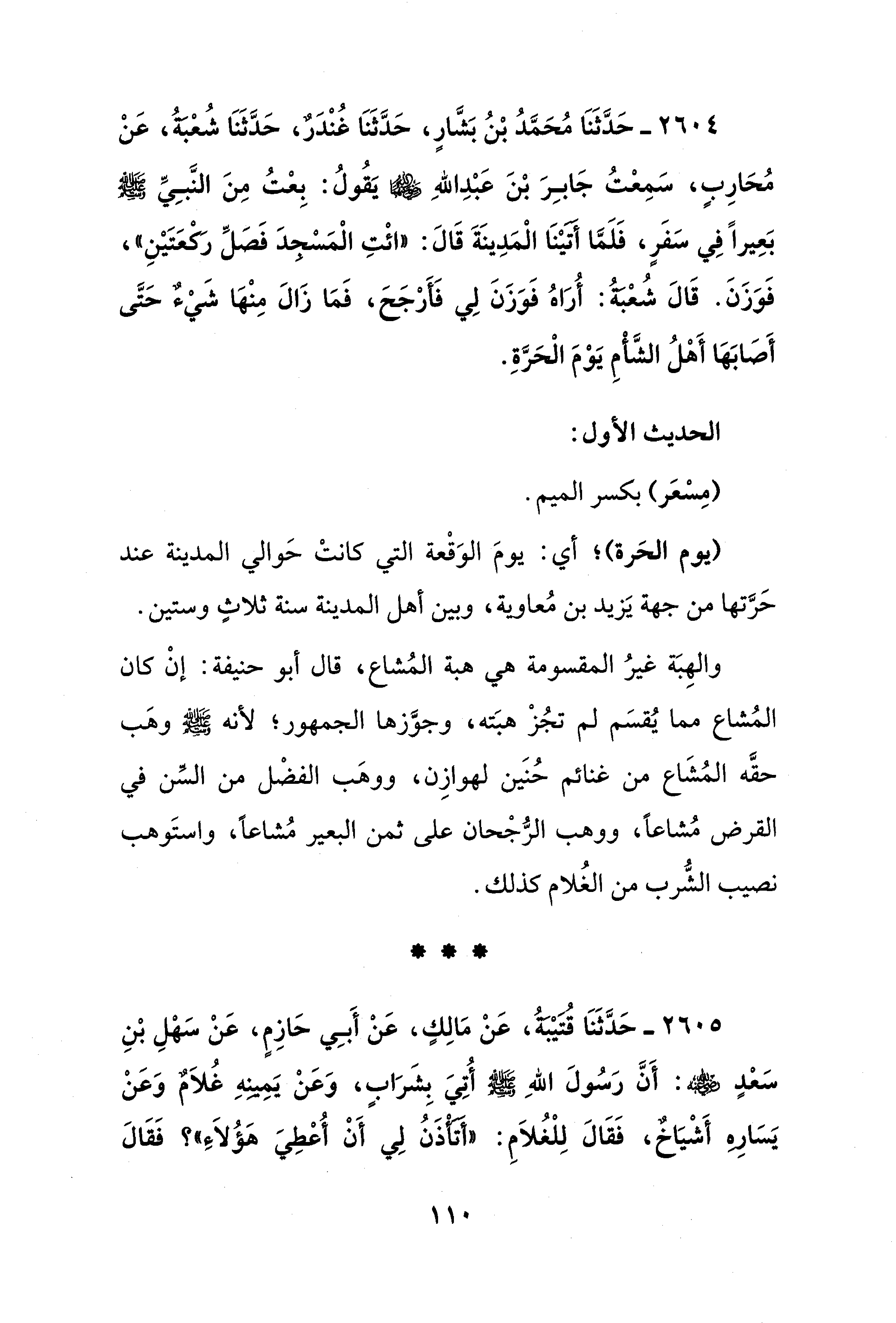 2604 - حَدَّثَنَا مُحَمَّدُ بْنُ بَشَّار، حَدَّثَنَا غنْدَرٌ، حَدَّثَنَا شُعْبةُ، عَنْ مُحَارِبٍ، سَمِعْتُ جَابِرَ بْنَ عَبْدِ اللهِ - رضي الله عنهما - يَقُولُ: بِعْتُ مِنَ النَّبِيِّ - صلى الله عليه وسلم - بَعِيرًا فِي سَفَرٍ، فَلَمَّا أتيْنَا الْمَدِينَةَ قَالَ: "ائْتِ الْمَسْجدَ فَصَلِّ ركعَتَيْنِ"، فَوَزَنَ. قَالَ شُعْبةُ: أُرَاهُ فَوَزَنَ لِي فَأرْجَحَ، فَمَا زَالَ مِنْهَا شَيْءٌ حَتَّى أَصَابَهَا أَهْلُ الشَّأْمِ يَوْمَ الْحَرَّةِ.