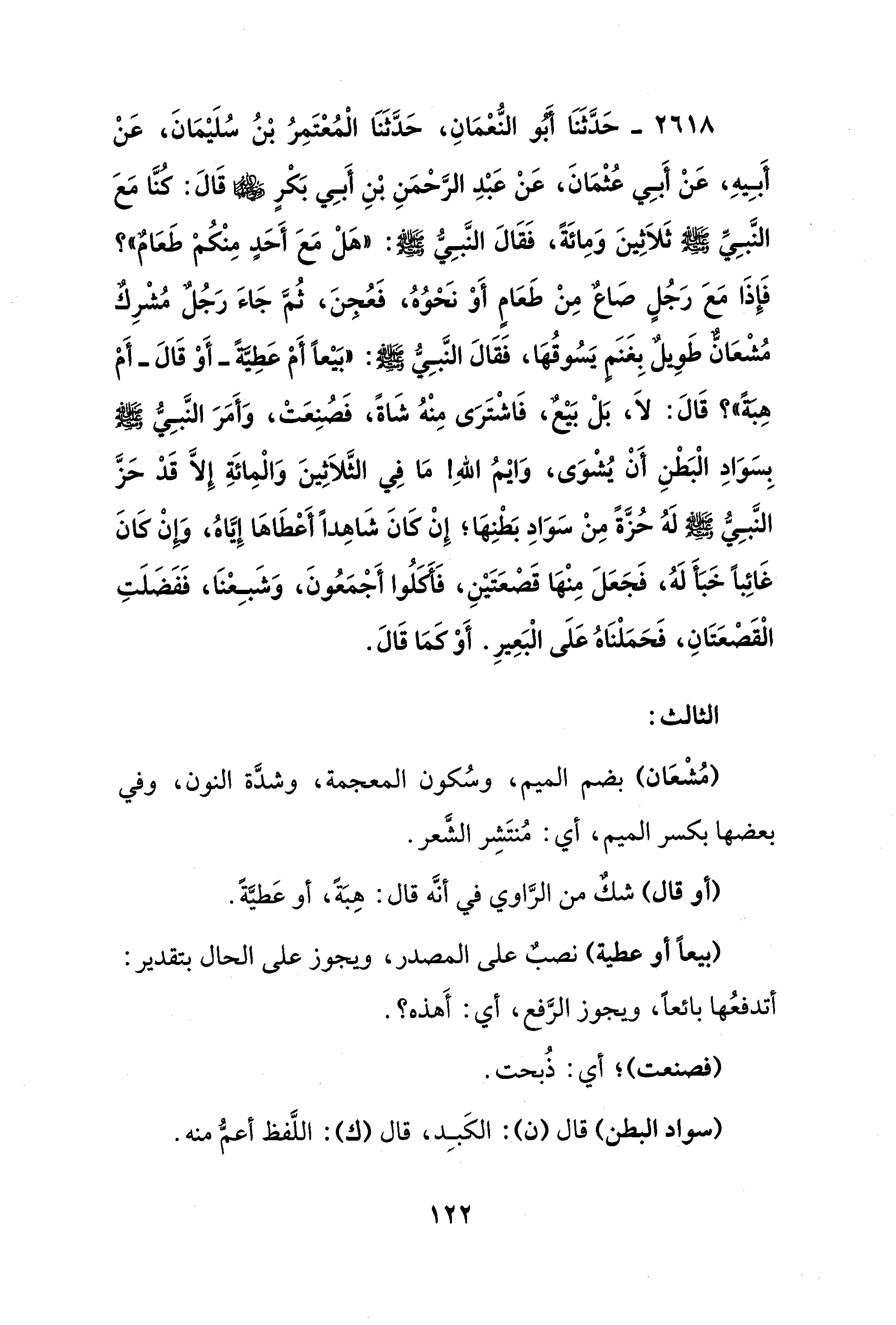2618 - حَدَّثَنَا أبو النُّعْمَانِ، حَدَّثَنَا الْمُعْتَمِرُ بْنُ سُلَيْمَانَ، عَنْ أَبِيهِ، عَنْ أَبِي عُثْمَانَ، عَنْ عَبْدِ الرَّحْمَنِ بْنِ أَبِي بَكْرٍ - رضي الله عنهما - قَالَ: كنا مَعَ النَّبِيِّ - صلى الله عليه وسلم - ثَلاَثِينَ وَمِائَةً، فَقَالَ النَّبِي - صلى الله عليه وسلم -: "هَلْ مَعَ أَحَدٍ مِنْكُمْ طَعَامٌ"؟ فَإِذَا مَعَ رَجُلٍ صاعٌ مِنْ طَعَامٍ أَوْ نَحْوُهُ، فَعُجِنَ، ثُمَّ جَاءَ رَجُلٌ مُشْرِكٌ مُشْعَانٌّ طَوِيلٌ بِغَنَمٍ يَسُوقُهَا، فَقَالَ النَّبِيُّ - صلى الله عليه وسلم -: "بَيْعًا أَمْ عَطِيَّةً -أَوْ قَالَ- أَمْ هِبةً"؟ قَالَ: لاَ، بَلْ بَيعٌ، فَاشْتَرَى مِنْهُ شَاةً، فَصُنِعَتْ، وَأَمَرَ النَّبِيُّ - صلى الله عليه وسلم - بِسَوَادِ الْبَطْنِ أَنْ يُشْوَى، وَايْمُ اللهِ مَا فِي الثَّلاَثِينَ وَالْمِائَةِ إِلَّا قَدْ حَزَّ النَّبِيُّ - صلى الله عليه وسلم - لَهُ حُزَّةً مِنْ سَوَادِ بَطْنِهَا؛ إِنْ كَانَ شَاهِدًا أَعْطَاهَا إِيَّاهُ، وإن كَانَ غَائِبًا خَبَأ لَهُ، فَجَعَلَ مِنْهَا قَصْعَتَيْنِ، فَأكلُوا أَجْمَعُونَ، وَشَبِعْنَا، فَفَضَلَتِ الْقَصْعَتَانِ، فَحَمَلْنَاهُ عَلَى الْبَعِيرِ. أَوْ كَمَا قَالَ.