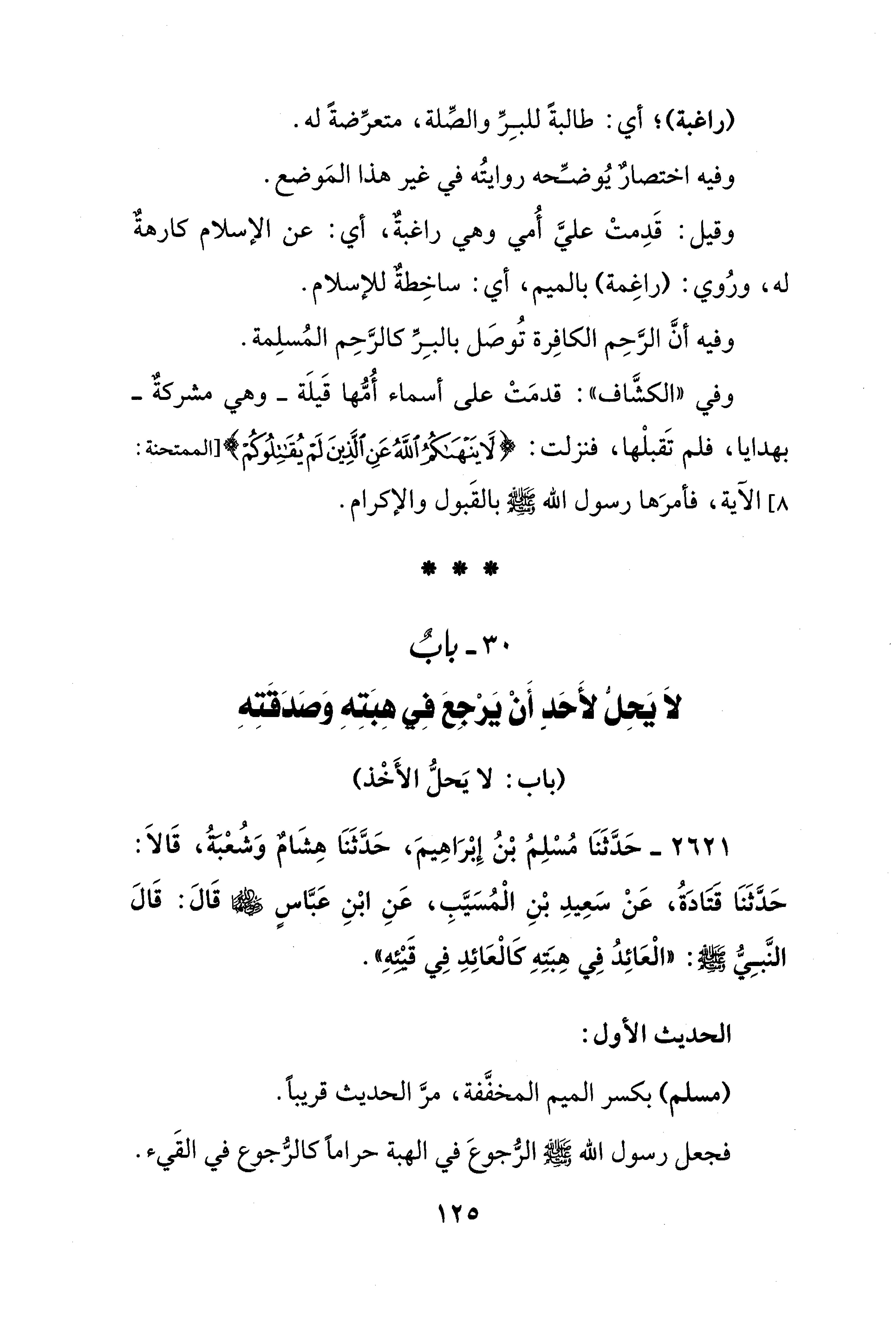 2621 - حَدَّثَنَا مُسْلِمُ بْنُ إِبْرَاهِيمَ، حَدَّثَنَا هِشَامٌ وَشُعْبةُ، قَالاَ: حَدَّثَنَا قتادَةُ، عَنْ سَعِيدِ بْنِ الْمُسَيَّبِ، عَنِ ابْنِ عَباسٍ - رضي الله عنهما - قَالَ: قَالَ النَّبِي - صلى الله عليه وسلم -: "الْعَائِدُ فِي هِبَتِهِ كَالْعَائِدِ فِي قَيْئهِ".