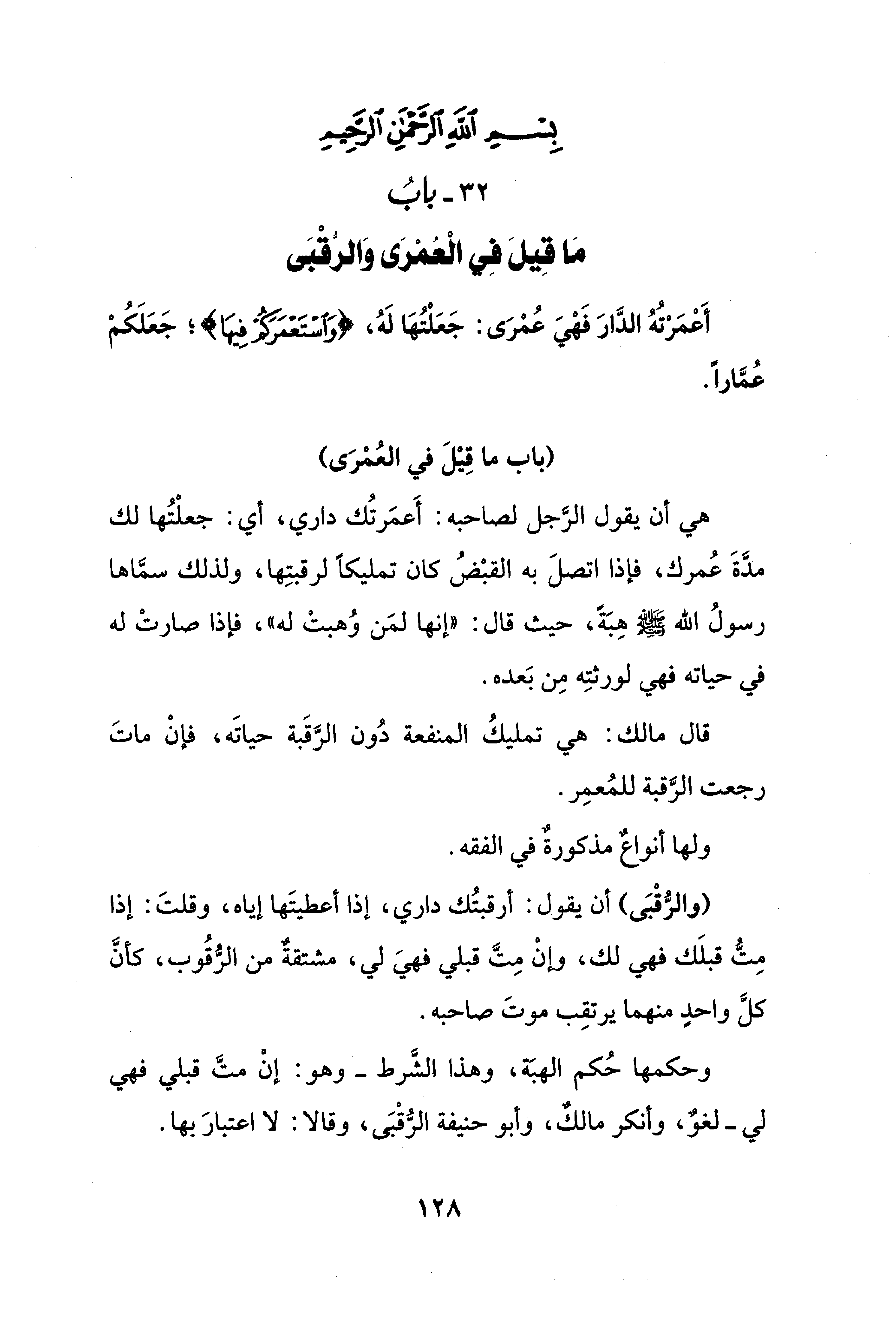 هي أن يقول الرَّجل لصاحبه: أَعمَرتُك داري، أي: جعلْتُها لك مدَّةَ عُمرك، فإذا اتصلَ به القبْضُ كان تمليكًا لرقبتِها، ولذلك سمَّاها رسولُ الله - صلى الله عليه وسلم - هِبَةً، حيث قال: "إنها لمَن وُهبتْ له"، فإذا صارتْ له في حياته فهي لورثتِه مِن بَعده.