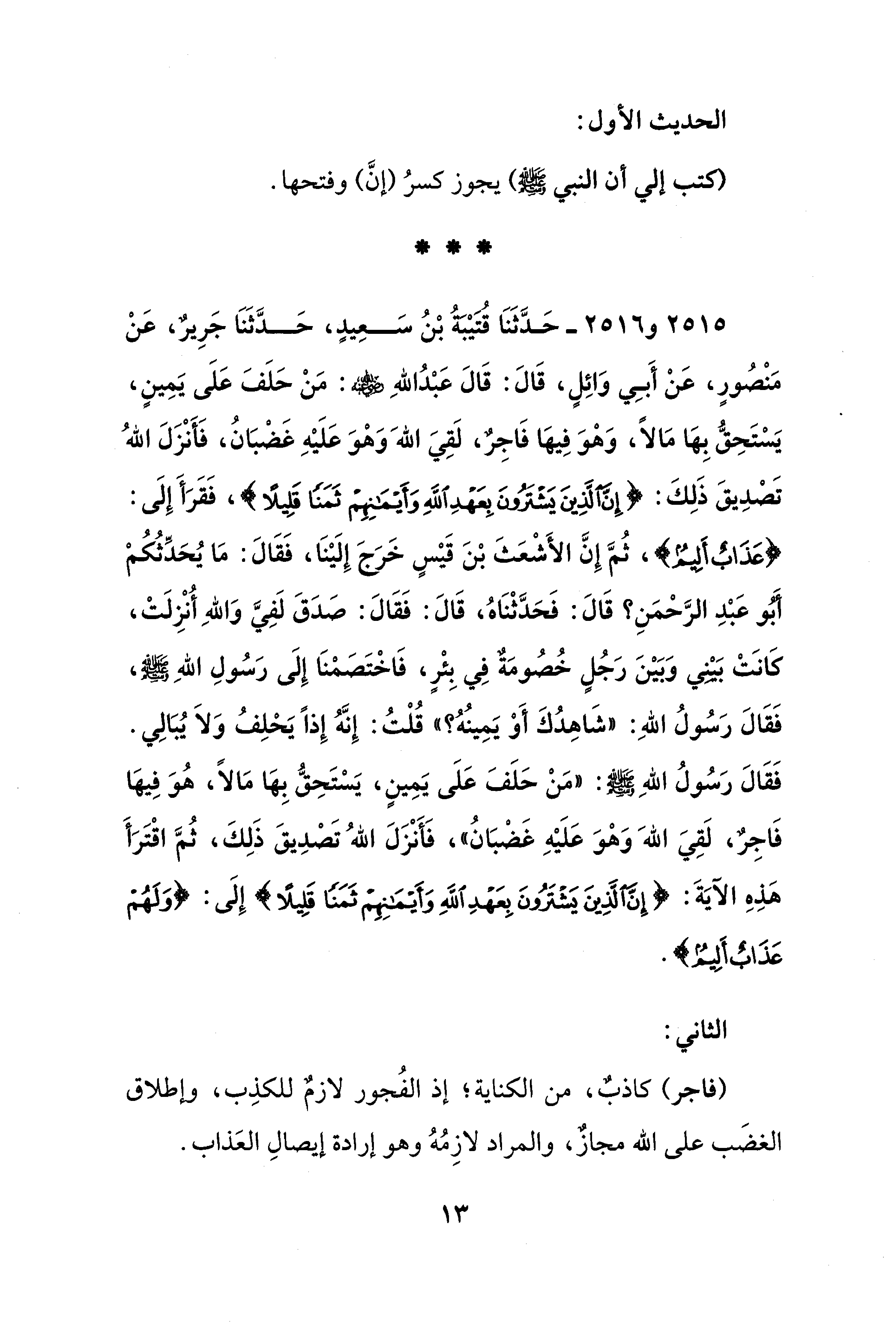 2515 - و 2516 - حَدَّثَنَا قتيْبةُ بْنُ سَعِيدٍ، حَدَّثَنَا جَرِير، عَنْ مَنْصُورٍ، عَنْ أَبِي وَائِلٍ، قَالَ: قَالَ عَبْدُ اللهِ - رضي الله عنه -: مَنْ حَلَفَ عَلَى يَمِين، يَسْتَحِقُّ بِهَا مَالًا، وَهْوَ فِيهَا فَاجِرٌ، لَقِيَ الله وَهْوَ عَلَيْهِ غَضْبَانُ، فَأنْزَلَ اللهُ تَصْدِيقَ ذَلِكَ: {إِنَّ الَّذِينَ يَشْتَرُونَ بِعَهْدِ اللهِ وَأَيْمَانِهِمْ ثَمَنًا قَلِيلًا}، فَقَرَأَ إلَى: {عَذَابٌ أَلِيمٌ}، ثُمَّ إِنَّ الأَشْعَثَ بْنَ قَيْسٍ خَرَجَ إِلَيْنَا، فَقَالَ: مَا يُحَدِّثُكُمْ أَبُو عَبْدِ الرَّحْمَنِ؟ قَالَ: فَحَدَّثْنَاهُ، قَالَ: فَقَالَ: صَدَقَ لَفِيَّ وَاللهِ أُنْزِلَتْ، كَانَتْ بَيْني وَبَيْنَ رَجُلٍ خُصُومَةٌ فِي بِئْرٍ، فَاخْتَصَمْنَا إِلَى رَسُولِ الله - صلى الله عليه وسلم -، فَقَالَ رَسُولُ الله: "شَاهِدُكَ أَوْ يَمِينُهُ؟ " قُلْتُ: إِنَّهُ إِذًا يَحْلِفُ وَلاَ يُبَالِي. فَقَالَ رَسُولُ الله - صلى الله عليه وسلم -: "مَنْ حَلَفَ عَلَى يَمِينٍ، يَسْتَحِقُّ بِهَا مَالًا، هُوَ فِيهَا فَاجِر، لَقِيَ اللهَ وَهْوَ عَلَيْهِ غَضْبَانُ،، فَأنْزَلَ اللهُ تَصْدِيقَ ذَلِكَ، ثُمَّ اقْتَرَأَ هَذِهَ الآيَةَ: {إِنَّ الَّذِينَ يَشْتَرُونَ بِعَهْدِ اللَّهِ وَأَيْمَانِهِمْ ثَمَنًا قَلِيلًا} إلَى: {ولهُم عَذَابٌ أَلِيمٌ}.