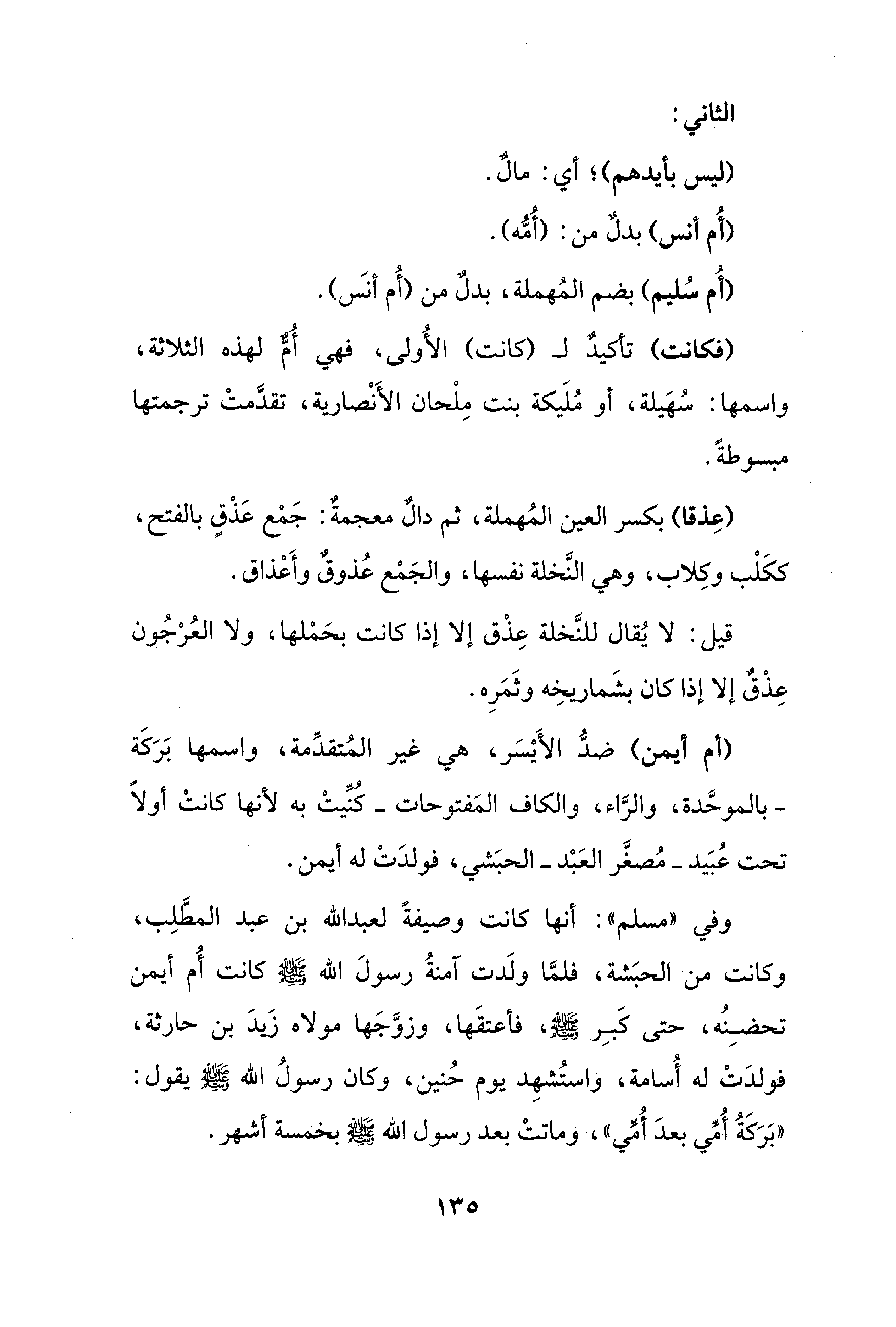 (أم أيمن) ضدُّ الأَيْسَر، هي غير المُتقدِّمة، واسمها بَرَكَة -بالموحَّدة، والرَّاء، والكاف المَفتوحات- كُنِّيتْ به لأنها كانتْ أولًا تحت عُبَيد -مُصغَّر العَبْد- الحبَشي، فولدَتْ له أيمن.