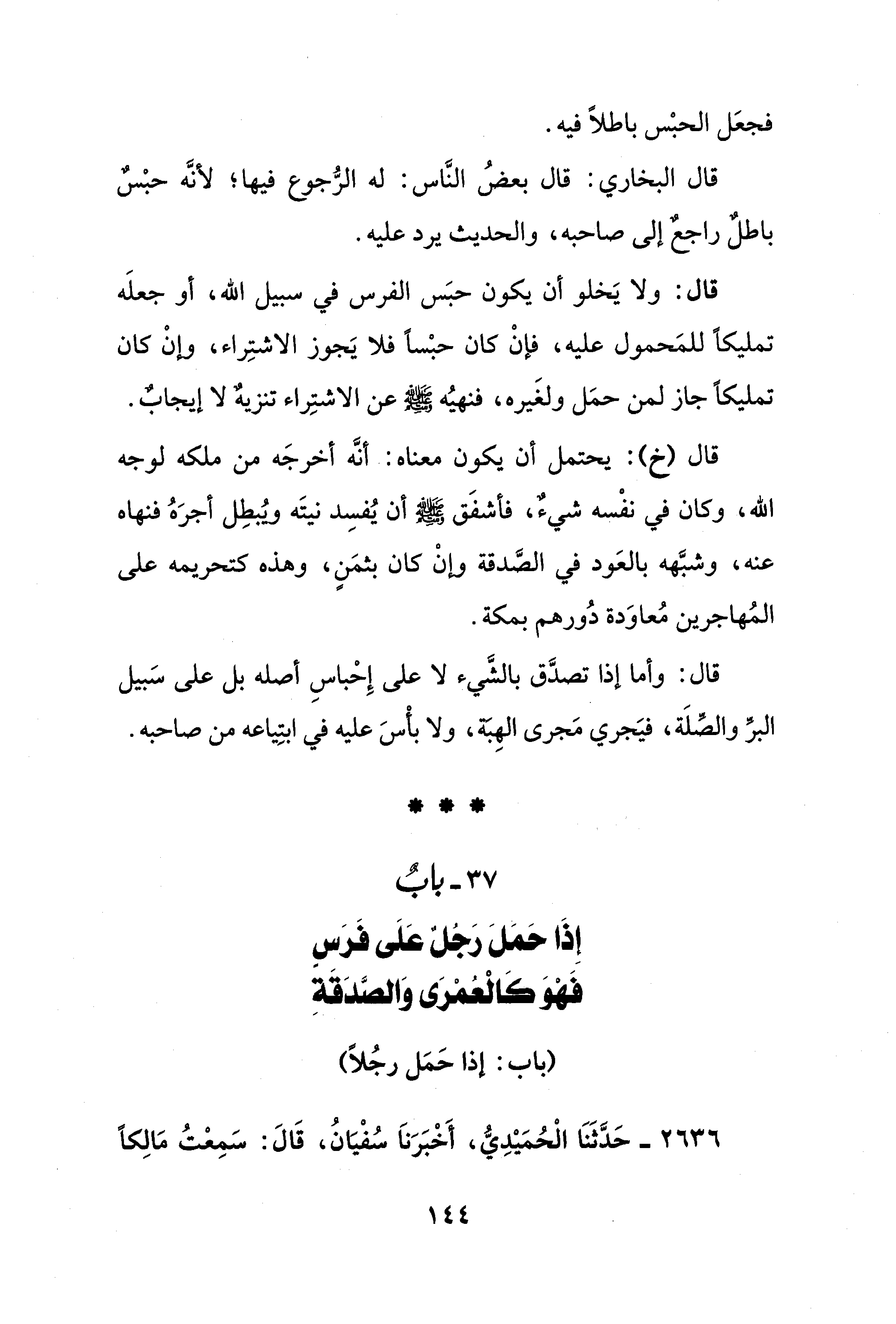 قال: ولا يَخلو أن يكون حبَس الفرس في سبيل الله، أو جعلَه تمليكًا للمَحمول عليه، فإنْ كان حبْسًا فلا يَجوز الاشتِراء، وإنْ كان تمليكًا جاز لمن حمَل ولغَيره، فنهيُه - صلى الله عليه وسلم - عن الاشتِراء تنزيهٌ لا إيجابٌ.