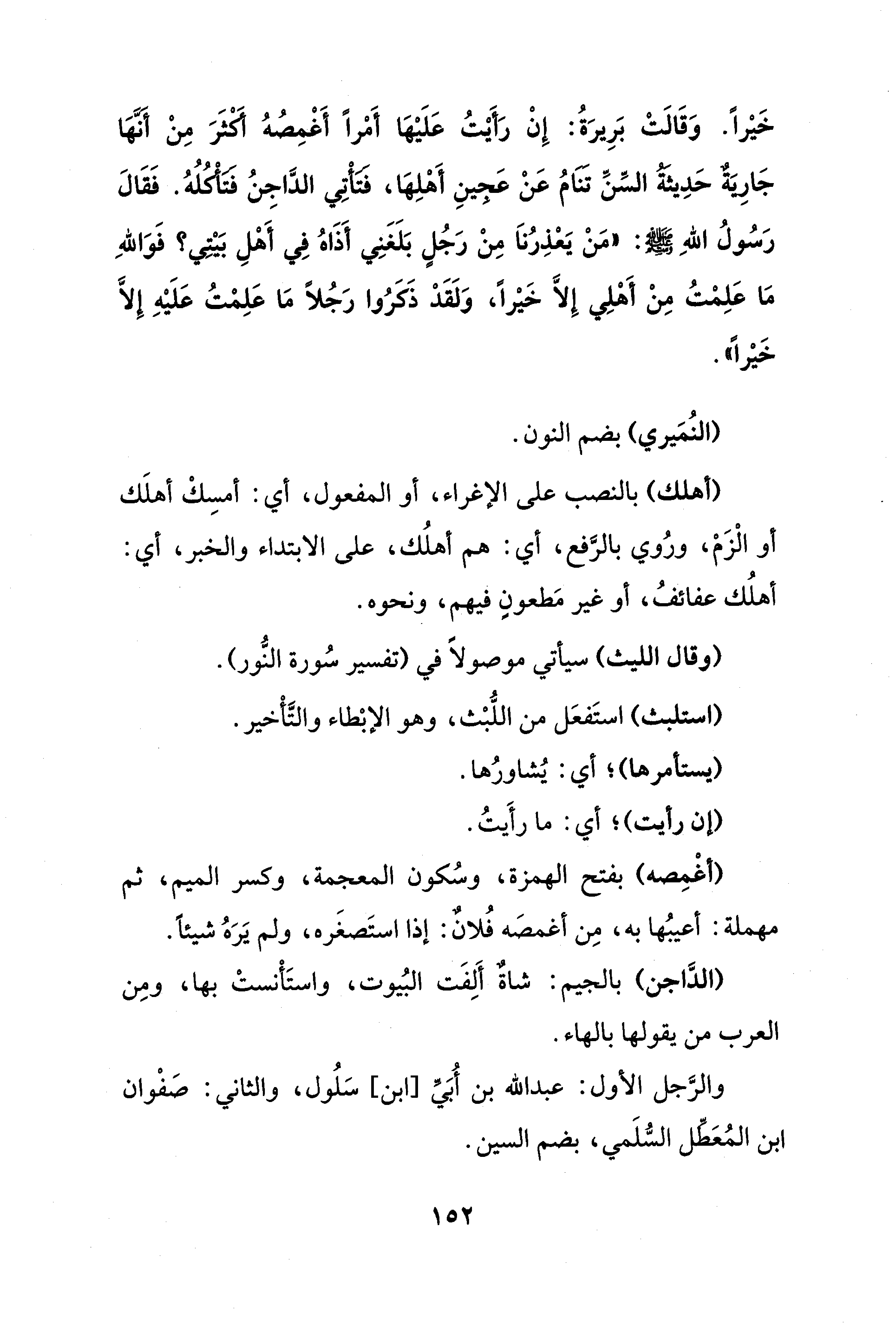 خَيْرًا. وَقَالَتْ بَرِيرَةُ: إِنْ رَأَيْتُ عَلَيْهَا أَمْرًا أَغْمِضُهُ أَكثَرَ مِنْ أَنَّهَا جَارِيَةٌ حَدِيثةُ السِّنِّ تنامُ عَنْ عَجينِ أَهْلِهَا، فَتَأْتِي الدَّاجِنُ فَتَأَكُلُهُ. فَقَالَ رَسُولُ اللهِ - صلى الله عليه وسلم -: "مَنْ يَعْذِرُنَا مِنْ رَجُلٍ بَلَغَنِي أَذَاهُ في أَهْلِ بَيْتِي؟ فَوَاللهِ مَا عَلِمْتُ مِنْ أَهْلِي إِلَّا خَيْرًا، وَلَقَدْ ذَكَرُوا رَجُلًا مَا عَلِمْتُ عَلَيهِ إِلَّا خَيْرًا".
