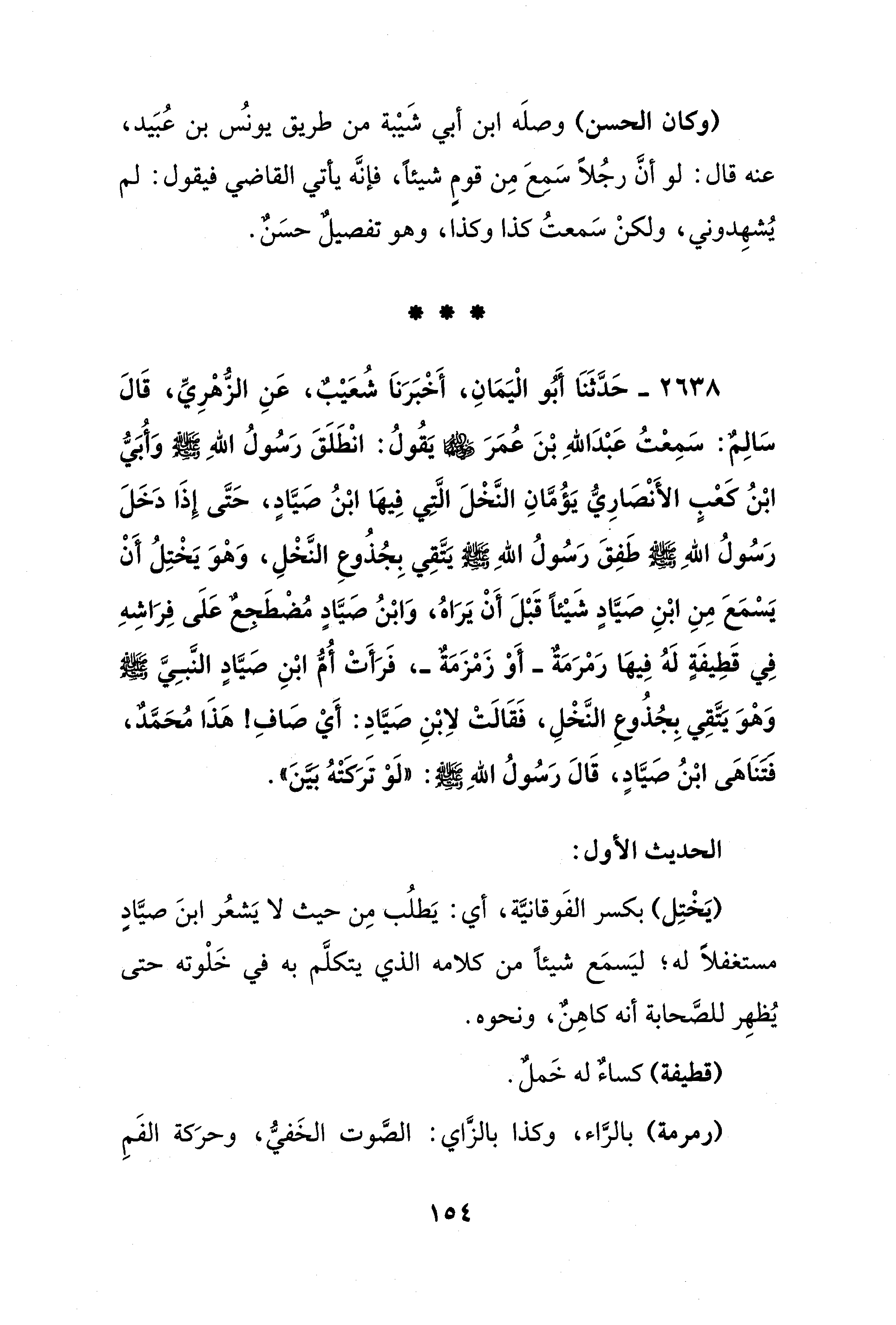 2638 - حَدَّثَنَا أَبُو الْيَمَانِ، أَخْبَرَنَا شُعَيْبٌ، عَنِ الزُّهْرِيِّ، قَالَ سَالِمٌ: سَمِعْتُ عَبْدَ اللهِ بْنَ عُمَرَ - رضي الله عنهما - يَقُولُ: انْطَلَقَ رَسُولُ اللهِ - صلى الله عليه وسلم - وَأُبَيُّ ابْنُ كَعْبٍ الأَنْصَارِيُّ يَؤُمَّانِ النَّخْلَ الَّتِي فِيهَا ابْنُ صَيَّادٍ، حَتَّى إِذَا دَخَلَ رَسُولُ اللهِ - صلى الله عليه وسلم - طَفِقَ رَسُولُ اللهِ - صلى الله عليه وسلم - يَتَّقِي بِجُذُوعِ النَّخْلِ، وَهْوَ يَخْتِلُ أَنْ يَسْمَعَ مِنِ ابْنِ صَيَّادٍ شَيْئًا قَبْلَ أَنْ يَرَاهُ، وَابْنُ صَيَّادٍ مُضْطَجعٌ عَلَى فِرَاشِهِ في قَطِيفَةٍ لَهُ فِيهَا رَمْرَمَةٌ -أَوْ زَمْزَمَةٌ-، فَرَأَتْ أُمُّ ابْنِ صَيَّادٍ النَّبِيَّ - صلى الله عليه وسلم - وَهْوَ يَتَّقِي بِجُذُوعِ النَّخْلِ، فَقَالَتْ لاِبْنِ صَيَّادِ: أَيْ صَافِ! هَذَا مُحَمَّدٌ، فتنَاهَى ابْنُ صَيَّادٍ، قَالَ رَسُولُ اللهِ - صلى الله عليه وسلم -: "لَوْ تَرَكَتْهُ بَيَّنَ".