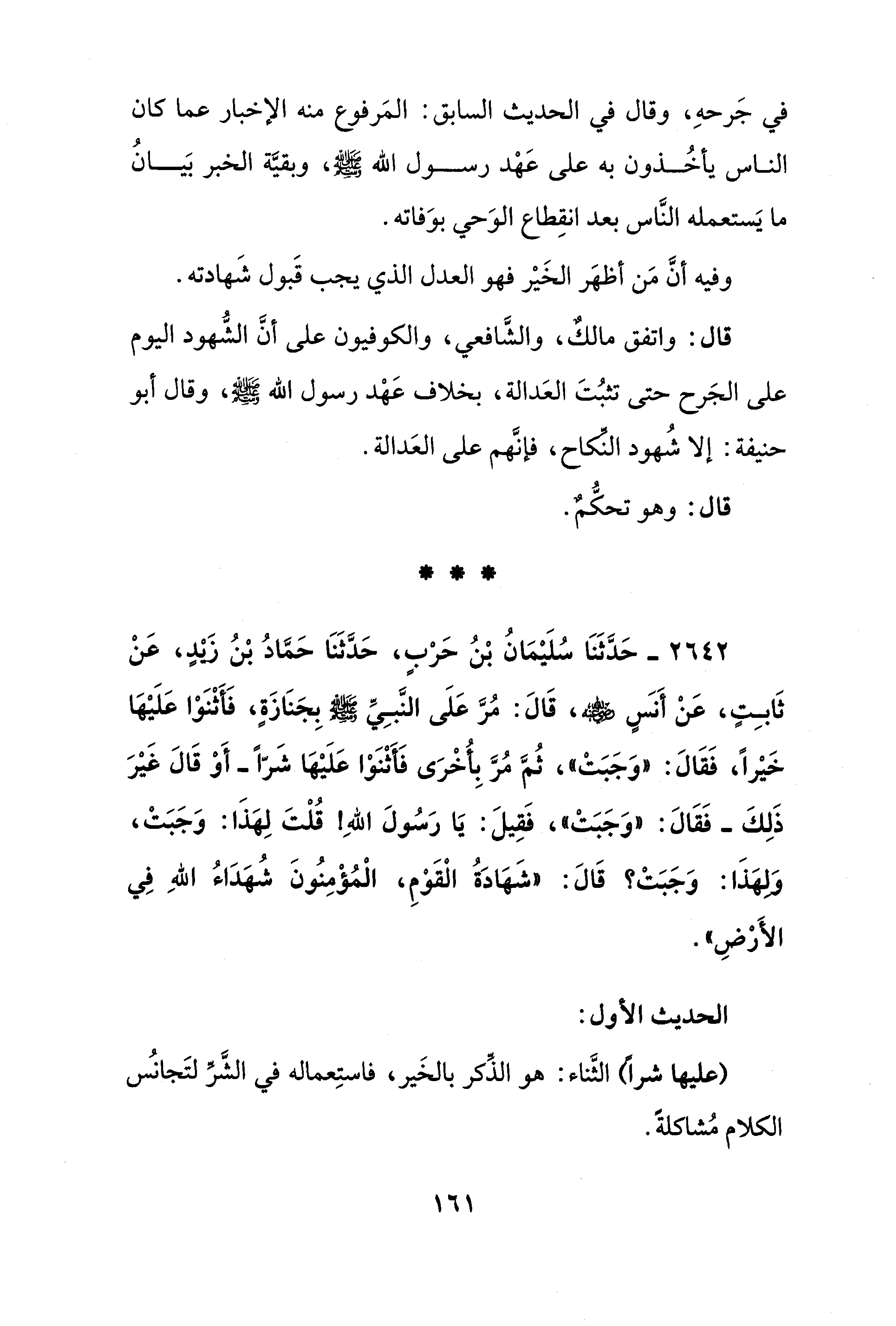 2642 - حَدَّثَنَا سُلَيْمَانُ بْنُ حَرْبٍ، حَدَّثَنَا حَمَّادُ بْنُ زيدٍ، عَنْ ثَابِثٍ، عَنْ أَنسٍ - رضي الله عنه -، قَالَ: مُرَّ عَلَى النَّبِيِّ - صلى الله عليه وسلم - بِجَنَازَةٍ، فَأَثْنَوْا عَلَيْهَا خَيْرًا، فَقَالَ: "وَجَبَتْ"، ثُمَّ مُرَّ بِأُخرَى فَأَثْنَوْا عَلَيْهَا شَرًّا -أَوْ قَالَ غير ذَلِكَ- فَقَالَ: "وَجَبَتْ"، فَقِيلَ: يَا رَسُولَ اللهِ! قُلْتَ لِهَذَا: وَجَبَتْ، وَلِهَذَا: وَجَبَتْ؟ قَالَ: "شَهَادَةُ الْقَوْمِ، الْمُؤْمِنُونَ شُهَدَاءُ اللهِ في الأَرْضِ".