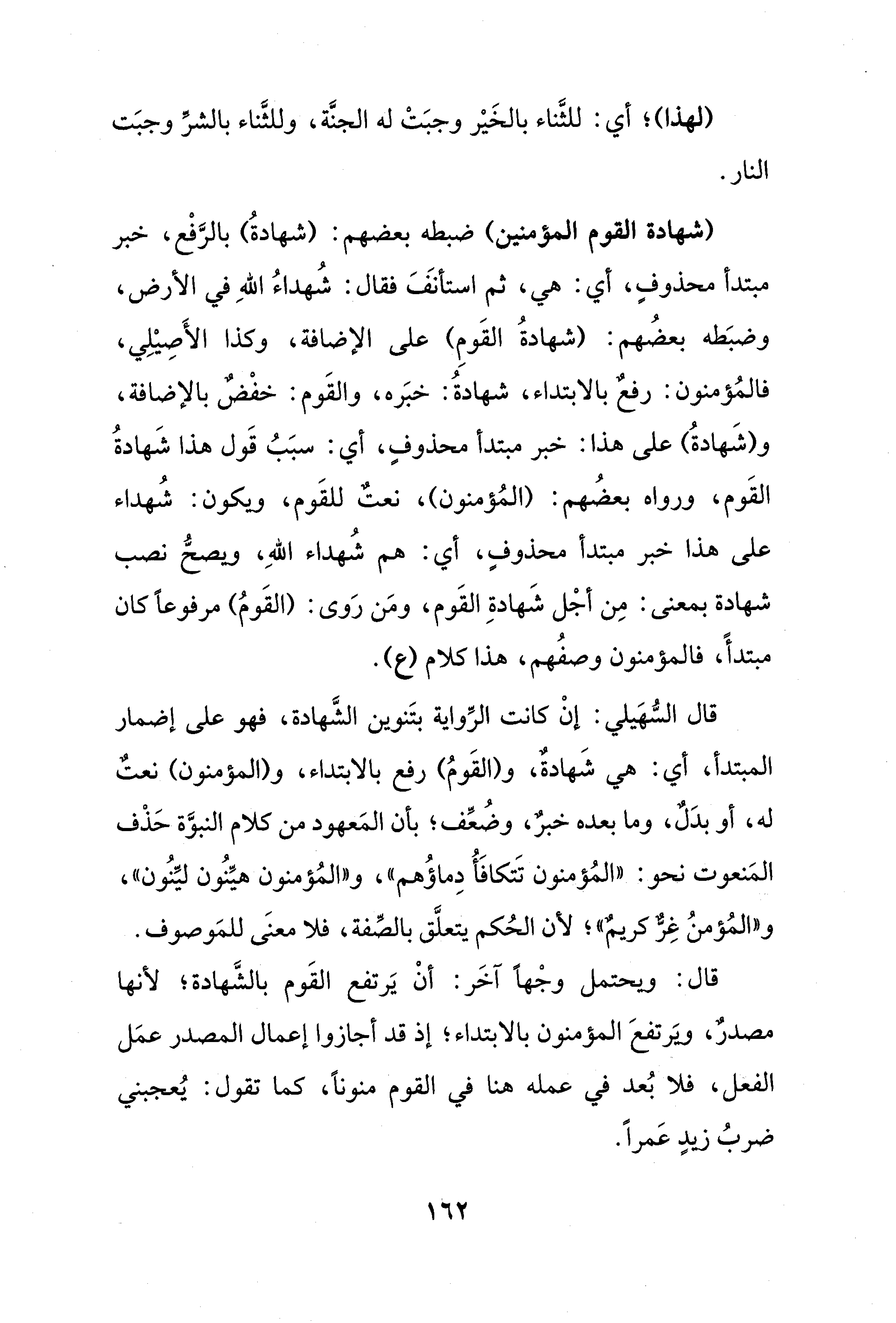 قال السُّهَيلي: إنْ كانت الرِّواية بتَنوين الشَّهادة، فهو على إضمار المبتدأ، أي: هي شَهادةٌ، و (القَومُ) رفع بالابتداء، و (المؤمنون) نعتٌ له، أو بدَلٌ، وما بعده خبرٌ، وضُعِّف؛ بأن المَعهود من كلام النبوَّة حَذْف المَنعوت نحو: "المُؤمنون تَتكافَأُ دِماؤُهم"، و"المُؤمنون هيِّنُون ليِّنُون"، و"المُؤمنُ غِرٌّ كريمٌ"؛ لأن الحُكم يتعلَّق بالصِّفة، فلا معنَى للمَوصوف.