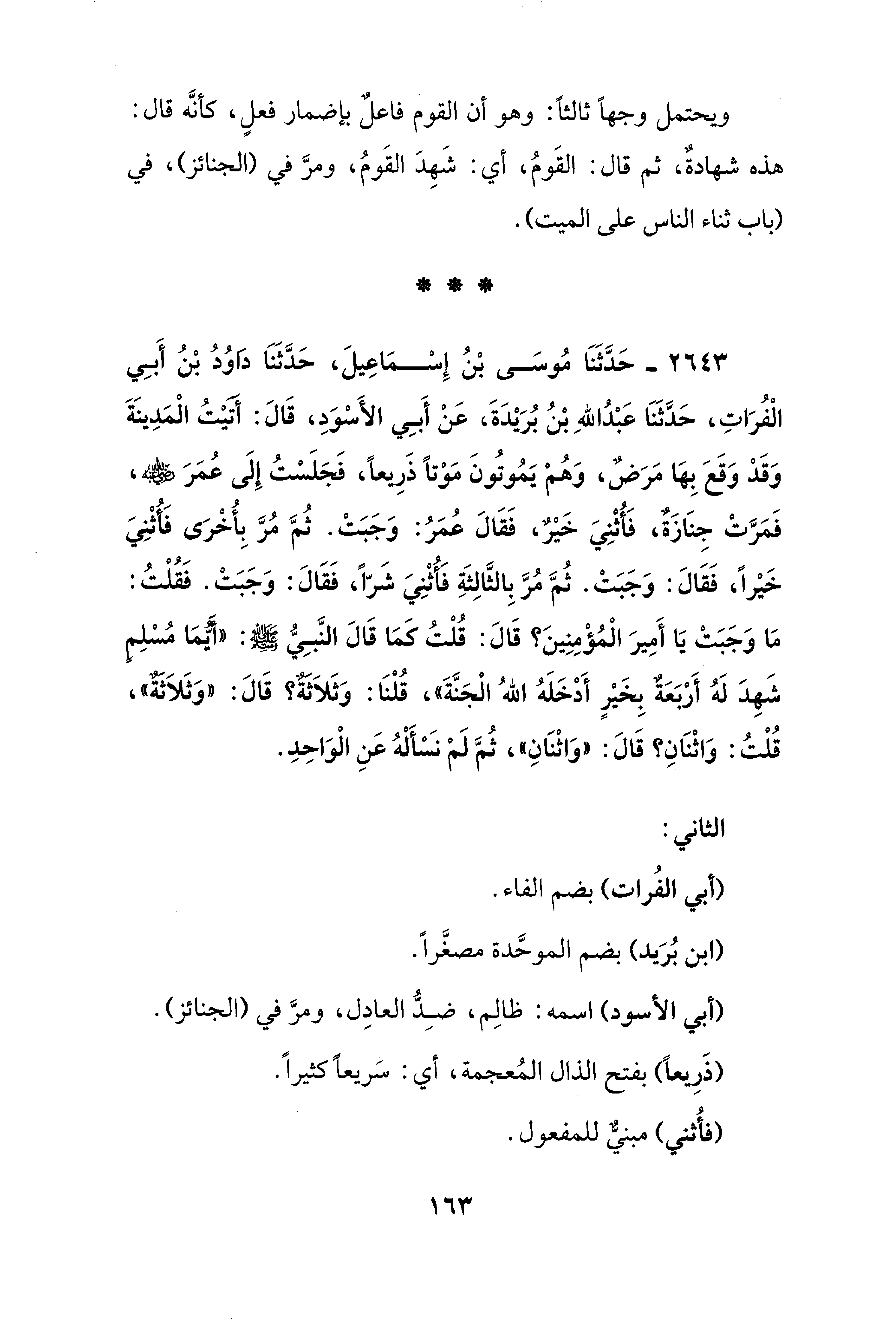 2643 - حَدَّثَنَا مُوسَى بْنُ إِسْمَاعِيلَ، حَدَّثَنَا دَاوُدُ بْنُ أَبِي الْفُرَاتِ، حَدَّثَنَا عَبْدُ اللهِ بْنُ بُرَيْدَةَ، عَنْ أَبِي الأَسْوَدِ، قَالَ: أتيْتُ الْمَدِينَةَ وَقَدْ وَقَعَ بِهَا مَرَضٌ، وَهُمْ يَمُوتُونَ مَوْتًا ذَرِيعًا، فَجَلَسْتُ إِلَى عُمَرَ - رضي الله عنه -، فَمَرَّتْ جِنَازَةٌ، فَأُثْنِيَ خَيْرٌ، فَقَالَ عُمَرُ: وَجَبَتْ. ثُمَّ مُرَّ بِأُخْرَى فَأُثْنِيَ خَيْرًا، فَقَالَ: وَجَبَتْ. ثُمَّ مُرَّ بِالثَّالِثَةِ فَأُثْنِيَ شَرًّا، فَقَالَ: وَجَبَتْ. فَقُلْتُ: مَا وَجَبَتْ يَا أَمِيرَ الْمُؤْمِنِينَ؟ قَالَ: قُلْتُ كَمَا قَالَ النَّبِيُّ - صلى الله عليه وسلم -: "أَيُّمَا مُسْلِمٍ شَهِدَ لَهُ أَرْبَعَةٌ بِخَيْرٍ أَدْخَلَهُ اللهُ الْجَنَّةَ"، قُلْنَا: وَثَلَاثةٌ قَالَ: "وَثَلَاثةٌ"، قُلْتُ: وَاثْنَانِ؟ قَالَ: "وَاثْنَانِ"، ثُمَّ لَمْ نَسْأَلْهُ عَنِ الْوَاحِدِ.