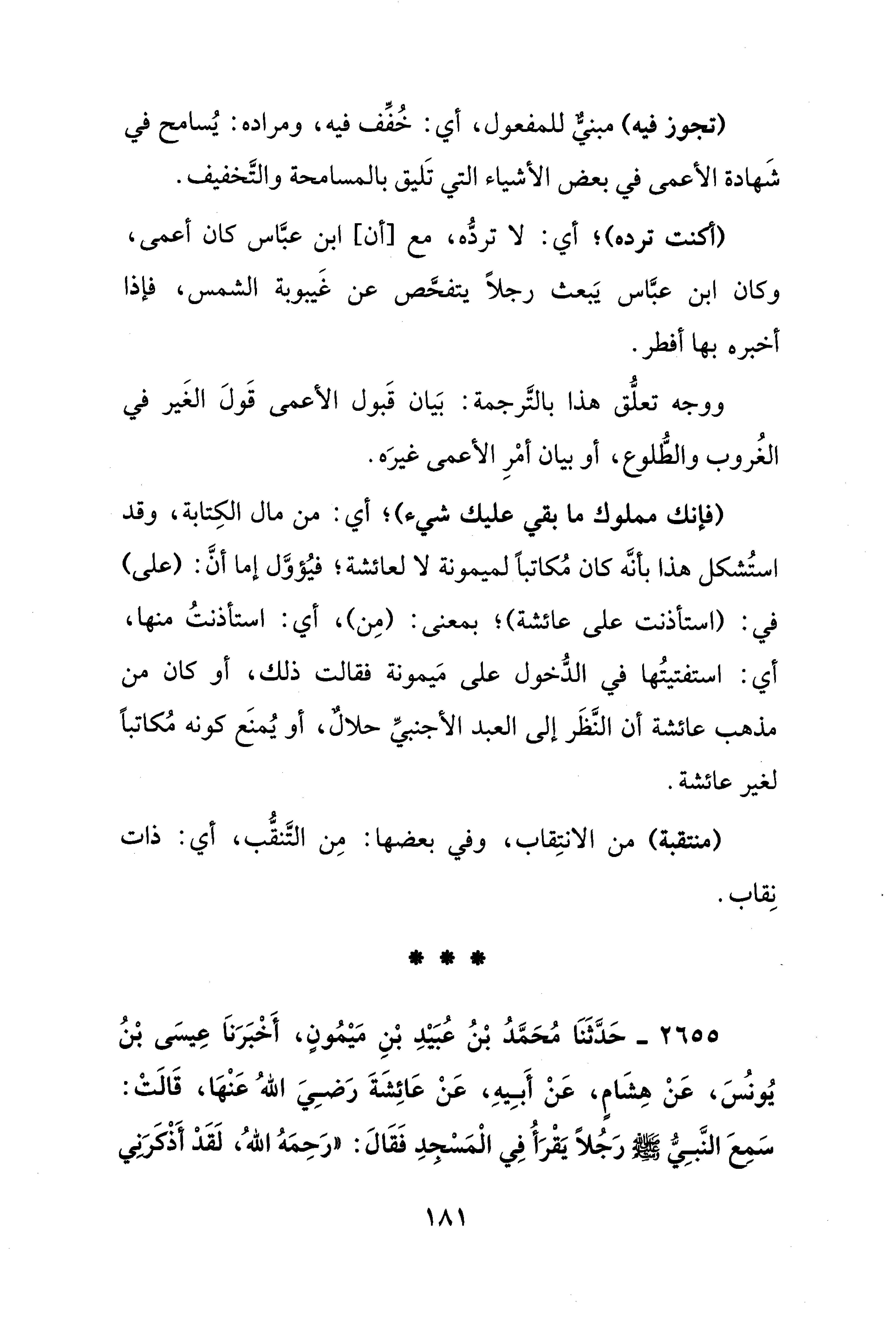 2655 - حَدَّثَنَا مُحَمَّدُ بْنُ عُبَيْدِ بْنِ مَيْمُونٍ، أَخْبَرَنَا عِيسَى بْنُ يُونس، عَنْ هِشَامٍ، عَنْ أَبِيهِ، عَنْ عَائِشَةَ رَضِيَ اللهُ عَنْهَا، قَالَتْ: سَمعَ النَّبِيُّ - صلى الله عليه وسلم - رَجُلًا يَقْرَأُ فِي الْمَسْجدِ فَقَالَ: "رَحِمَهُ اللهُ، لَقَدْ أَذْكَرَنِي
