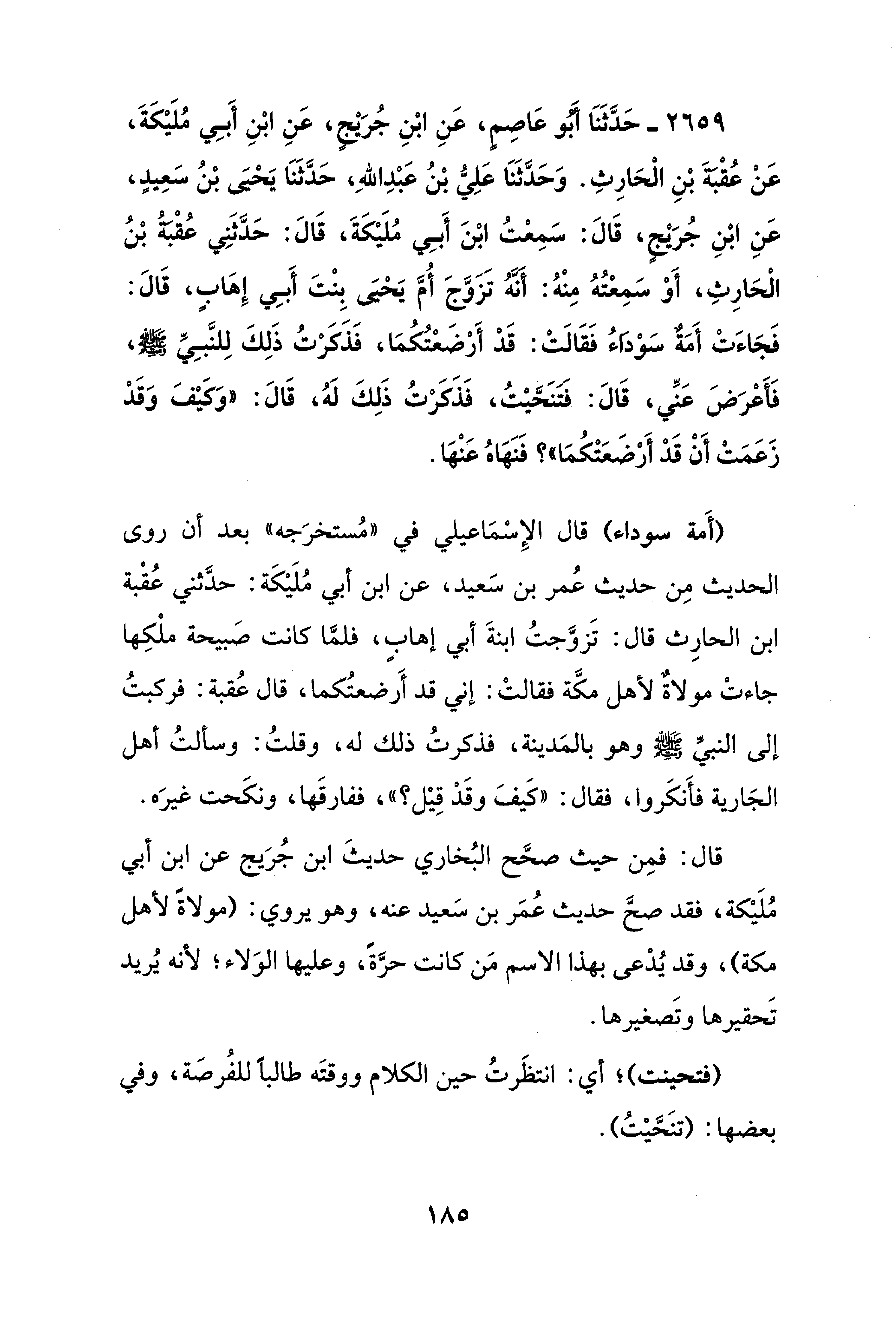2659 - حَدَّثَنَا أَبُو عَاصِمٍ، عَنِ ابْنِ جُرَيْجٍ، عَنِ ابْنِ أَبِي مُلَيْكَةَ، عَنْ عُقْبَةَ بْنِ الْحَارِثِ. وَحَدَّثَنَا عَلِيُّ بْنُ عَبْدِ اللهِ، حَدَّثَنَا يَحْيَى بْنُ سَعِيدٍ، عَنِ ابْنِ جُرَيْجٍ، قَالَ: سَمِعْتُ ابْنَ أَبِي مُلَيْكَةَ، قَالَ: حَدَّثَنِي عُقْبَةُ بْنُ الْحَارِثِ، أَوْ سَمِعْتُهُ مِنْهُ: أنَّهُ تَزَوَّجَ أُمَّ يَحْيَى بِنْتَ أَبِي إِهَابٍ، قَالَ: فَجَاءَتْ أَمَةٌ سَوْدَاءُ فَقَالَتْ: قَدْ أَرْضَعْتُكُمَا، فَذَكَرْتُ ذَلِكَ لِلنَّبِيِّ - صلى الله عليه وسلم -، فَأَعْرَضَ عَنِّي، قَالَ: فتنَحَّيْتُ، فَذَكرْتُ ذَلِكَ لَهُ، قَالَ: "وَكَيْفَ وَقَدْ زَعَمَتْ أَنْ قَدْ أَرْضَعَتْكُمَا"؟ فَنَهَاهُ عَنْهَا.