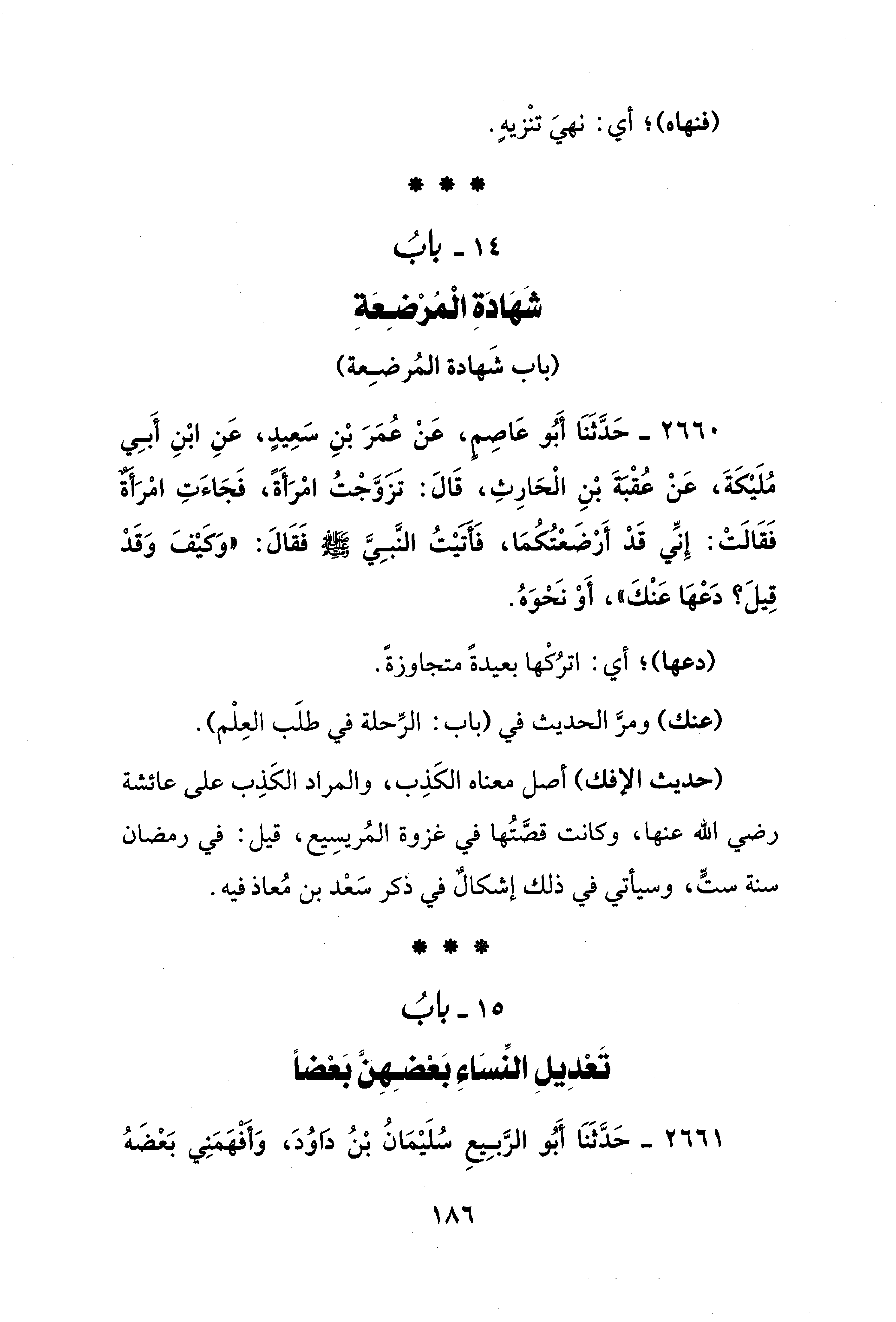 2660 - حَدَّثَنَا أَبُو عَاصِمٍ، عَنْ عُمَرَ بْنِ سَعِيدٍ، عَنِ ابْنِ أَبِي مُلَيْكَةَ، عَنْ عُقْبَةَ بْنِ الْحَارِثِ، قَالَ: تَزَوَّجْتُ امْرَأَةً، فَجَاءَتِ امْرَأَةٌ فَقَالَتْ: إِنِّي قَدْ أَرْضَعْتُكُمَا، فَأَتَيْتُ النَّبِيَّ - صلى الله عليه وسلم - فَقَالَ: "وَكيْفَ وَقَدْ قِيلَ؟ دَعْهَا عَنْكَ"، أَوْ نَحْوَهُ.
