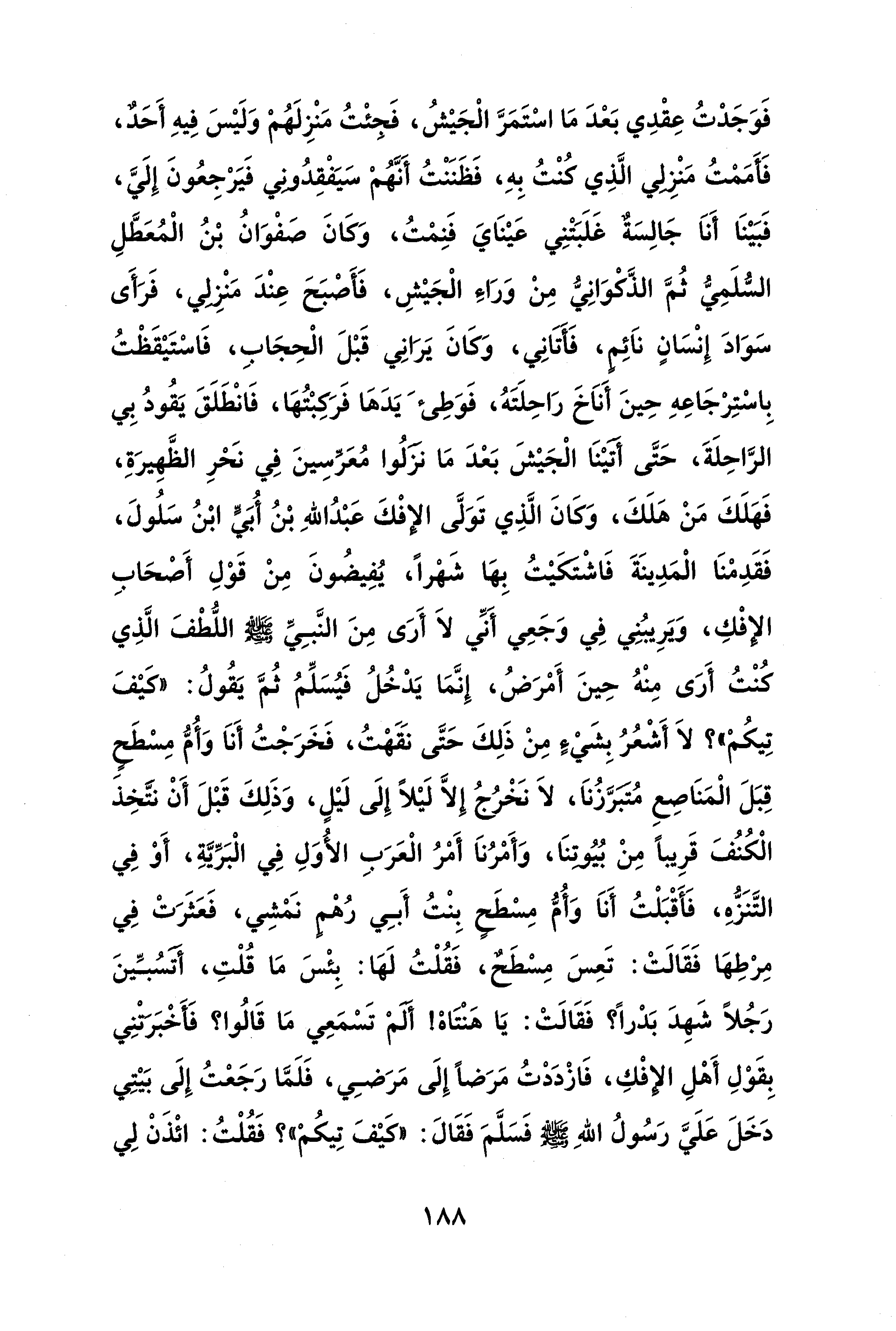 فَوَجَدْتُ عِقْدِي بَعْدَ مَا اسْتَمَرَّ الْجَيْشُ، فَجئْتُ مَنْزِلَهُمْ وَلَيْسَ فِيهِ أَحَدٌ، فَأَمَمْتُ مَنْزِلي الَّذِي كُنْتُ بِهِ، فَظَنَنْتُ أَنَّهُمْ سَيَفْقِدُونِي فَيَرْجِعُونَ إِلَيَّ، فَبَيْنَا أَنَا جَالِسَةٌ غَلَبَتْنِي عَيْنَايَ فَنِمْتُ، وَكَانَ صَفْوَانُ بْنُ الْمُعَطَّلِ السُّلَمِيُّ ثُمَّ الذَّكْوَانِيُّ مِنْ وَرَاءِ الْجَيْشِ، فَأَصْبَحَ عِنْدَ مَنْزِلِي، فَرَأَى سَوَادَ إِنْسَانٍ نائِمٍ، فَأَتَانِي، وَكَانَ يَرَانِي قَبْلَ الْحِجَابِ، فَاسْتَيْقَظْتُ بِاسْتِرْجَاعِهِ حِينَ أَنَاخَ رَاحِلَتَهُ، فَوَطِيءَ يَدَهَا فَرَكِبْتُهَا، فَانْطَلَقَ يَقُودُ بِي الرَّاحِلَةَ، حَتَّى أتيْنَا الْجَيْشَ بَعْدَ مَا نزلُوا مُعَرِّسِينَ في نَحْرِ الظَّهِيرَةِ، فَهَلَكَ مَنْ هَلَكَ، وَكَانَ الَّذِي تَوَلَّى الإفْكَ عَبْدُ اللهِ بْنُ أُبَيٍّ ابْنُ سَلُولَ، فَقَدِمْنَا الْمَدِينَةَ فَاشْتكَيْتُ بِهَا شَهْرًا، يُفِيضُونَ مِنْ قَوْلِ أَصْحَابِ الإفْكِ، وَيَرِيبُنِي في وَجَعِي أَنِّي لَا أَرَى مِنَ النَّبِيِّ - صلى الله عليه وسلم - اللُّطْفَ الَّذِي كُنْتُ أَرَى مِنْهُ حِينَ أَمْرَضُ، إِنَّمَا يدخلُ فَيُسَلِّمُ ثُمَّ يَقُولُ: "كيْفَ تِيكُمْ"؟ لَا أَشْعُرُ بِشَيْءٍ مِنْ ذَلِكَ حَتَّى نَقَهْتُ، فَخَرَجْتُ أَنَا وَأُمُّ مِسْطَحٍ قِبَلَ الْمَنَاصِعِ مُتبرَّزُنًا، لَا نَخْرُجُ إلا لَيْلًا إِلَى لَيْلٍ، وَذَلِكَ قَبْلَ أَنْ نتَّخِذ الْكُنُفَ قَرِيبًا مِنْ بُيُوتنَا، وَأَمْرُنَا أَمْرُ الْعَرَبِ الأُوَلِ في الْبَرِّيَّةِ، أَوْ في التَّنَزُّهِ، فَأَقْبَلْتُ أَنَا وَأُمُّ مِسْطَحِ بِنْتُ أَبِي رُهْمٍ نَمْشِي، فَعَثَرَتْ في مِرْطِهَا فَقَالَتْ: تَعِسَ مِسْطَحٌ، فَقُلْتُ لَهَا: بِئْسَ مَا قُلْتِ، أتسُبِّينَ رَجُلًا شَهِدَ بَدْرًا؟ فَقَالَتْ: يَا هَنْتَاهْ! أَلَمْ تَسْمَعِي مَا قَالُوا؟ فَأَخْبَرتْنِي بِقَوْلِ أَهْلِ الإِفْكِ، فَازْدَدْتُ مَرَضًا إِلَى مَرَضِي، فَلَمَّا رَجَعْتُ إِلَى بَيْتِي دَخَلَ عَلَيَّ رَسُولُ اللهِ - صلى الله عليه وسلم - فَسَلَّمَ فَقَالَ: "كَيْفَ تِيكُمْ"؟ فَقُلْتُ: ائْذَنْ لِي