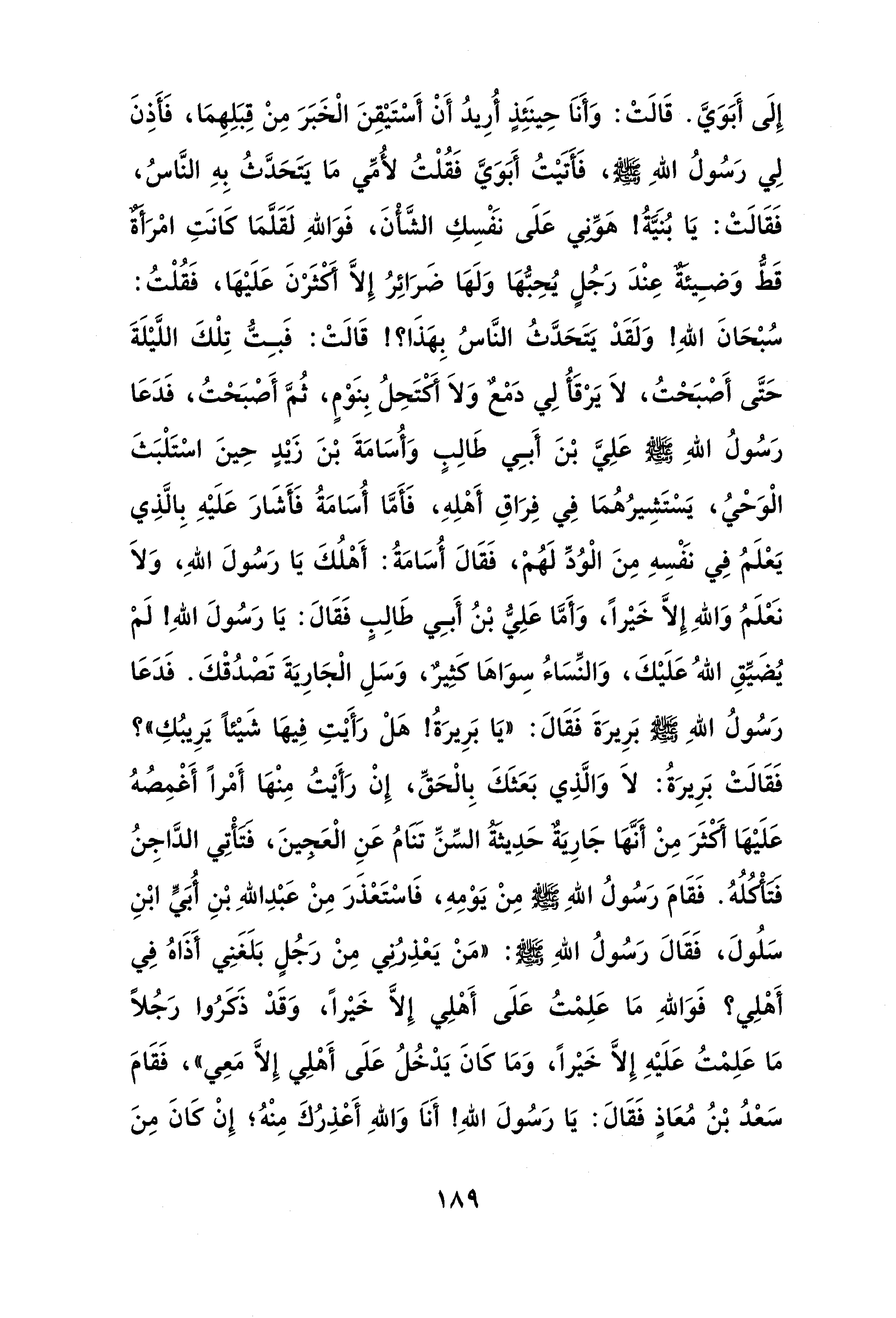 إِلَى أَبَوَيَّ. قَالَتْ: وَأَنا حِينَئِذٍ أُرِيدُ أَنْ أَسْتَيْقِنَ الْخَبَرَ مِنْ قِبَلِهِمَا، فَأَذِنَ لِي رَسُولُ اللهِ - صلى الله عليه وسلم -، فَأَتَيْتُ أَبَوَيَّ فَقُلْتُ لأمِّي مَا يَتَحَدَّثُ بِهِ النَّاسُ، فَقَالَتْ: يَا بُنَيَّةُ! هَوِّنِي عَلَى نَفْسِكِ الشَّأْنَ، فَوَاللهِ لَقَلَّمَا كَانَتِ امْرَأةٌ قَطُّ وَضِيئةٌ عِنْدَ رَجُلٍ يُحِبُّهَا وَلَهَا ضَرَائِرُ إلا أَكْثَرْنَ عَلَيْهَا، فَقُلْتُ: سُبْحَانَ اللهِ! وَلَقَدْ يَتَحَدَّثُ النَّاسُ بِهَذَا؟! قَالَتْ: فَبِتُّ تِلْكَ اللَّيْلَةَ حَتَّى أَصْبَحْتُ، لَا يَرْقَأُ لِي دَمْعٌ وَلَا أَكتَحِلُ بِنَوْمٍ، ثُمَّ أَصْبَحْتُ، فَدَعَا رَسُولُ اللهِ - صلى الله عليه وسلم - عَلِيَّ بْنَ أَبِي طَالِبٍ وَأُسَامَةَ بْنَ زيدٍ حِينَ استَلْبَثَ الْوَحْيُ، يَسْتَشِيرُهُمَا في فِرَاقِ أَهْلِهِ، فَأَمَّا أُسَامَةُ فَأَشَارَ عَلَيْهِ بِالَّذِي يَعْلَمُ في نَفْسِهِ مِنَ الْوُدِّ لَهُمْ، فَقَالَ أُسَامَةُ: أَهْلُكَ يَا رَسُولَ اللهِ، وَلَا نَعْلَمُ وَاللهِ إلا خَيْرًا، وَأَمَّا عَلِيُّ بْنُ أَبِي طَالِبٍ فَقَالَ: يَا رَسُولَ اللهِ! لَمْ يُضَيِّقِ اللهُ عَلَيْكَ، وَالنِّسَاءُ سِوَاهَا كثيرٌ، وَسَلِ الْجَارِيَةَ تَصْدُقْكَ. فَدَعَا رَسُولُ اللهِ - صلى الله عليه وسلم - بَرِيرَةَ فَقَالَ: "يَا بَرِيرَةُ" هَلْ رَأَيتِ فِيهَا شَيْئًا يَرِيبُكِ"؟ فَقَالَتْ بَرِيرَةُ: لَا وَالَّذِي بَعَثَكَ بِالْحَقِّ، إِنْ رَأَيْتُ مِنْهَا أَمْرًا أَغْمِصُهُ عَلَيْهَا أَكثَرَ مِنْ أَنَّهَا جَارِيَةٌ حَدِيثةُ السِّنِّ تَنَامُ عَنِ الْعَجينَ، فَتَأْتِي الدَّاجِنُ فَتَأْكُلُهُ. فَقَامَ رَسُولُ اللهِ - صلى الله عليه وسلم - مِنْ يَوْمِهِ، فَاسْتَعْذَرَ مِنْ عَبْدِ اللهِ بْنِ أُبَيٍّ ابْنِ سَلُولَ، فَقَالَ رَسُولُ اللهِ - صلى الله عليه وسلم -: "مَنْ يَعْذِرُنِي مِنْ رَجُلٍ بَلَغَنِي أَذَاهُ في أَهْلِي؟ فَوَاللهِ مَا عَلِمْتُ عَلَى أَهْلِي إلا خَيْرًا، وَقَدْ ذَكَرُوا رَجُلًا مَا عَلِمْتُ عَلَيْهِ إلا خَيْرًا، وَمَا كانَ يدخلُ عَلَى أَهْلِي إلا مَعِي"، فَقَامَ سَعْدُ بْنُ مُعَاذٍ فَقَالَ: يَا رَسُولَ اللهِ! أَنَا وَاللهِ أَعْذِرُكَ مِنْهُ؛ إِنْ كَانَ مِنَ