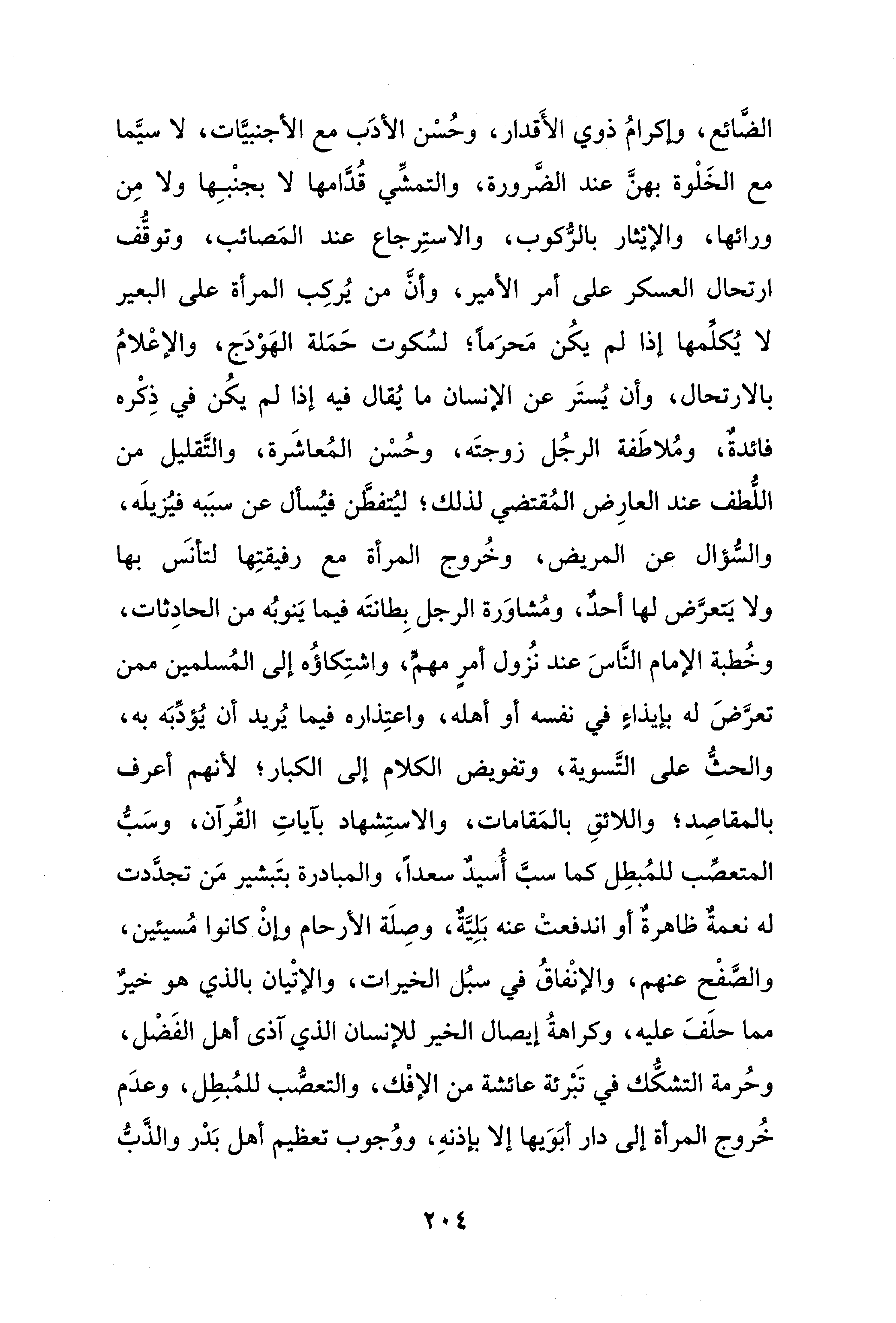 الضَّائع، وإكرامُ ذوي الأَقدار، وحُسْن الأَدَب مع الأجنبيَّات، لا سيَّما مع الخَلْوة بهنَّ عند الضَّرورة، والتمشِّي قُدَّامها لا بجنْبِها ولا مِن ورائها، والإيْثار بالرُّكوب، والاستِرجاع عند المَصائب، وتوقُّف ارتحال العسكر على أمر الأمير، وأنَّ من يُركِب المرأة على البعير لا يُكلِّمها إذا لم يكُن مَحرَمًا؛ لسُكوت حَمَلة الهَوْدَج، والإعْلامُ بالارتحال، وأن يُستَر عن الإنسان ما يُقال فيه إذا لم يكُن في ذِكْره فائدةٌ، ومُلاطَفة الرجُل زوجتَه، وحُسْن المُعاشَرة، والتَّقليل من اللُّطف عند العارِض المُقتضي لذلك؛ ليُتفطَّن فيُسأل عن سبَبه فيُزيلَه، والسُّؤال عن المريض، وخُروج المرأة مع رفيقتِها لتأنسَ بها ولا يَتعرَّض لها أحدٌ، ومُشاوَرة الرَّجل بِطانتَه فيما يَنوبُه من الحادِثات، وخُطبة الإِمام النَّاسَ عند نُزول أمرٍ مهمٍّ، واشتِكاؤُه إلى المُسلمين ممن تعرَّضَ له بإيذاءٍ في نفسه أو أهله، واعتِذاره فيما يُريد أن يُؤدِّبَه به، والحثُّ على التَّسوية، وتفويض الكلام إلى الكبار؛ لأنهم أعرف بالمقاصِد؛ واللائقِ بالمَقامات، والاستِشهاد بآياتِ القُرآن، وسَبُّ المتعصِّب للمُبطِل كما سبَّ أُسيدٌ سعدًا، والمبادرة بتَبشير مَن تجدَّدت له نعمةٌ ظاهرةٌ أو اندفعتْ عنه بَلِيَّةٌ، وصِلَة الأرحام وإنْ كانوا مُسيئين، والصَّفْح عنهم، والإنْفاقُ في سبُل الخيرات، والإتْيان بالذي هو خيرٌ مما حلَفَ عليه، وكراهةُ إيصال الخير للإنسان الذي آذى أهل الفَضْل، وحُرمة التشكُّك في تَبْرئة عائشة من الإفْك، والتعصُّب للمُبطِل، وعدَم خُروج المرأة إلى دار أبَوَيها إلَّا بإذنهِ، ووُجوب تعظيم أهل بَدْر والذَّبُّ