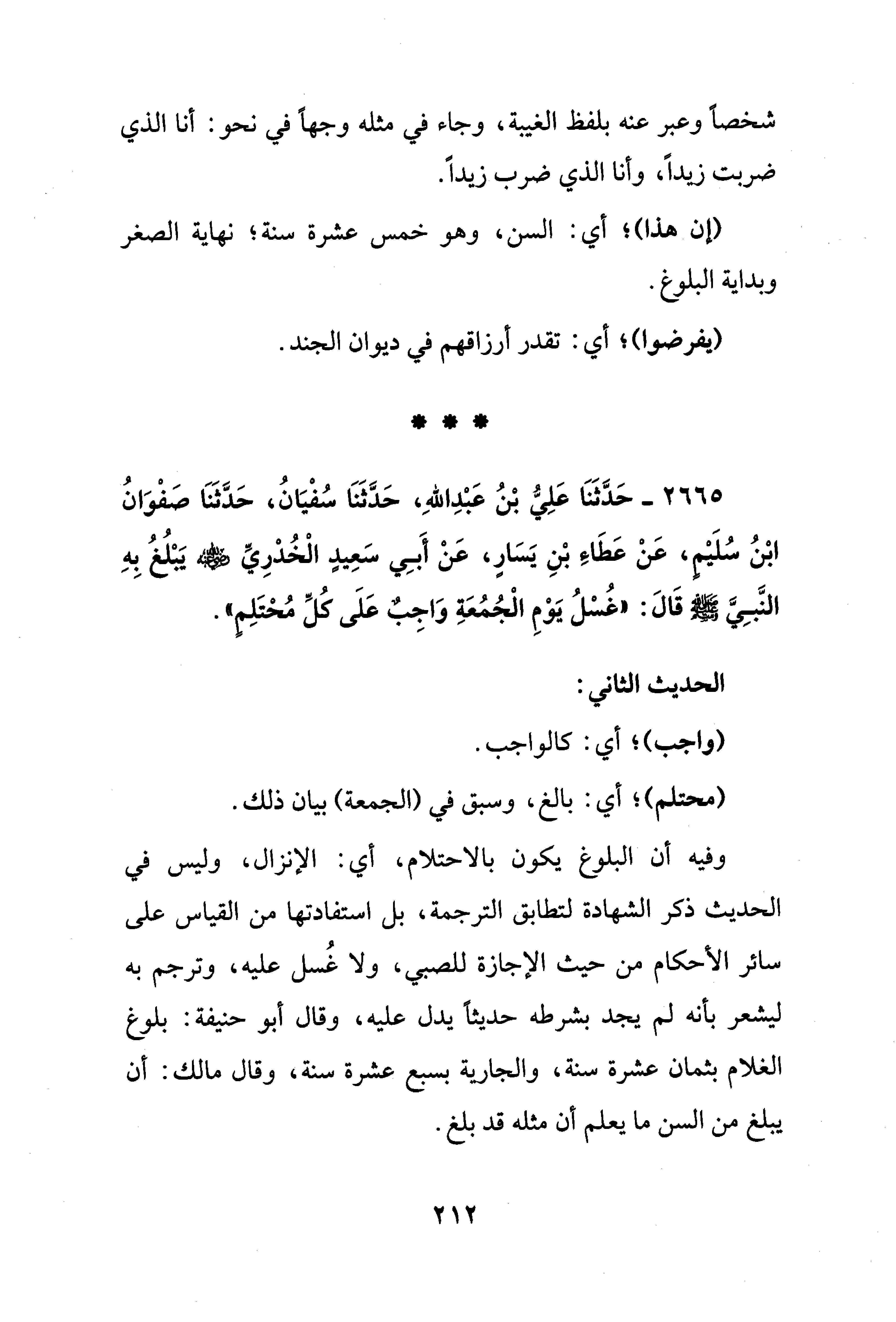 2665 - حَدَّثَنَا عَلِيُّ بْنُ عَبْدِ اللهِ، حَدَّثَنَا سُفْيَانُ، حَدَّثَنَا صَفْوَانُ ابْنُ سُلَيْمٍ، عَنْ عَطَاءِ بْنِ يَسَارٍ، عَنْ أَبِي سَعِيدٍ الْخُدْرِيِّ - رضي الله عنه - يَبْلُغُ بِهِ النَّبِيَّ - صلى الله عليه وسلم - قَالَ: "غُسْلُ يَوْمِ الْجُمُعَةِ وَاجِبٌ عَلَى كُلِّ مُحْتَلِمٍ".