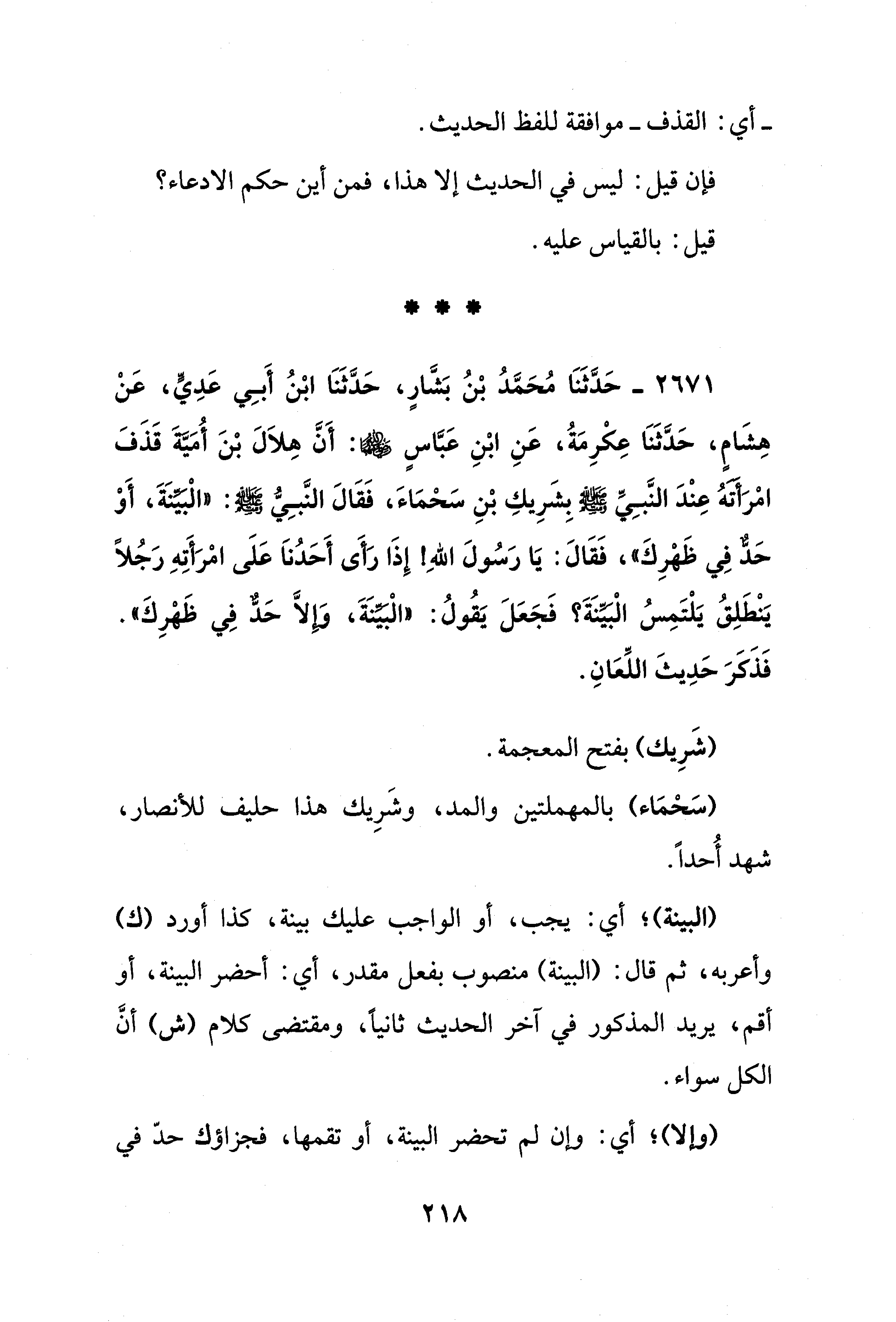 2671 - حَدَّثَنَا مُحَمَّدُ بْنُ بَشَّارٍ، حَدَّثَنَا ابْنُ أَبِي عَدِيٍّ، عَنْ هِشَامٍ، حَدَّثَنَا عِكْرِمَةُ، عَنِ ابْنِ عَبَّاسٍ - رضي الله عنهما -: أَنَّ هِلَالَ بْنَ أمُيَّةَ قَذَفَ امْرَأتهُ عِنْدَ النَّبِيِّ - صلى الله عليه وسلم - بِشَرِيكِ بْنِ سَحْمَاءَ، فَقَالَ النَّبِيُّ - صلى الله عليه وسلم -: "الْبيِّنَةَ، أَوْ حَدٌّ في ظَهْرِكَ"، فَقَالَ: يَا رَسُولَ اللهِ! إِذَا رَأَى أَحَدُنَا عَلَى امْرَأَتِهِ رَجُلًا يَنْطَلِقُ يَلْتَمِسُ الْبيِّنَةَ؟ فَجَعَلَ يَقُولُ: "الْبيِّنَةَ، وَإِلَّا حَدٌّ في ظَهْرِكَ". فَذَكَرَ حَدِيثَ اللِّعَانِ.