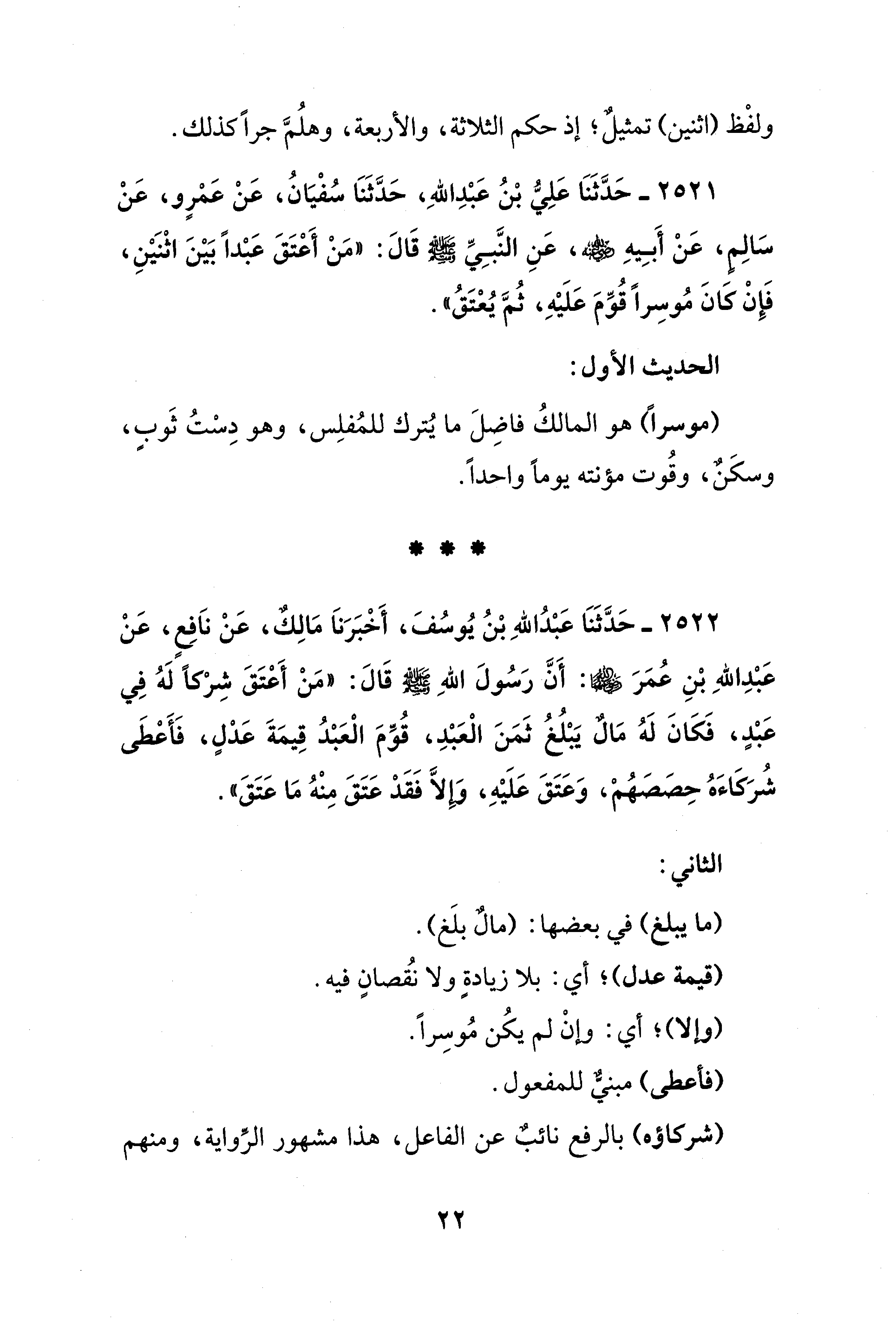 2522 - حَدَّثَنَا عَبْدُ اللهِ بْنُ يُوسُفَ، أَخْبَرَنَا مَالِكٌ، عَنْ ناَفِعٍ، عَنْ عَبْدِ اللهِ بْنِ عُمَرَ - رضي الله عنهما -: أَنَّ رَسُولَ الله - صلى الله عليه وسلم - قَالَ: "مَنْ أَعْتَقَ شِرْكًا لَهُ فِي عَبْدٍ، فَكَانَ لَهُ مَالٌ يَبْلُغُ ثَمَنَ الْعَبْدِ، قُوِّمَ الْعَبْدُ قِيمَةَ عَدْلٍ، فَأعْطَى شُرَكَاءَهُ حِصَصَهُمْ، وَعَتَقَ عَلَيْهِ، وإلَّا فَقَدْ عَتَقَ مِنْهُ مَا عَتَقَ".