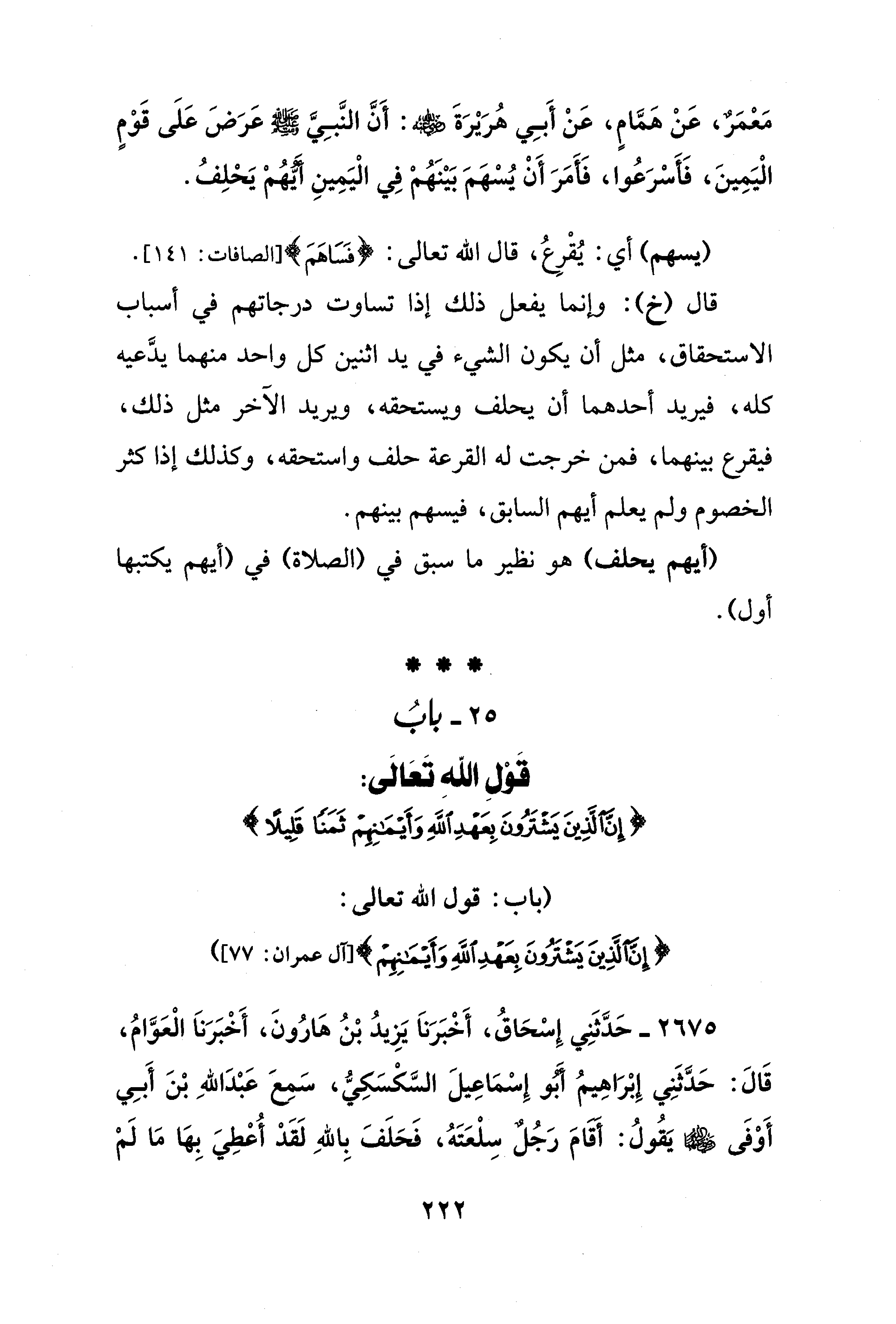 مَعْمَرٌ، عَنْ هَمَّامٍ، عَنْ أَبِي هُرَيْرَةَ - رضي الله عنه -: أَنَّ النَّبِيَّ - صلى الله عليه وسلم - عَرَضَ عَلَى قَوْمٍ الْيَمِينَ، فَأَسْرَعُوا، فَأَمَرَ أَنْ يُسْهَمَ بَيْنَهُمْ في الْيَمِينِ أَيُّهُمْ يَحْلِفُ.