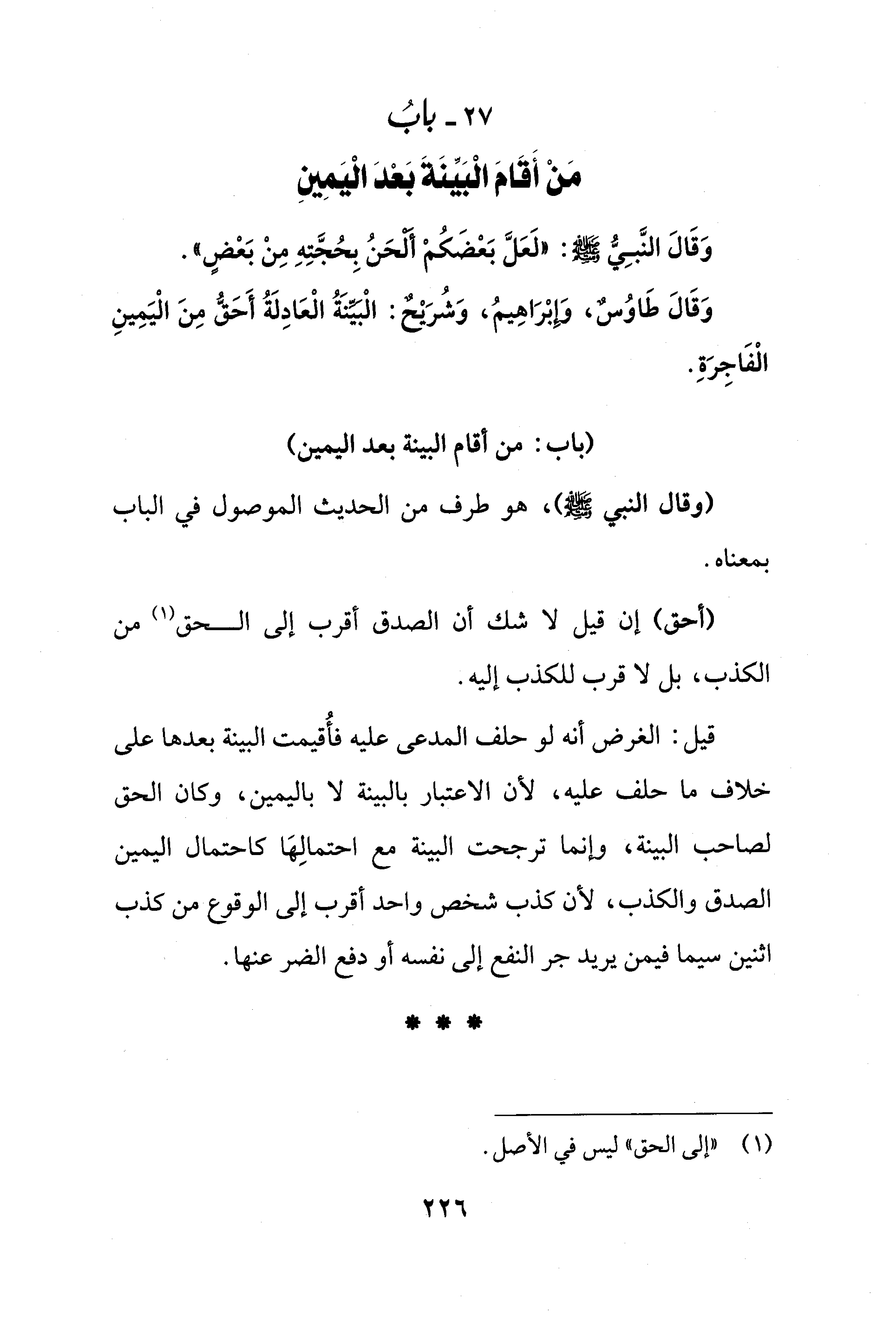 وَقَالَ النَّبِيُّ - صلى الله عليه وسلم -: "لَعَلَّ بَعْضَكُمْ أَلحَنُ بِحُجَّتِهِ مِنْ بَعْضٍ".
