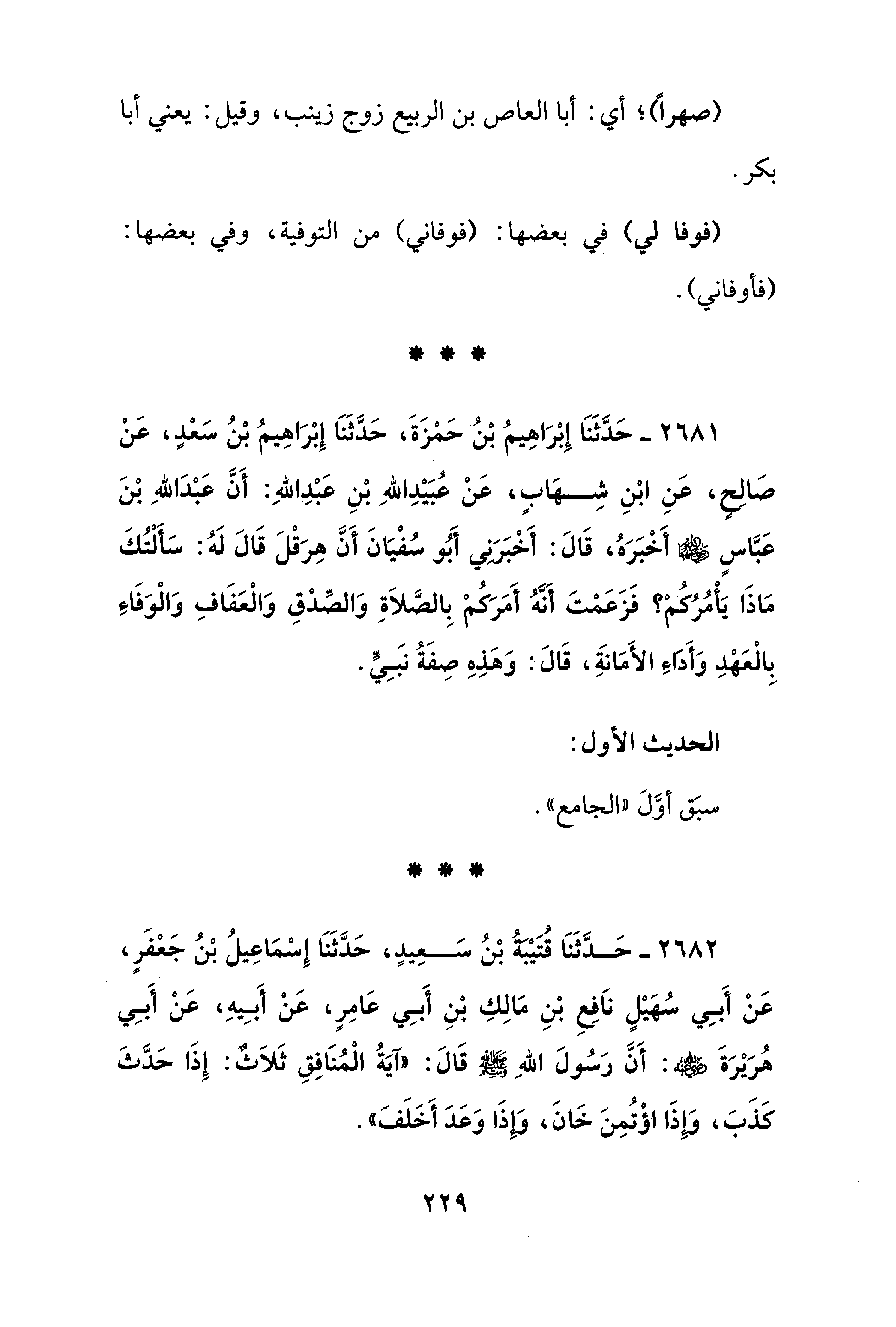2681 - حَدَّثَنَا إِبْرَاهِيمُ بْنُ حَمْزَةَ، حَدَّثَنَا إِبْرَاهِيمُ بْنُ سَعْدٍ، عَنْ صَالِحٍ، عَنِ ابْنِ شِهَابٍ، عَنْ عُبَيْدِ اللهِ بْنِ عَبْدِ اللهِ: أَنَّ عَبْدَ اللهِ بْنَ عَبَّاسٍ - رضي الله عنهما - أَخْبَرَهُ، قَالَ: أَخْبَرَنِي أَبُو سُفْيَانَ أَنَّ هِرَقْلَ قَالَ لَهُ: سَأَلْتُكَ مَاذَا يَأْمُرُكُمْ؟ فَزَعَمْتَ أَنَّهُ أَمَرَكُمْ بِالصَّلَاةِ وَالصِّدْقِ وَالْعَفَافِ وَالْوَفَاءِ بِالْعَهْدِ وَأَدَاءِ الأَمَانَةِ، قَالَ: وَهَذِهِ صِفَةُ نبَيٍّ.