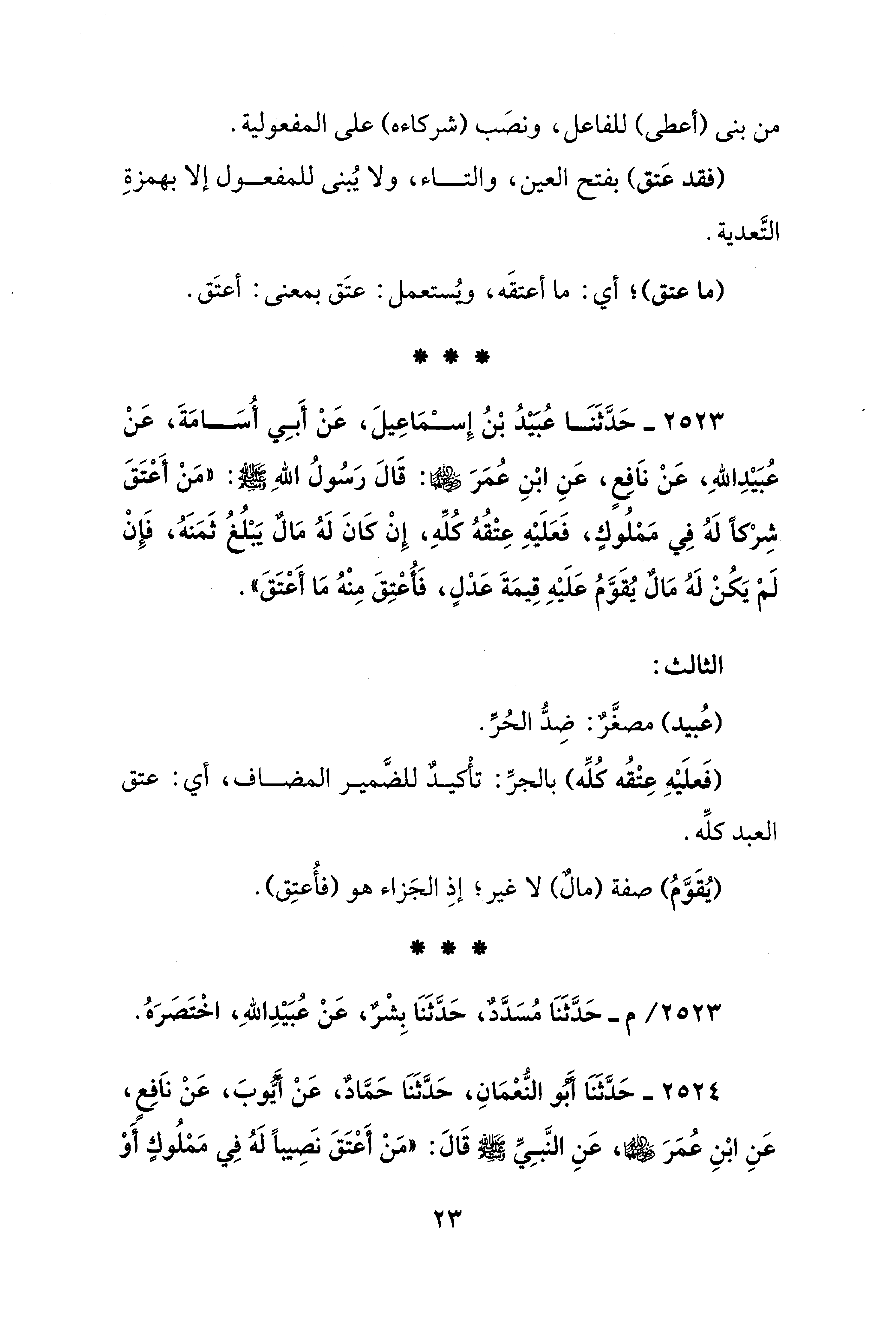 2523 - حَدَّثَنَا عُبَيْدُ بْنُ إِسْمَاعِيلَ، عَنْ أَبِي أُسَامَةَ، عَنْ عُبَيْدِ اللهِ، عَنْ نَافِعٍ، عَنِ ابْنِ عُمَرَ - رضي الله عنهما -: قَالَ رَسُولُ الله - صلى الله عليه وسلم -: "مَنْ أَعْتَقَ شِرْكًا لَهُ فِي مَمْلُوكٍ، فَعَلَيْهِ عِتْقُهُ كُلِّهِ، إِنْ كَانَ لَهُ مَال يَبْلُغُ ثَمَنَهُ، فَإِنْ لَمْ يَكُنْ لَهُ مَالٌ يُقَوَّمُ عَلَيْهِ قِيمَةَ عَدْلٍ، فَأُعْتِقَ مِنْهُ مَا أَعْتَقَ".