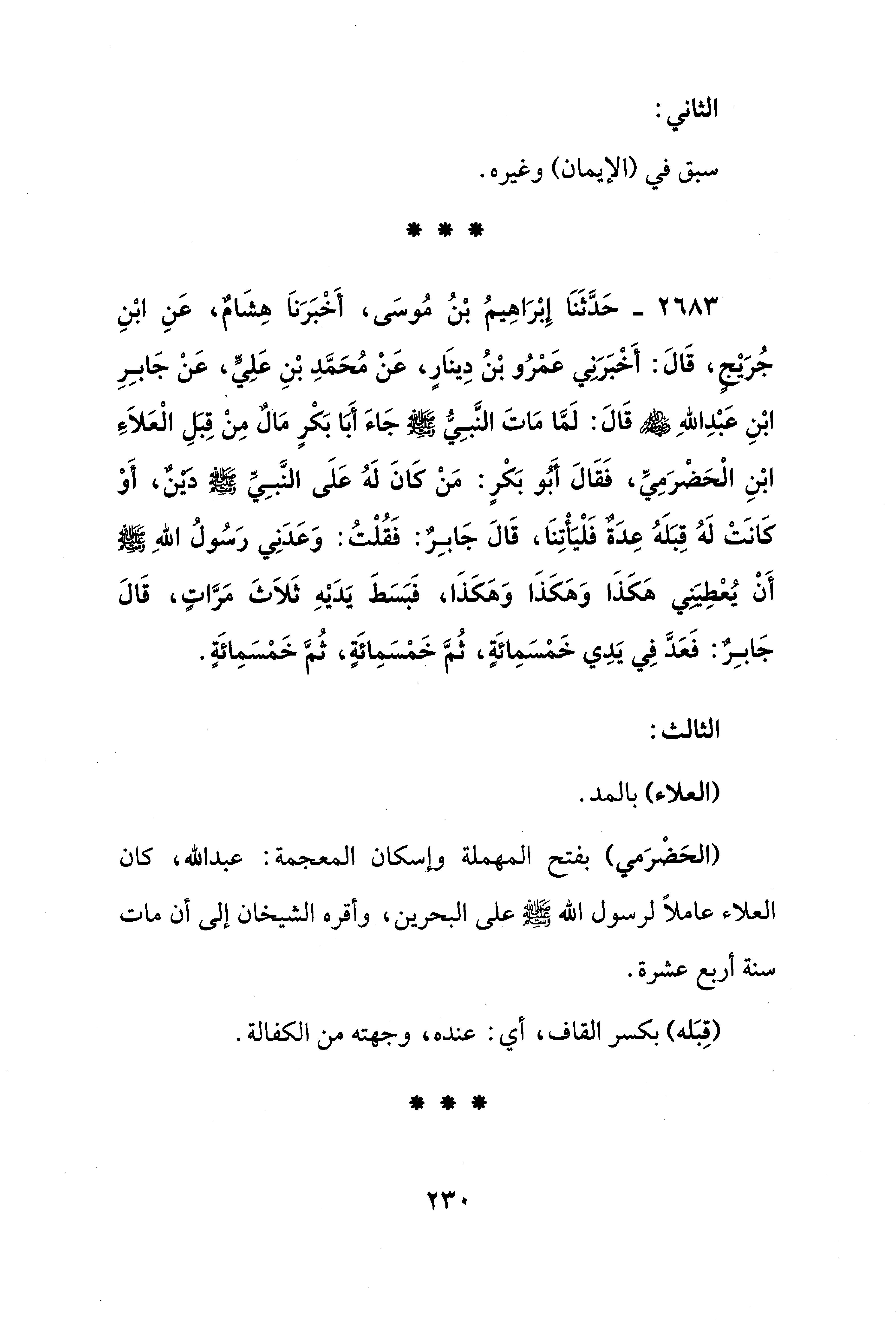 2683 - حَدَّثَنَا إِبْرَاهِيمُ بْنُ مُوسَى، أَخْبَرَنَا هِشَامٌ، عَنِ ابْنِ جُرَيْجٍ، قَالَ: أَخْبَرني عَمْرُو بْنُ دِينَارٍ، عَنْ مُحَمَّدِ بْنِ عَلِيٍّ، عَنْ جَابِرِ ابْنِ عَبْدِ اللهِ - رضي الله عنهم - قَالَ: لَمَّا مَاتَ النَّبِيُّ - صلى الله عليه وسلم - جَاءَ أَبَا بَكْرٍ مَالٌ مِنْ قِبَلِ الْعَلَاءِ ابْنِ الْحَضْرَمِيِّ، فَقَالَ أَبُو بَكْرٍ: مَنْ كَانَ لَهُ عَلَى النَّبِيِّ - صلى الله عليه وسلم - دينٌ، أَوْ كَانَتْ لَهُ قِبَلَهُ عِدَةٌ فَلْيَأْتِنَا، قَالَ جَابرٌ: فَقُلْتُ: وَعَدَنِي رَسُولُ اللهِ - صلى الله عليه وسلم - أَنْ يُعْطِيَني هَكَذَا وَهَكَذَا وَهَكَذَا، فَبَسَطَ يَدَيْهِ ثَلَاثَ مَرَّاتٍ، قَالَ جَابرٌ: فَعَدَّ في يَدِي خَمْسَمِائَةٍ، ثُمَّ خَمْسَمِائَةٍ، ثُمَّ خَمْسَمِائَةٍ.