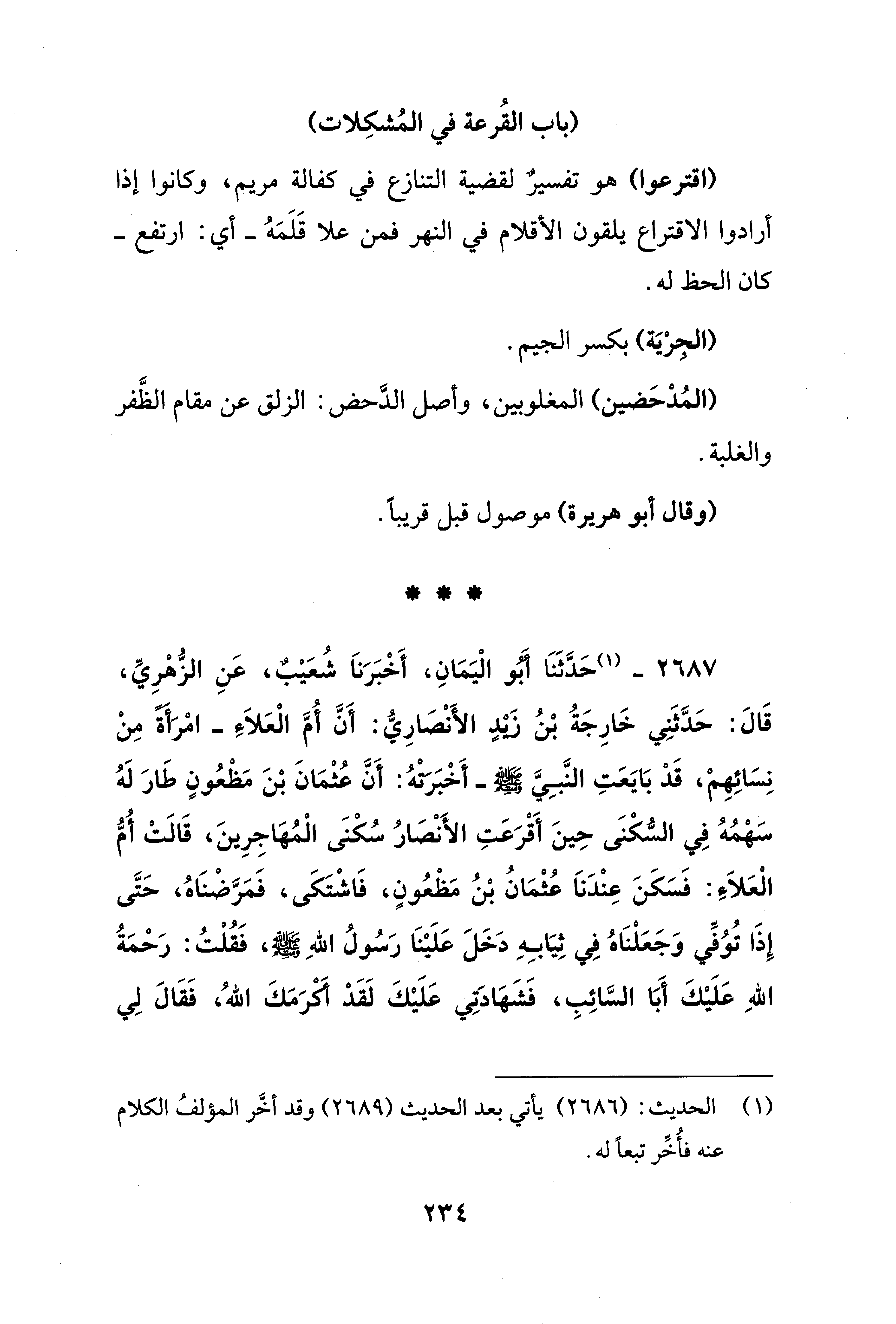 2687 - (¬1) حَدَّثَنَا أبُو الْيَمَانِ، أَخْبَرَنَا شُعَيْبٌ، عَنِ الزُّهْرِيِّ، قَالَ: حَدَّثَنِي خَارِجَةُ بْنُ زَيْدٍ الأَنْصَارِيّ: أَنَّ أُمَّ الْعَلاَءِ - امْرَأَةً مِنْ نِسَائِهِمْ، قَدْ بَايَعَتِ النَّبِيَّ - صلى الله عليه وسلم - أَخْبَرَتْهُ: أَنَّ عُثْمَانَ بْنَ مَظْعُونٍ طَارَ لَهُ سَهْمُهُ فِي السُّكْنَى حِينَ أَقْرَعَتِ الأَنْصَارُ سُكْنَى الْمُهَاجِرِينَ، قَالَتْ أُمّ الْعَلاَءِ: فَسَكَنَ عِنْدَناَ عُثْمَانُ بْنُ مَظْعُونٍ، فَاشْتَكَى، فَمَرَّضْنَاهُ، حَتَّى إِذَا تُوُفِّي وَجَعَلْنَاهُ فِي ثِيَابِهِ دَخَلَ عَلَيْنَا رَسُولُ اللهِ - صلى الله عليه وسلم -، فَقُلْتُ: رَحْمَةُ اللهِ عَلَيْكَ أَبَا السَّائِبِ، فَشَهَادتِي عَلَيْكَ لَقَدْ أكرَمَكَ اللهُ، فَقَالَ لِي