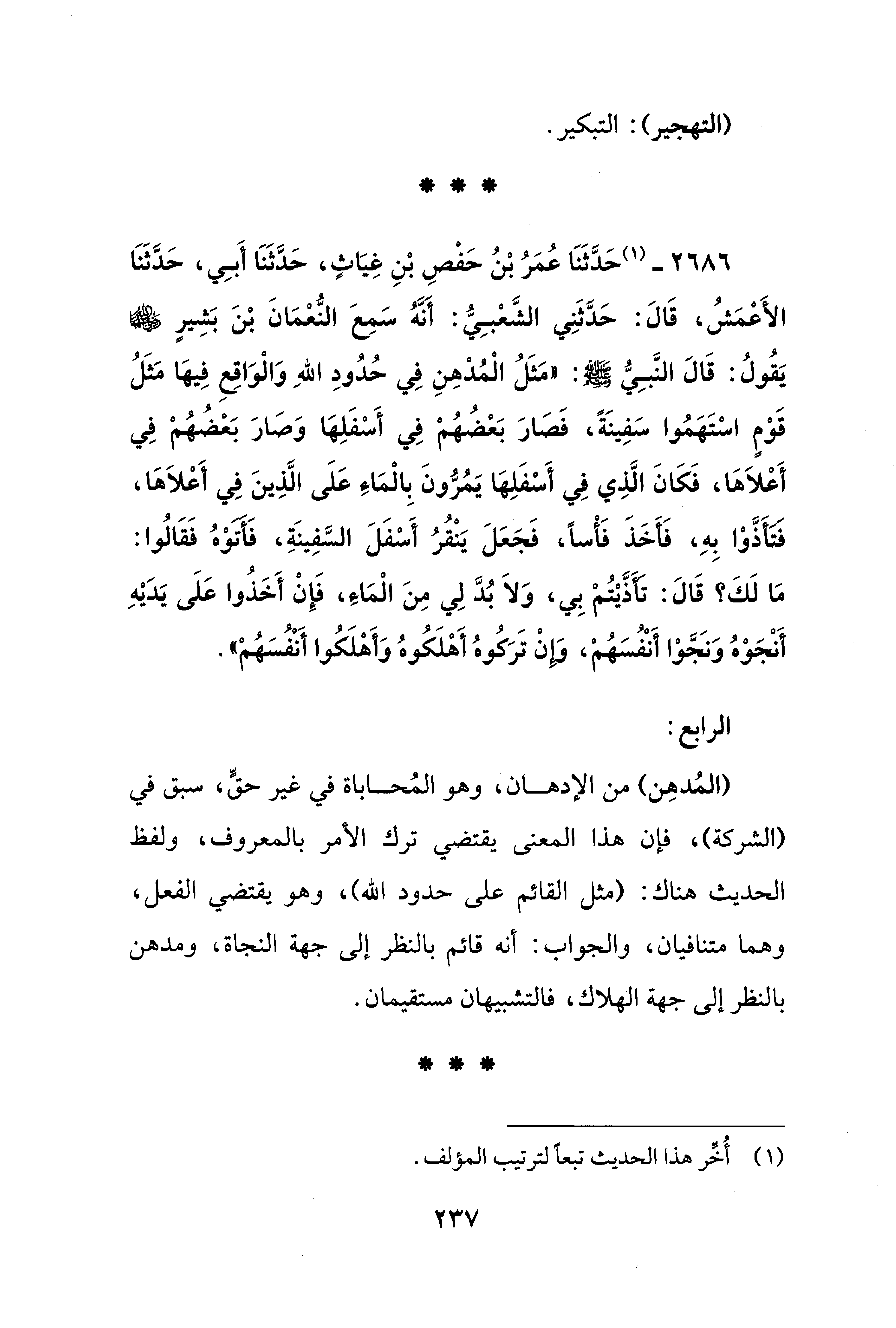 2686 - (¬1) حَدَّثَنَا عُمَرُ بْنُ حَفْصِ بْنِ غِيَاثٍ، حَدَّثَنَا أَبِي، حَدَّثَنَا الأَعْمَشُ، قَالَ: حَدَّثَنِي الشَّعْبِيُّ: أَنَّهُ سَمِعَ النُّعْمَانَ بْنَ بَشِيرٍ - رضي الله عنهما - يَقُولُ: قَالَ النَّبِيُّ - صلى الله عليه وسلم -: "مَثَلُ الْمُدْهِنِ فِي حُدُودِ اللهِ وَالْوَاقِعِ فِيهَا مَثَلُ قَوْمٍ اسْتَهَمُوا سَفِينَةً، فَصَارَ بَعْضُهُمْ فِي أَسْفَلِهَا وَصَارَ بَعْضُهُمْ فِي أَعْلاَهَا، فَكَانَ الَّذِي فِي أَسْفَلِهَا يَمُرُّونَ بِالْمَاءِ عَلَى الَّذِينَ فِي أَعْلاَهَا، فتأَذَّوْا بِهِ، فَأخَذَ فَأسًا، فَجَعَلَ يَنْقُرُ أَسْفَلَ السَّفِينَةِ، فَأَتَوْهُ فَقَالُوا: مَا لَكَ؟ قَالَ: تَأَذَّيْتُمْ بِي، وَلاَ بُدَّ لِي مِنَ الْمَاءِ، فَإِنْ أَخَذُوا عَلَى يَدَيْهِ أَنْجَوْهُ وَنَجَّوْا أَنْفُسَهُمْ، وإنْ تَرَكُوهُ أَهْلَكُوهُ وَأَهْلَكُوا أَنْفُسَهُمْ".