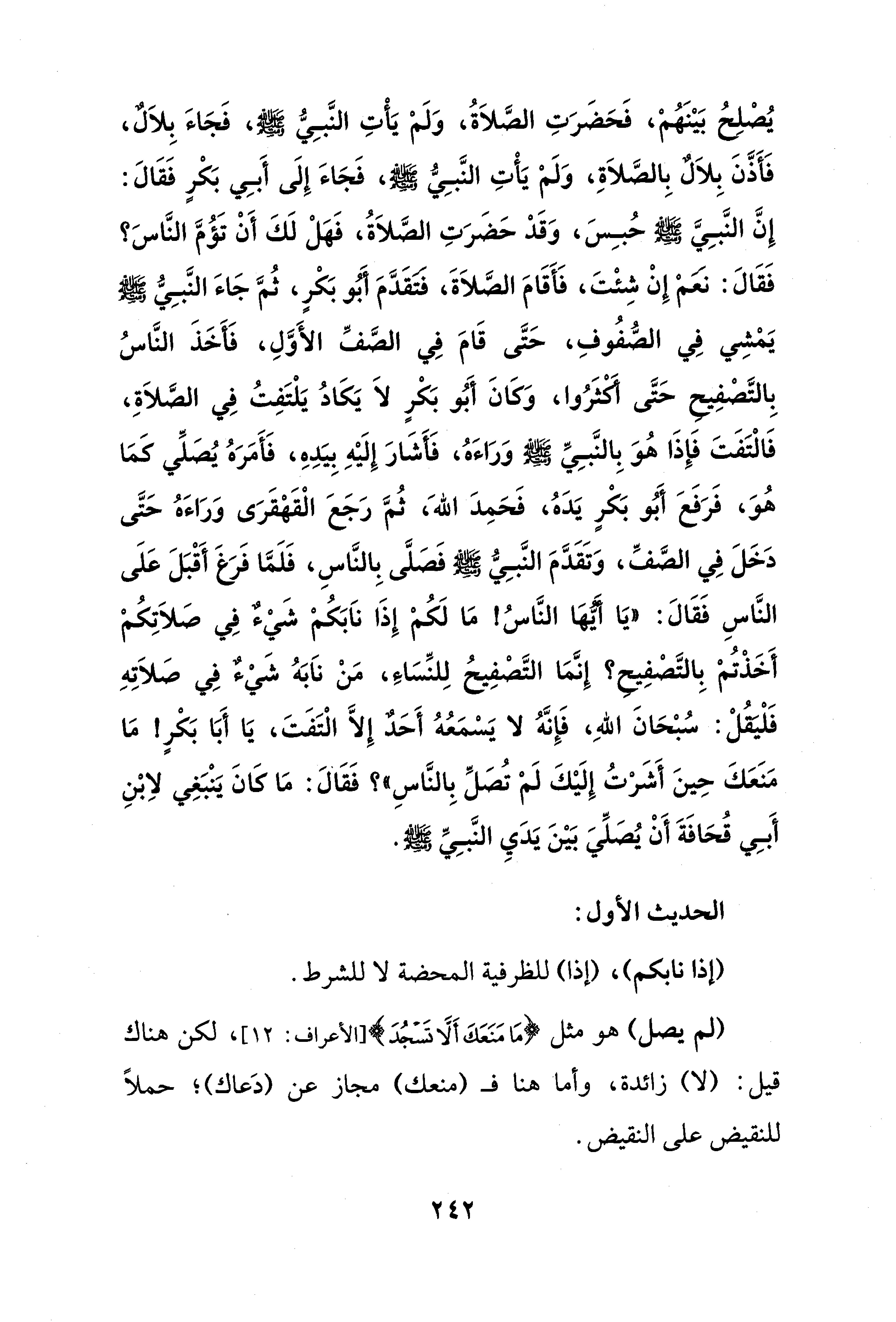 يُصْلِحُ بَيْنَهُمْ، فَحَضَرَتِ الصَّلاَةُ، وَلَمْ يَأتِ النَّبِيُّ - صلى الله عليه وسلم -، فَجَاءَ بِلاَلٌ، فَأَذَّنَ بِلاَلٌ بِالصَّلاَةِ، وَلَمْ يَأتِ النَّبِيُّ - صلى الله عليه وسلم -، فَجَاءَ إِلَى أَبِي بَكْرٍ فَقَالَ: إِنَّ النَّبِيَّ - صلى الله عليه وسلم - حُبِسَ، وَقَدْ حَضَرَتِ الصَّلاَةُ، فَهَلْ لَكَ أَنْ تَؤُمَّ النَّاسَ؟ فَقَالَ: نعمْ إِنْ شِئْتَ، فَأَقَامَ الصَّلاَةَ، فتقَدَّمَ أَبُو بَكْرٍ، ثُمَّ جَاءَ النَّبِيُّ - صلى الله عليه وسلم - يَمْشِي فِي الصُّفُوفِ، حَتَّى قَامَ فِي الصَّفِّ الأَوَّلِ، فَأخَذَ النَّاسُ بِالتَّصْفِيح حَتَّى أكثَرُوا، وَكَانَ أَبُو بَكْرٍ لاَ يَكَادُ يَلْتَفِتُ فِي الصَّلاَةِ، فَالْتَفَتَ فَإِذَا هُوَ بِالنَّبِيِّ - صلى الله عليه وسلم - وَرَاءَهُ، فَأَشَارَ إِلَيْهِ بِيَدِهِ، فَأمَرَهُ يُصَلِّي كمَا هُوَ، فَرَفَعَ أبُو بَكْرٍ يَدَهُ، فَحَمِدَ الله، ثُمَّ رَجَعَ الْقَهْقَرَى وَرَاءَهُ حَتَّى دَخَلَ فِي الصَّفِّ، وَتَقَدَّمَ النَّبِيُّ - صلى الله عليه وسلم - فَصَلَّى بِالنَّاسِ، فَلَمَّا فَرَغَ أَقْبَلَ عَلَى النَّاسِ فَقَالَ: "يَا أَيُّها النَّاسُ! مَا لَكُمْ إِذَا ناَبَكُمْ شَيْءٌ فِي صَلاَتِكُمْ أَخَذْتُمْ بِالتَّصْفِيح؟ إِنَّمَا التَّصْفِيحُ لِلنِّسَاءِ، مَنْ ناَبَهُ شَيْءٌ فِي صَلاَتِهِ فَلْيَقُلْ: سُبْحَانَ اللهِ، فَإِنَّهُ لا يَسْمَعُهُ أَحَدٌ إِلَّا الْتَفَتَ، يَا أَبَا بَكْرٍ! مَا مَنَعَكَ حِينَ أَشَرْتُ إِلَيْكَ لَمْ تُصَلِّ بِالنَّاسِ"؟ فَقَالَ: مَا كَانَ يَنْبَغِي لاِبْنِ أَبِي قُحَافَةَ أَنْ يُصَلِّيَ بَيْنَ يَدَيِ النَّبِيِّ - صلى الله عليه وسلم -.