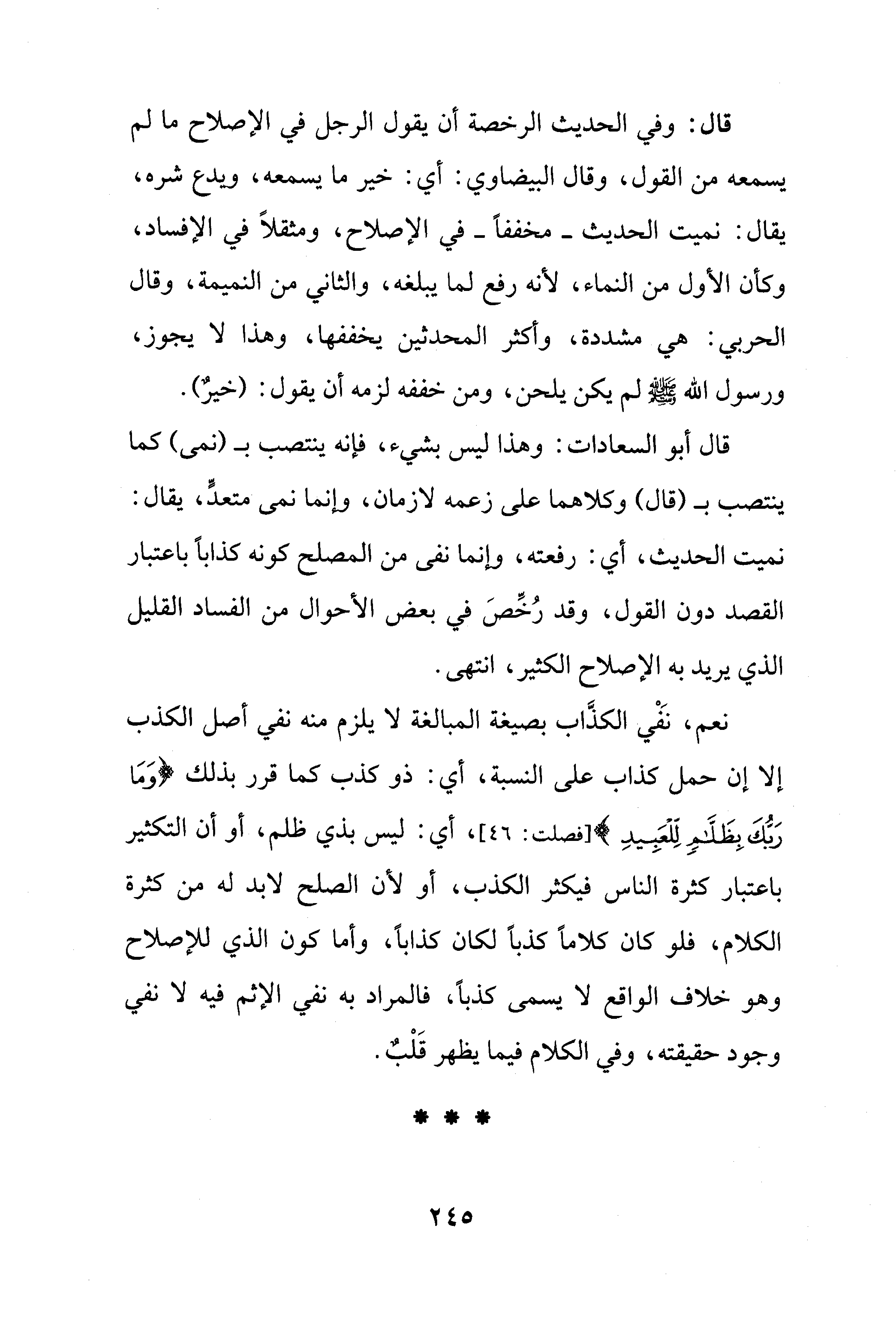 قال أبو السعادات: وهذا ليس بشيء، فإنه ينتصب بـ (نمى) كما ينتصب بـ (قال) وكلاهما على زعمه لازمان، وإنما نمى متعدٍّ، يقال: نميت الحديث، أي: رفعته، وإنما نفى من المصلح كونه كذابًا باعتبار القصد دون القول، وقد رُخِّصَ في بعض الأحوال من الفساد القليل الذي يريد به الإصلاح الكثير، انتهى.
