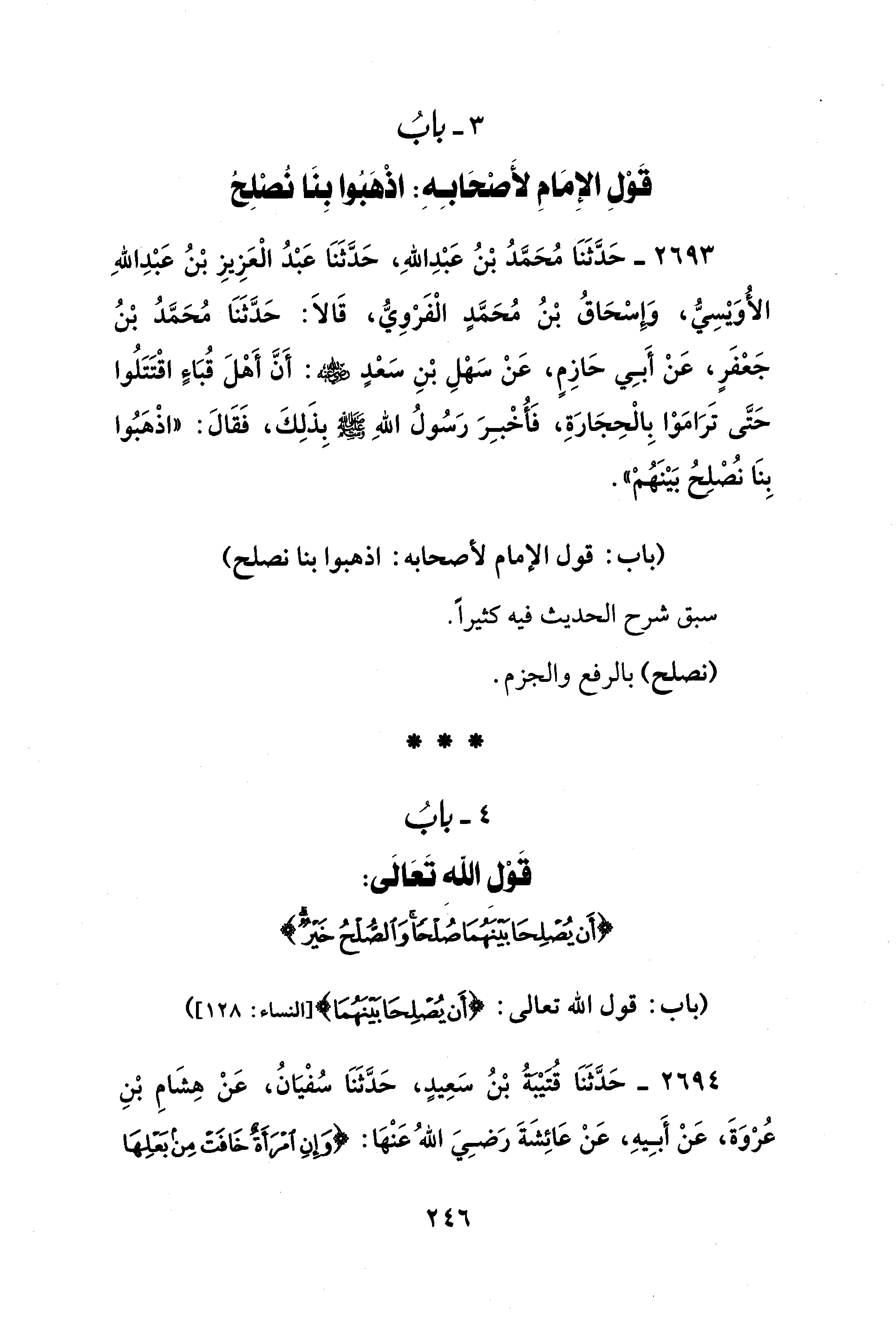 4 - بابُ قَوْل الله تَعَالَى: {أَنْ يُصْلِحَا بَيْنَهُمَا صُلْحًا وَالصُّلْحُ خَيْرٌ}