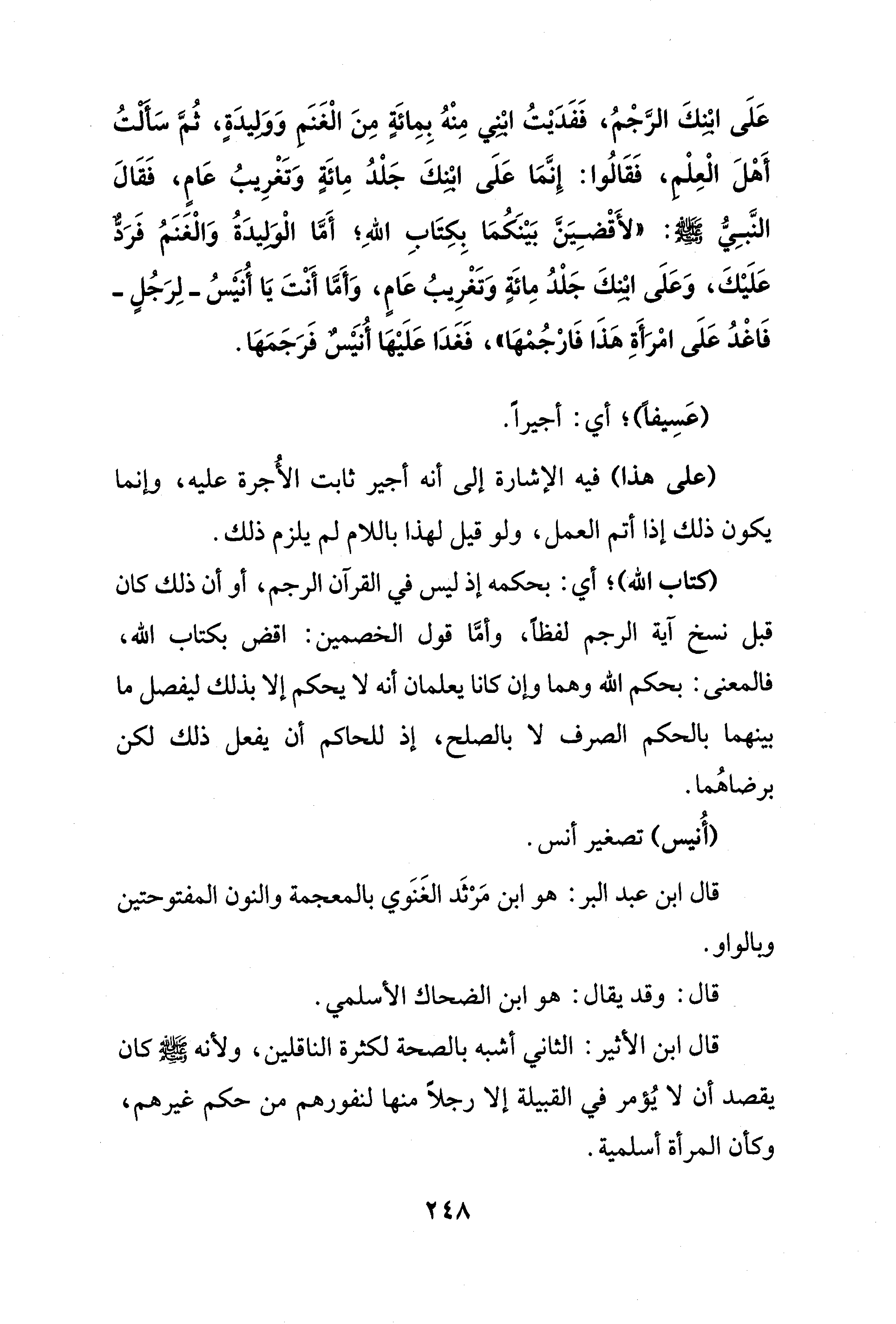 عَلَى ابْنِكَ الرَّجْمُ، فَفَدَيْتُ ابْني مِنْهُ بِمِائَةٍ مِنَ الْغَنَم وَوَليدَةٍ، ثُمَّ سَألتُ أَهْلَ الْعِلْم، فَقَالُوا: إِنَّمَا عَلَى ابنكَ جَلْدُ مِائَةٍ وَتَغْرِيبُ عَامٍ، فَقَالَ النَّبِيُّ - صلى الله عليه وسلم -: "لأَقْضِيَنَّ بَيْنَكُمَا بِكِتَابِ اللهِ؛ أَمَّا الْوَليدَةُ وَالْغَنَمُ فَرَدٌّ عَلَيْكَ، وَعَلَى ابنكَ جَلْدُ مِائَةٍ وَتَغْرِيبُ عَامٍ، وَأَمَّا أَنْتَ يَا أُنيسُ -لِرَجُلٍ- فَاغْدُ عَلَى امْرَأَةِ هَذَا فَارْجُمْهَا"، فَنَدَا عَلَيْهَا أُنيسٌ فَرَجَمَهَا.