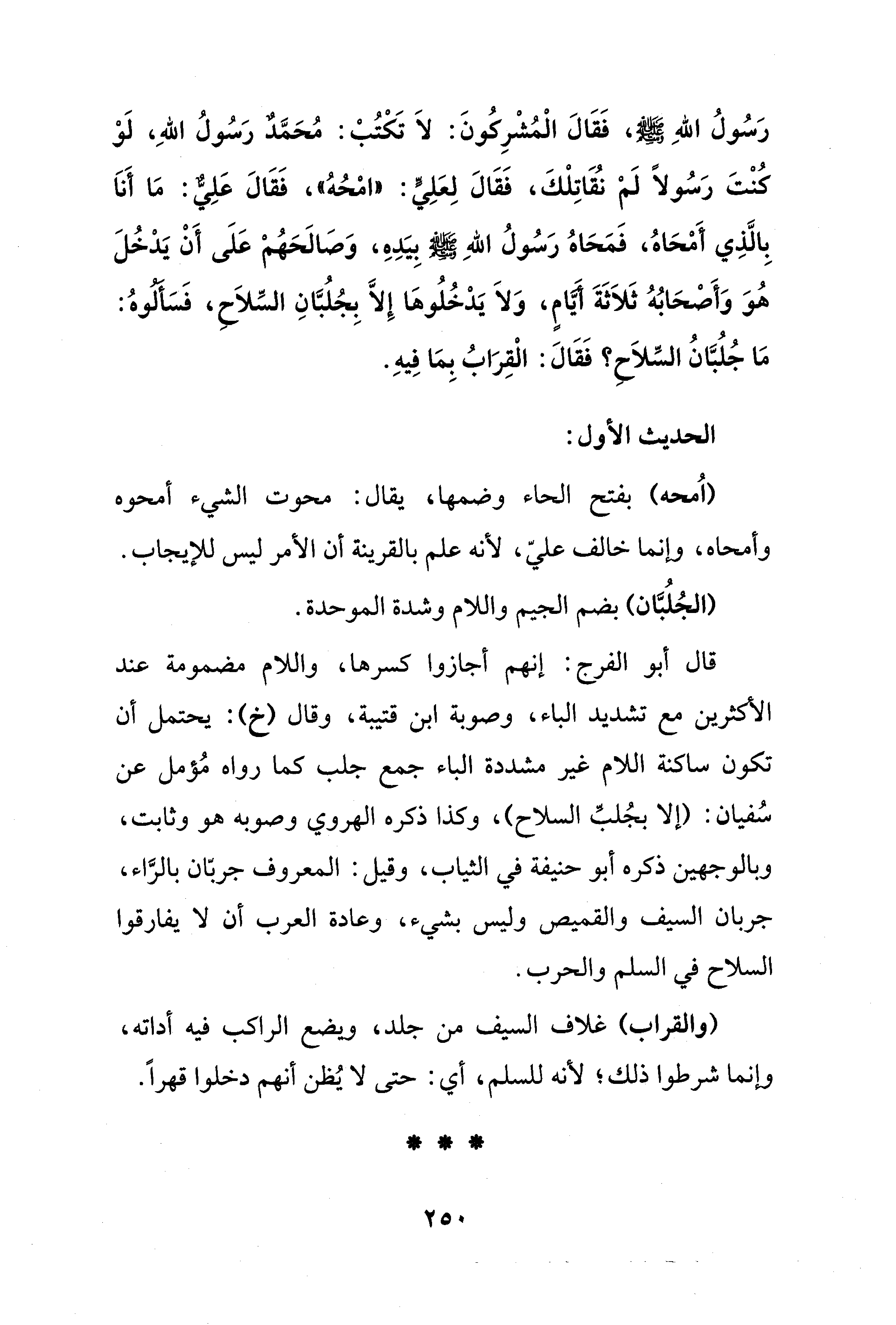 رَسُولُ اللهِ - صلى الله عليه وسلم -، فَقَالَ الْمُشْرِكُونَ: لاَ تَكْتُبْ: مُحَمَّدٌ رَسولُ اللهِ، لَوْ كُنْتَ رَسُولًا لَمْ نُقَاتِلْكَ، فَقَالَ لِعَلِيٍّ: "امْحُهُ"، فَقَالَ عَلِيٌّ: مَا أَناَ بِالَّذِي أَمْحَاهُ، فَمَحَاهُ رَسُولُ اللهِ - صلى الله عليه وسلم - بِيَدهِ، وَصَالَحَهُمْ عَلَى أَنْ يَدْخُلَ هُوَ وَأَصْحَابُهُ ثَلاَثَةَ أيَّامٍ، وَلاَ يَدْخُلُوهَا إِلَّا بِجُلُبَّانِ السِّلاَحِ، فَسَألوهُ: مَا جُلُبَّانُ السِّلاَح؟ فَقَالَ: الْقِرَابُ بِمَا فِيهِ.