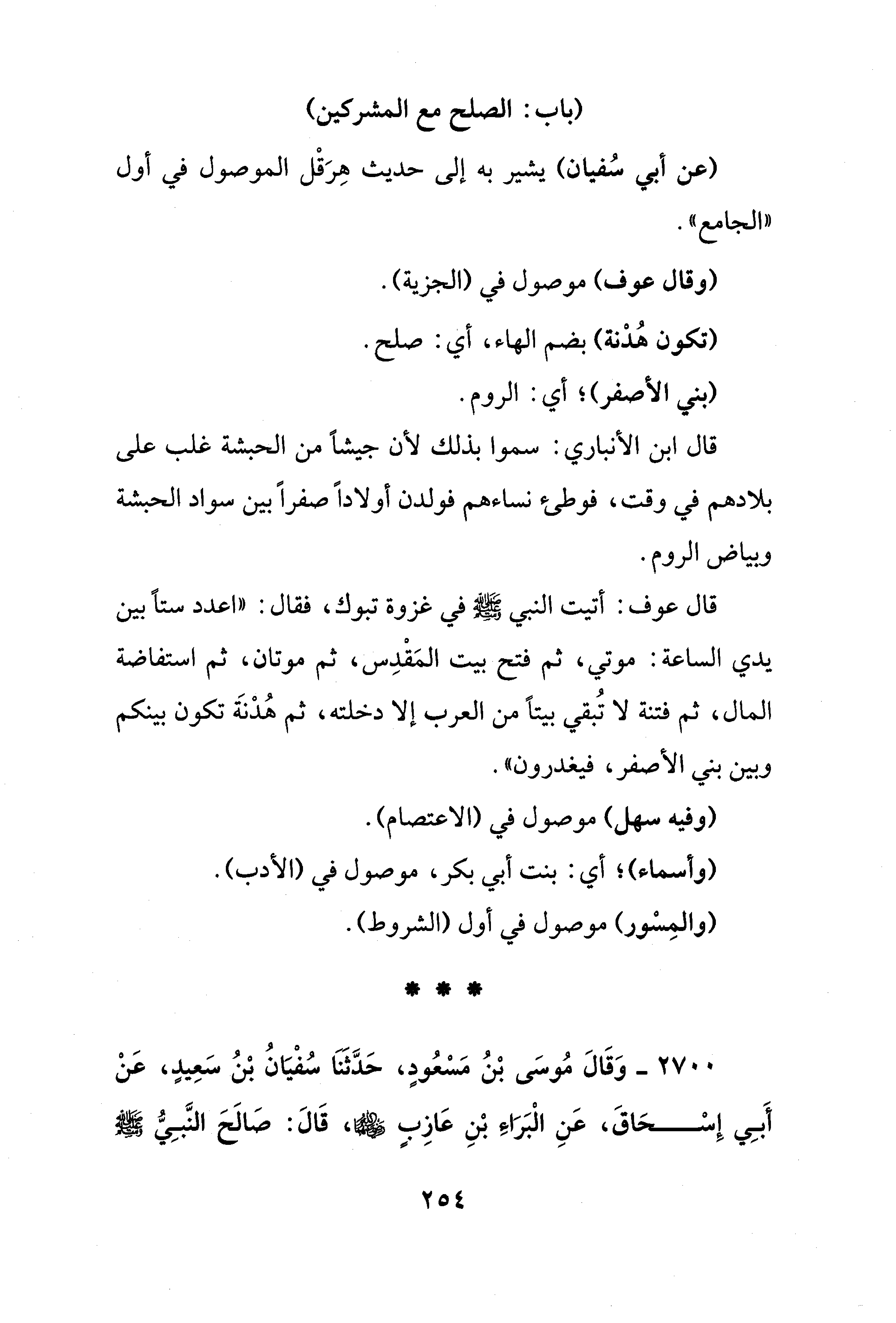 2700 - وَقَالَ مُوسَى بْنُ مَسْعُودٍ، حَدَّثَنَا سُفْيَانُ بْنُ سَعِيدٍ، عَنْ أَبِي إِسْحَاقَ، عَنِ الْبَرَاءِ بْنِ عَازِبٍ، قَالَ: صَالَحَ النَّبِيُّ - صلى الله عليه وسلم -