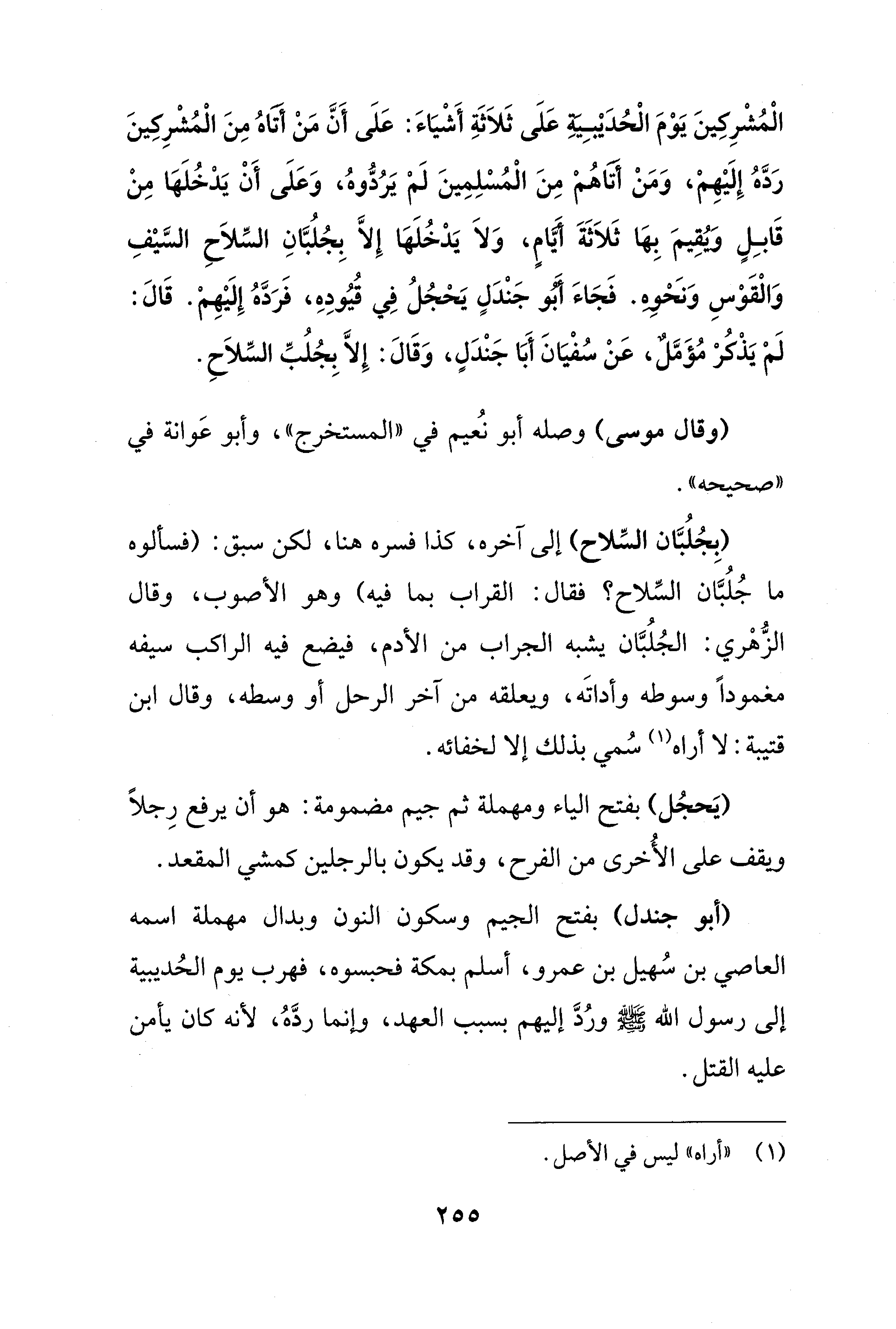 الْمُشْرِكينَ يَوْمَ الْحُدَيْبِيةِ عَلَى ثَلاَثَةِ أَشْيَاءَ: عَلَى أَنَّ مَنْ أتاهُ مِنَ الْمُشْرِكينَ رَدَّهُ إِلَيْهِمْ، وَمَنْ أتاهُمْ مِنَ الْمُسْلِمِينَ لَمْ يَرُدُّوهُ، وَعَلَى أَنْ يَدْخُلَهَا مِنْ قَابِلٍ ويقِيمَ بِهَا ثَلاَثَةَ أيَّامٍ، وَلاَ يَدْخُلَهَا إِلَّا بِجُلُبَّانِ السِّلاَحِ السَّيْفِ وَالْقَوْسِ وَنَحْوِه. فَجَاءَ أبو جَنْدَلٍ يَحْجُلُ فِي قُيُودِهِ، فَرَدَّهُ إِلَيْهِمْ. قَالَ: لَمْ يَذْكُرْ مُؤَمَّلٌ، عَنْ سُفْيَانَ أَبَا جَنْدَلٍ، وَقَالَ: إِلَّا بِجُلُبِّ السِّلاَح.