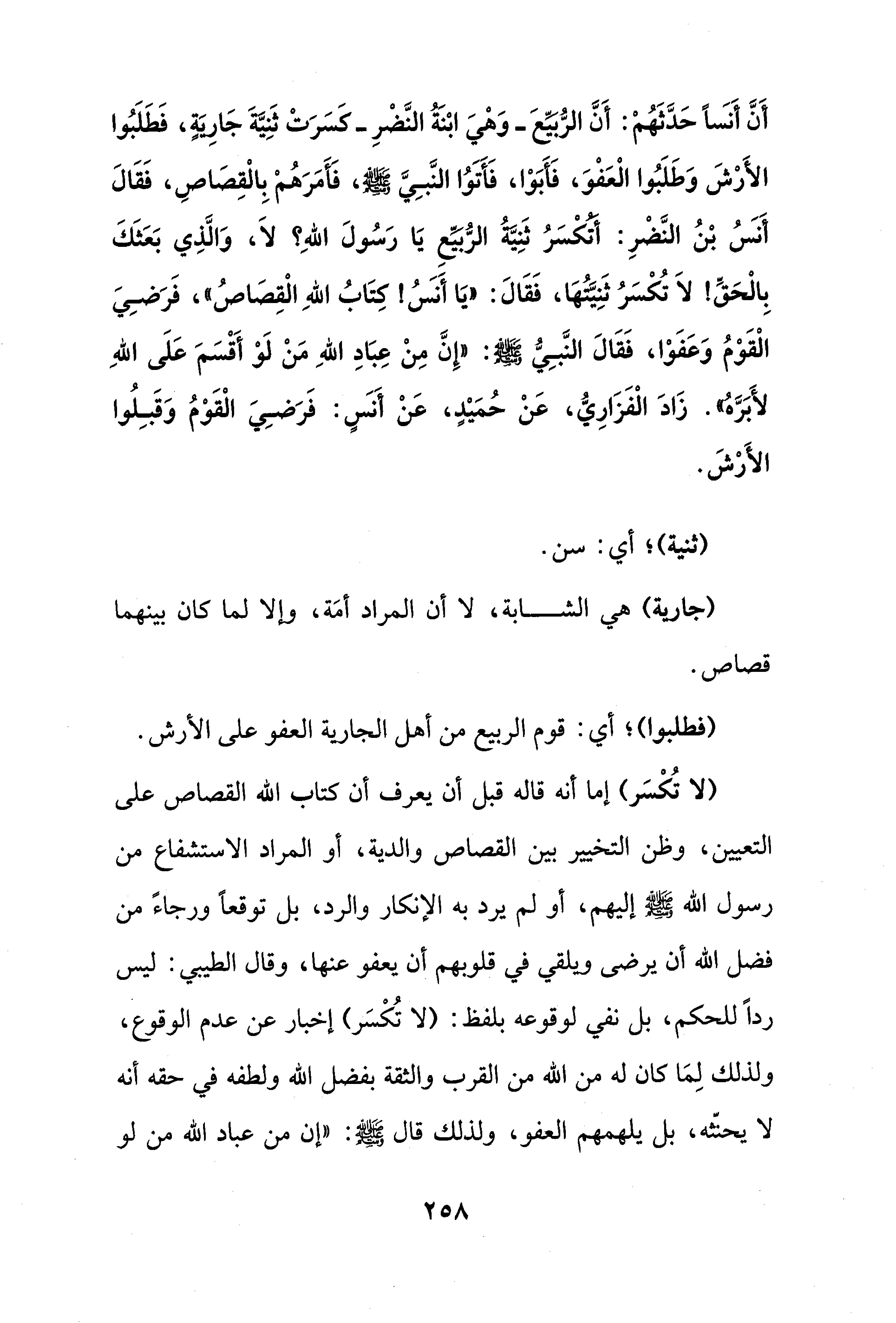 أَنَّ أَنَسًا حَدَّثَهُمْ: أَنَّ الرُّبَيِّعَ -وَهْيَ ابْنَةُ النَّضْرِ- كَسَرَتْ ثَنِيَّةَ جَارِيَةٍ، فَطَلَبُوا الأَرْشَ وَطَلَبُوا الْعَفْوَ، فَأَبَوْا، فَأَتَوُا النَّبِيَّ - صلى الله عليه وسلم -، فَأمَرَهُمْ بِالْقِصَاصِ، فَقَالَ أَنسُ بْنُ النَّضْرِ: أتكْسَرُ ثَنِيَّةُ الرُّبَيِّعِ يَا رَسُولَ اللهِ؟ لاَ، وَالَّذِي بَعَثَكَ بِالْحَقِّ! لاَ تُكْسَرُ ثَنِيَّتُهَا، فَقَالَ: "يَا أَنسُ! كِتَابُ اللهِ الْقِصَاصُ"، فَرَضِيَ الْقَوْمُ وَعَفَوْا، فَقَالَ النَّبِيُّ - صلى الله عليه وسلم -: "إِنَّ مِنْ عِبَادِ اللهِ مَنْ لَوْ أَقْسَمَ عَلَى اللهِ لأَبَرَّه". زَادَ الْفَزَارِيُّ، عَنْ حُمَيْدٍ، عَنْ أَنسٍ: فَرَضِيَ الْقَوْمُ وَقَبِلُوا الأَرْشَ.